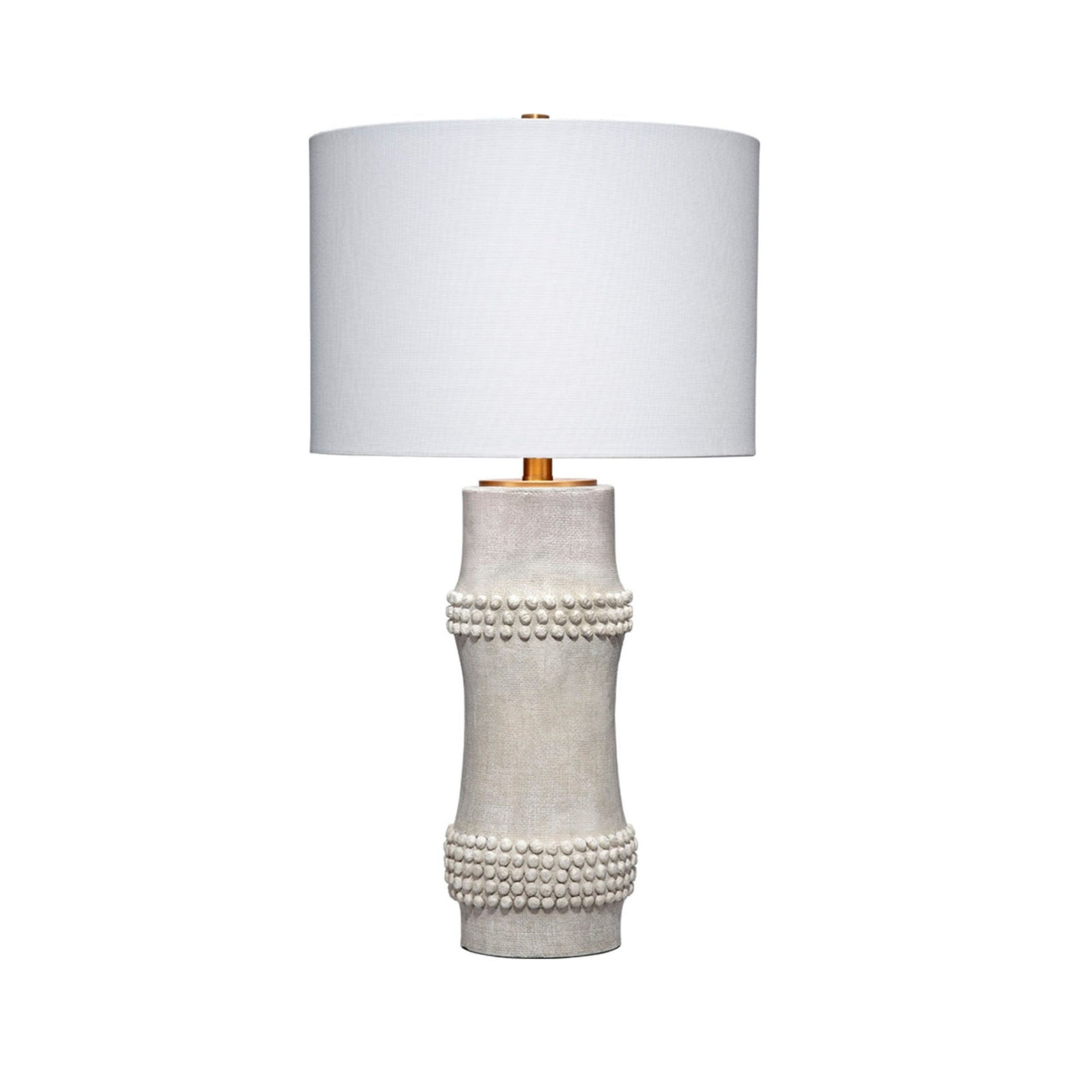 A clean, contemporary take on a classic, the body of this lamp is a minimalistic interpretation of bamboo cane. Ours is unadorned but for a few carefully placed beaded embellishments. The lamps are each handcrafted of resin, with small splashes of brass courtesy of the metal hardware and finial. A white linen drum shade is included.