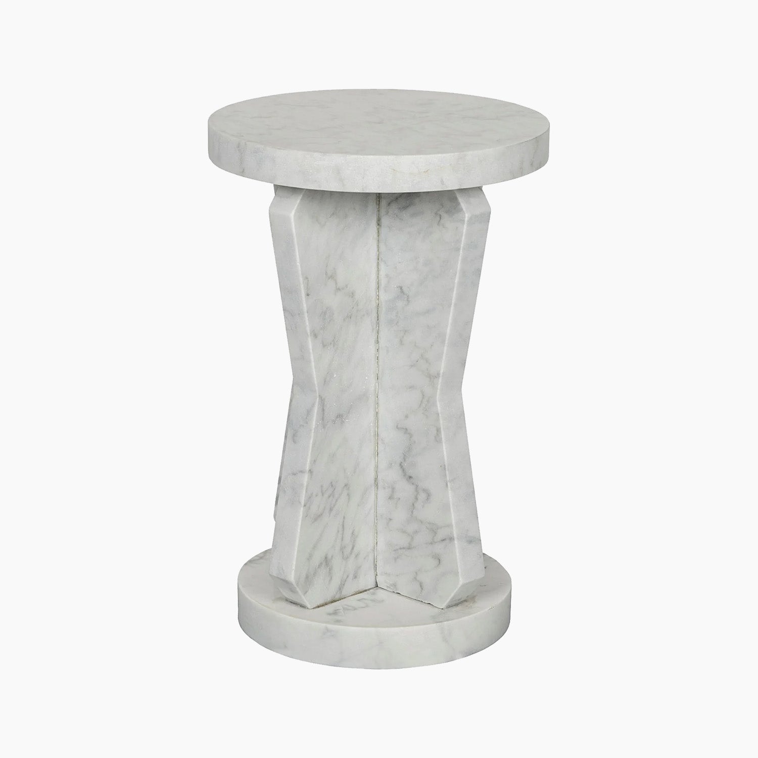 The unrivaled beauty of natural stone shines in this contemporary side table. The piece features a round base and top, and a geometrically inspired leg. Artisan crafted of solid marble; these accent pieces were designed with simple lines to allow the natural material center stage.