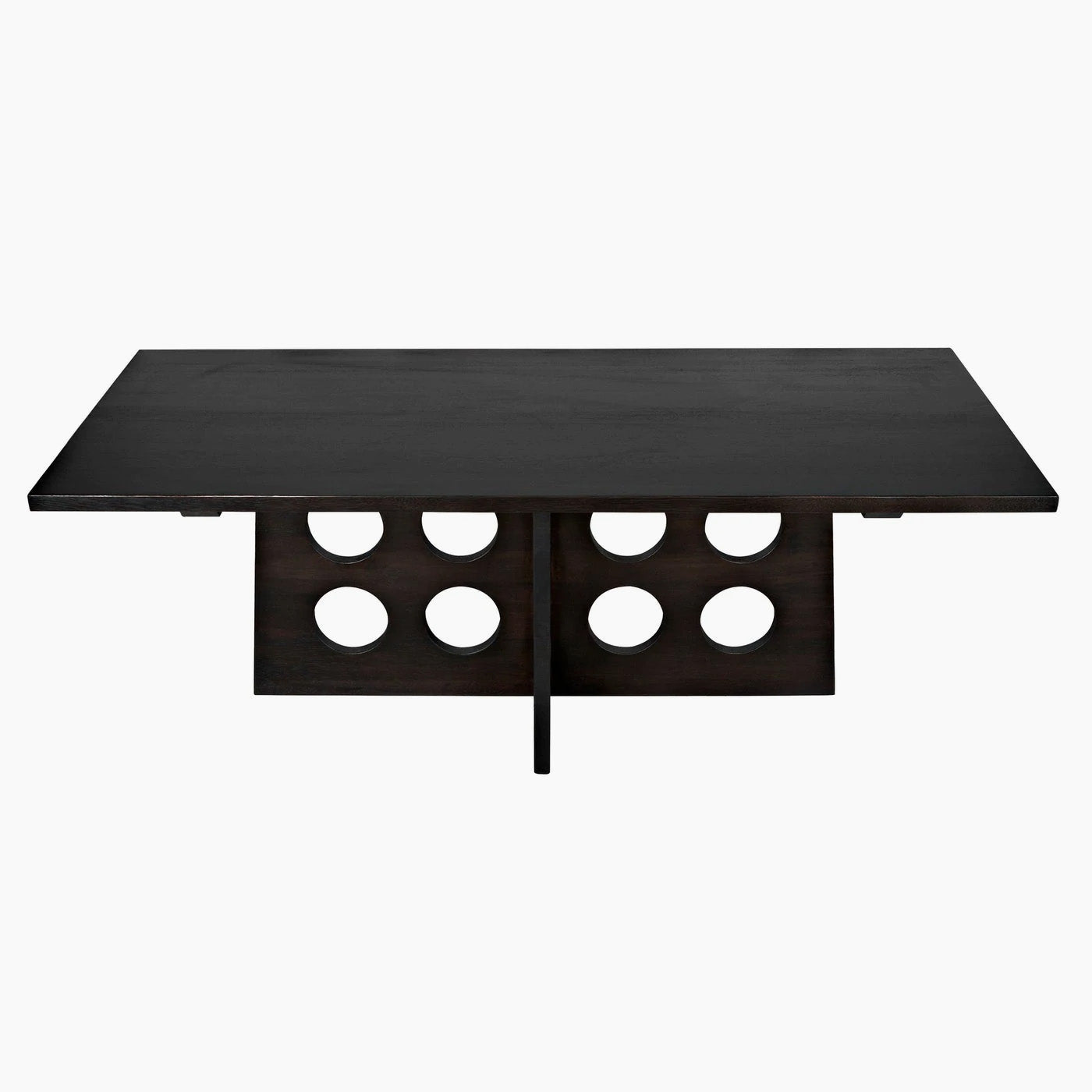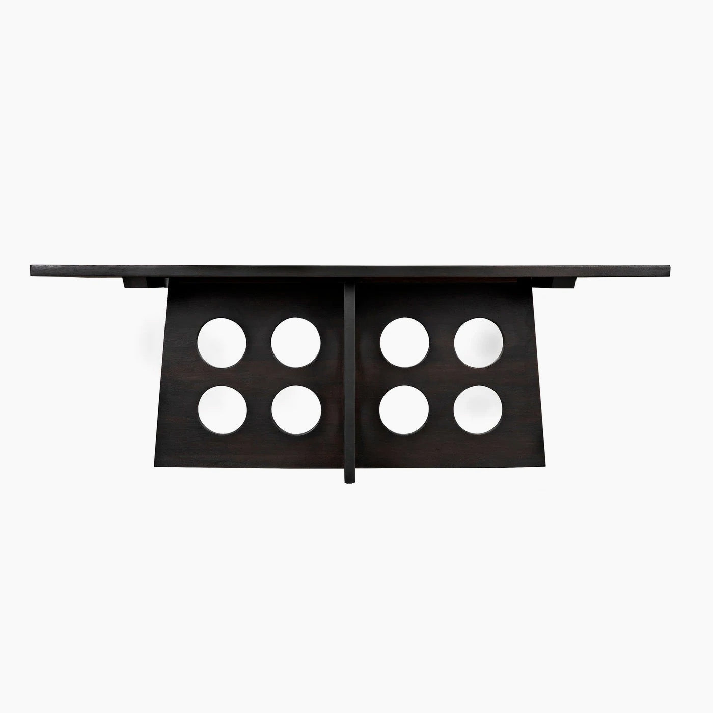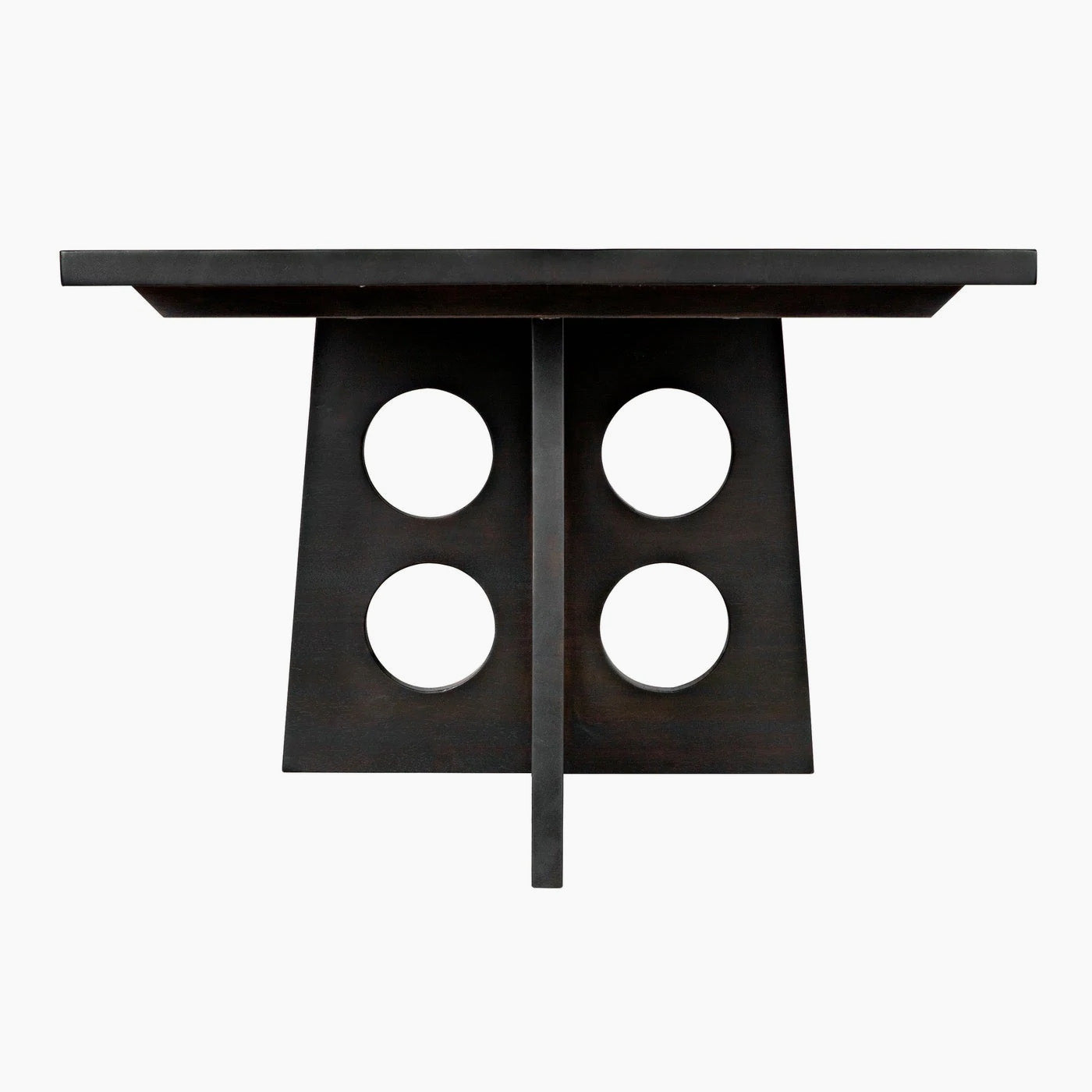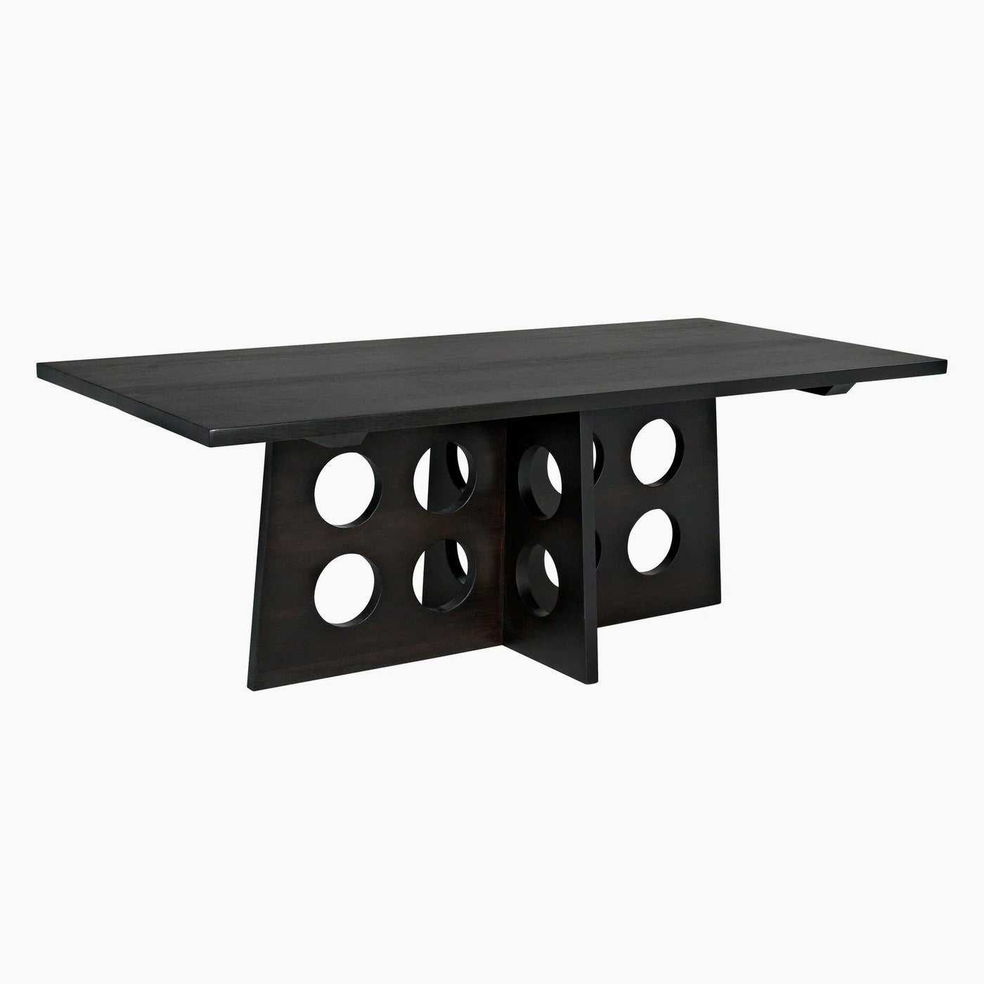 Bold circular cutouts on the architecturally angled base combine with a simple plank top and our rich multi-step stain, Ebony Walnut, for a handsome dining statement.