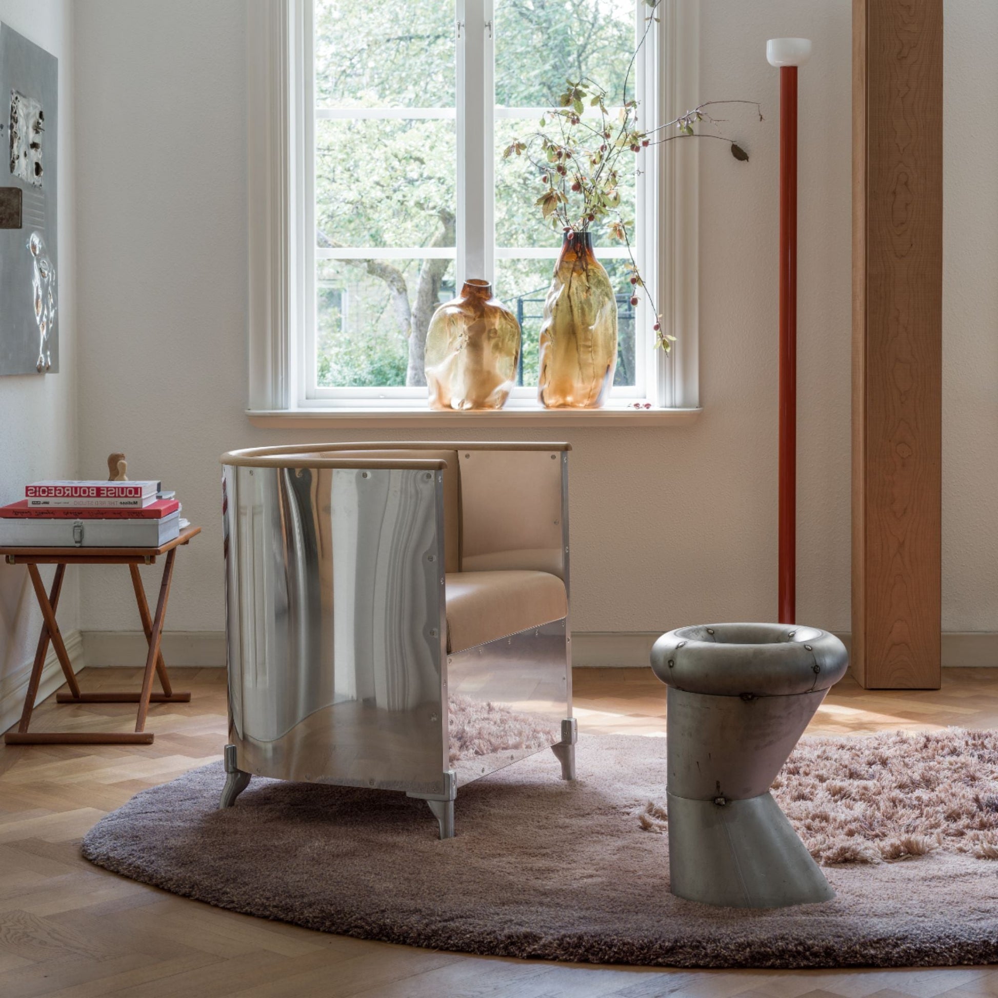 Aluminium is part of a series of products that many call Theselius armchairs, where the common feature is the use of larger pieces of metal combined with leather. This combination makes the armchair as elegant as it is industrial in its look. Theselius chairs are today very sought after worldwide.