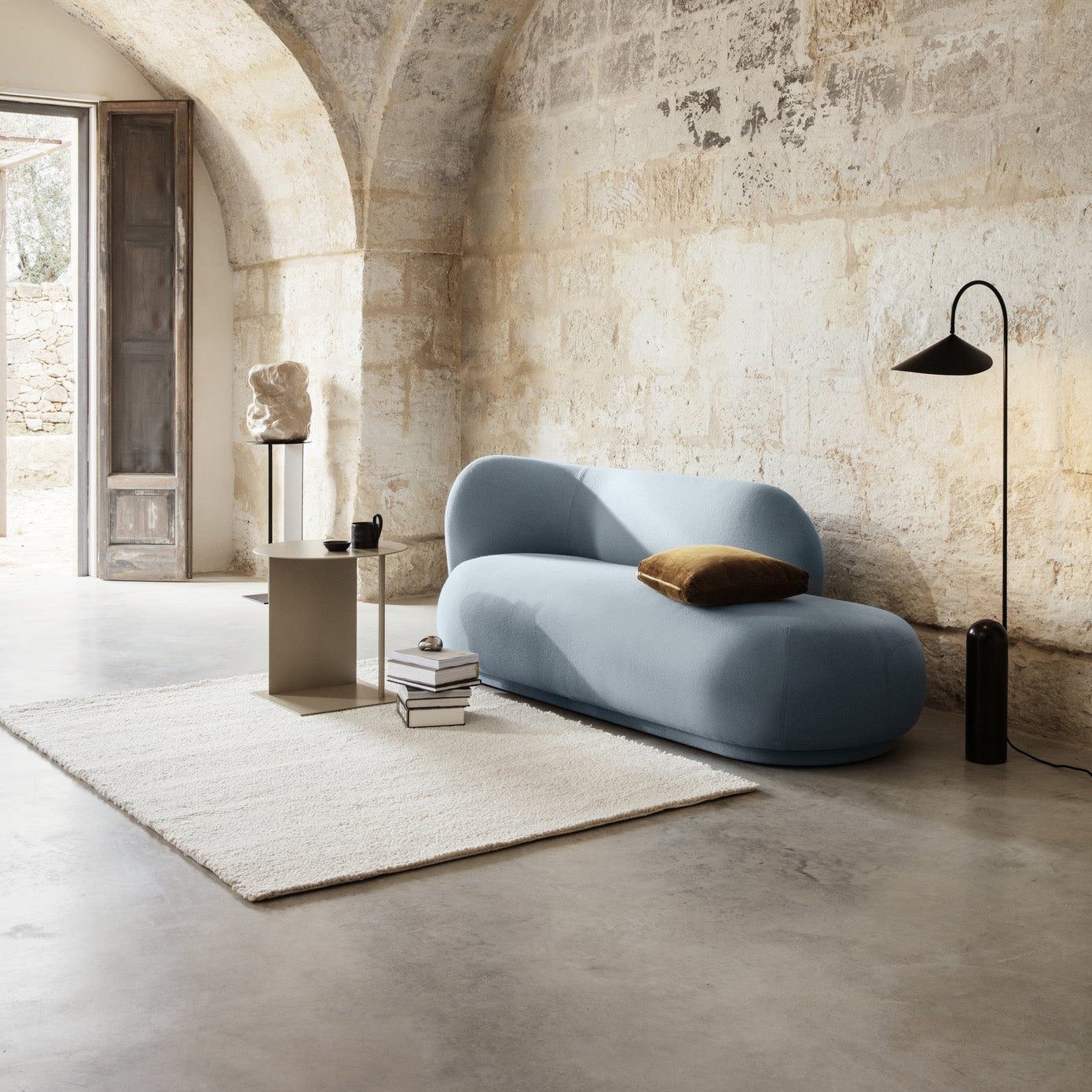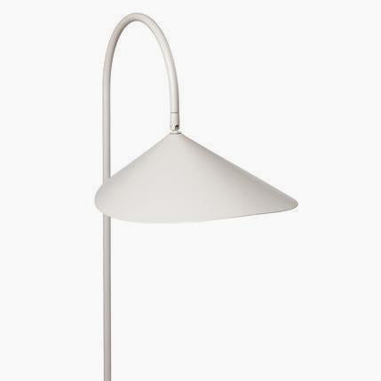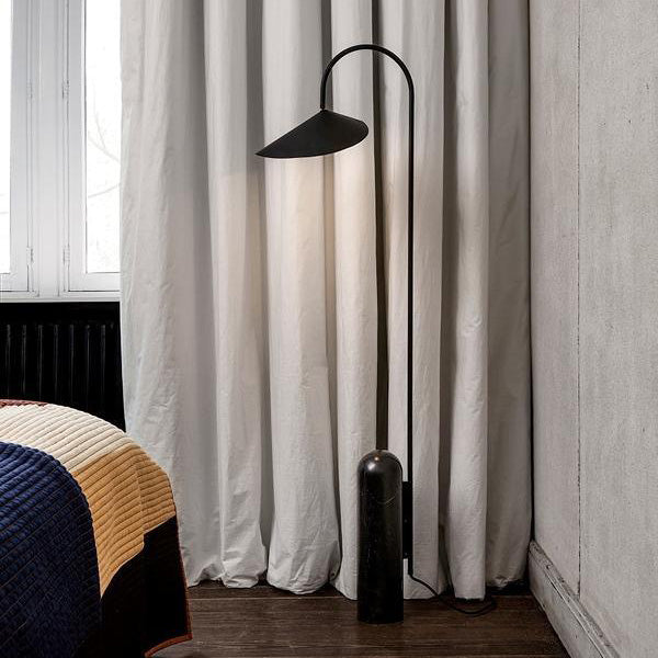 The characteristics of the Arum Floor Lamps include a solid base made of black marble and lampshade with an organic shade. Even though the structure is off-center, the black marble base acts as a counterweight to the gently suspended lampshade that hangs from the bent metal arch like a leaf.