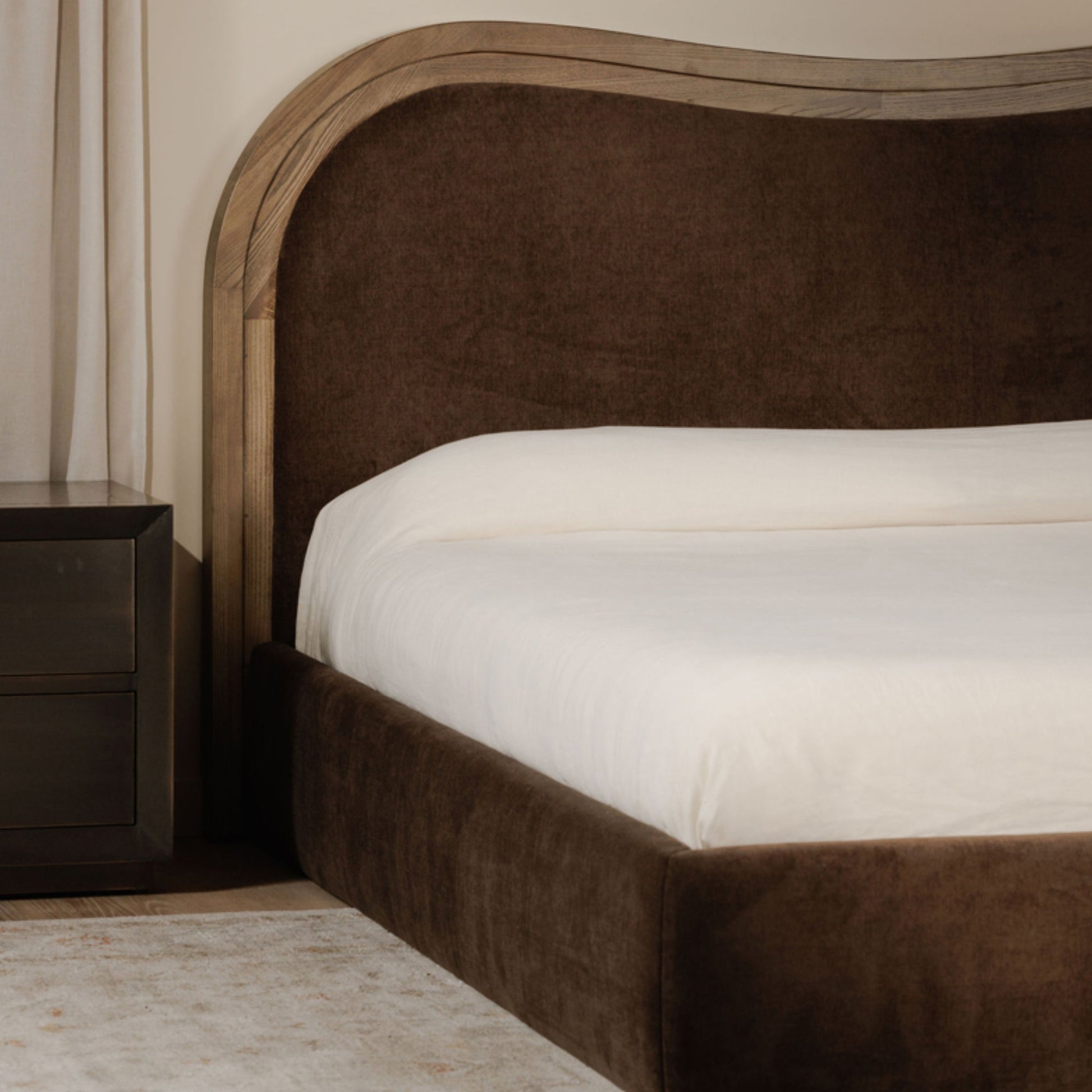 The Aurora bed is our art deco-inspired take on the wave bed. Its solid ash frame exudes warmth with its mid-tone brown finish. The thoughtfully designed upholstered foam and fiber headboard features a stepped-down or inset frame technique that skillfully creates a captivating wave effect.