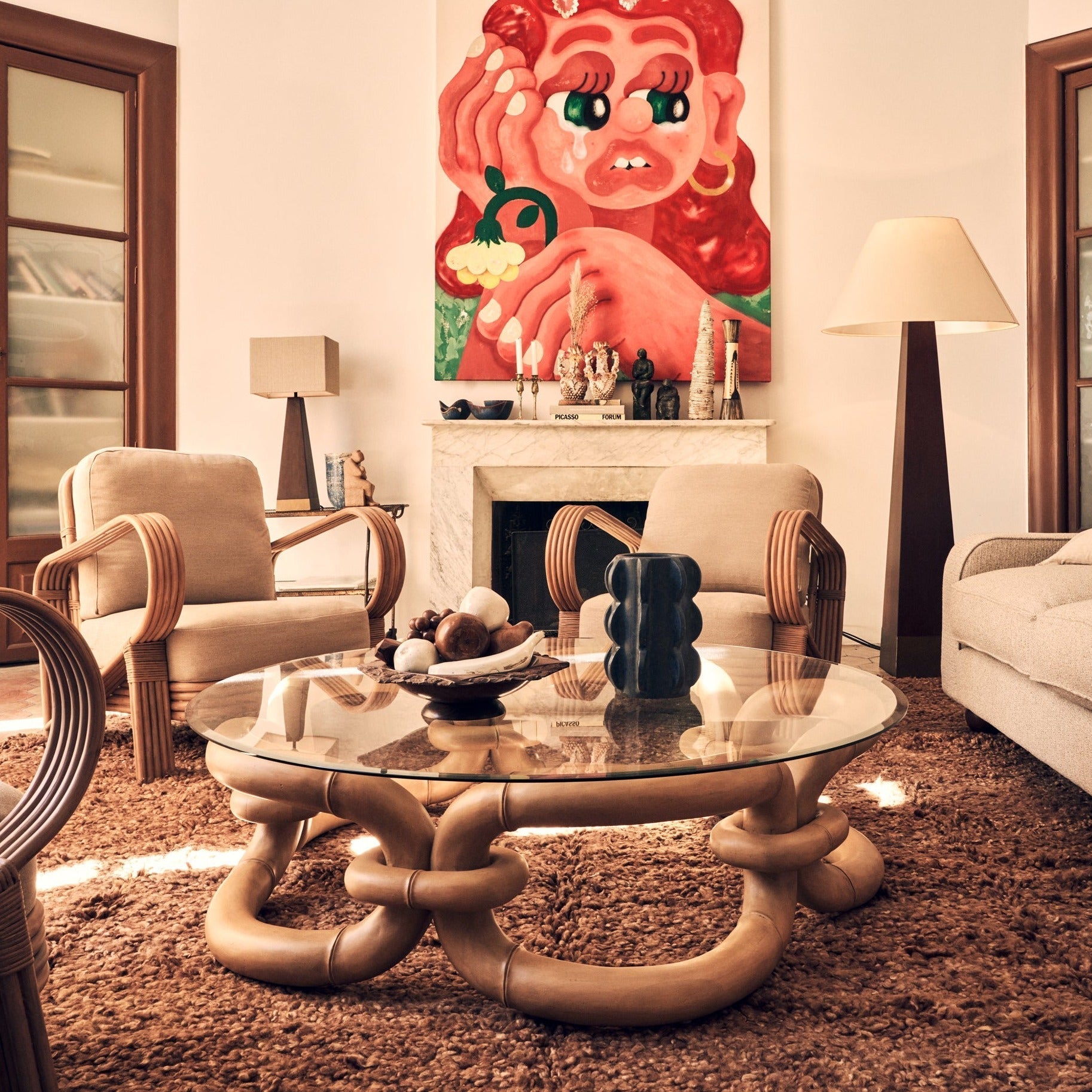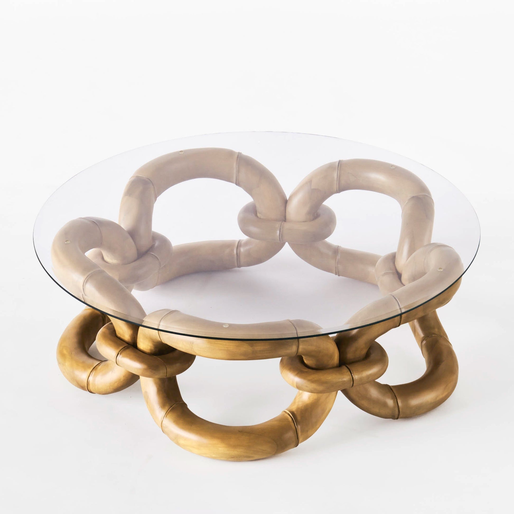 The Bamboo Bracelet Sofa Table is a table characterized by its eye-catching base. Just as the name suggests, its inspired by a bracelet that was found at a flea market years ago by the designers of Dusty Deco.