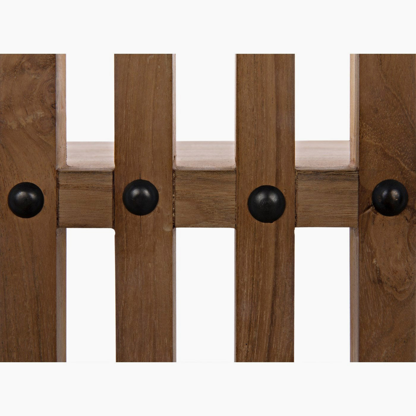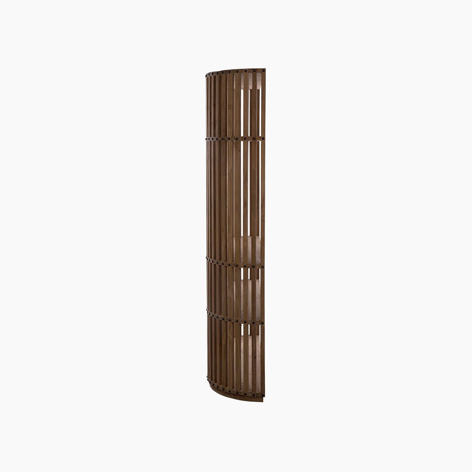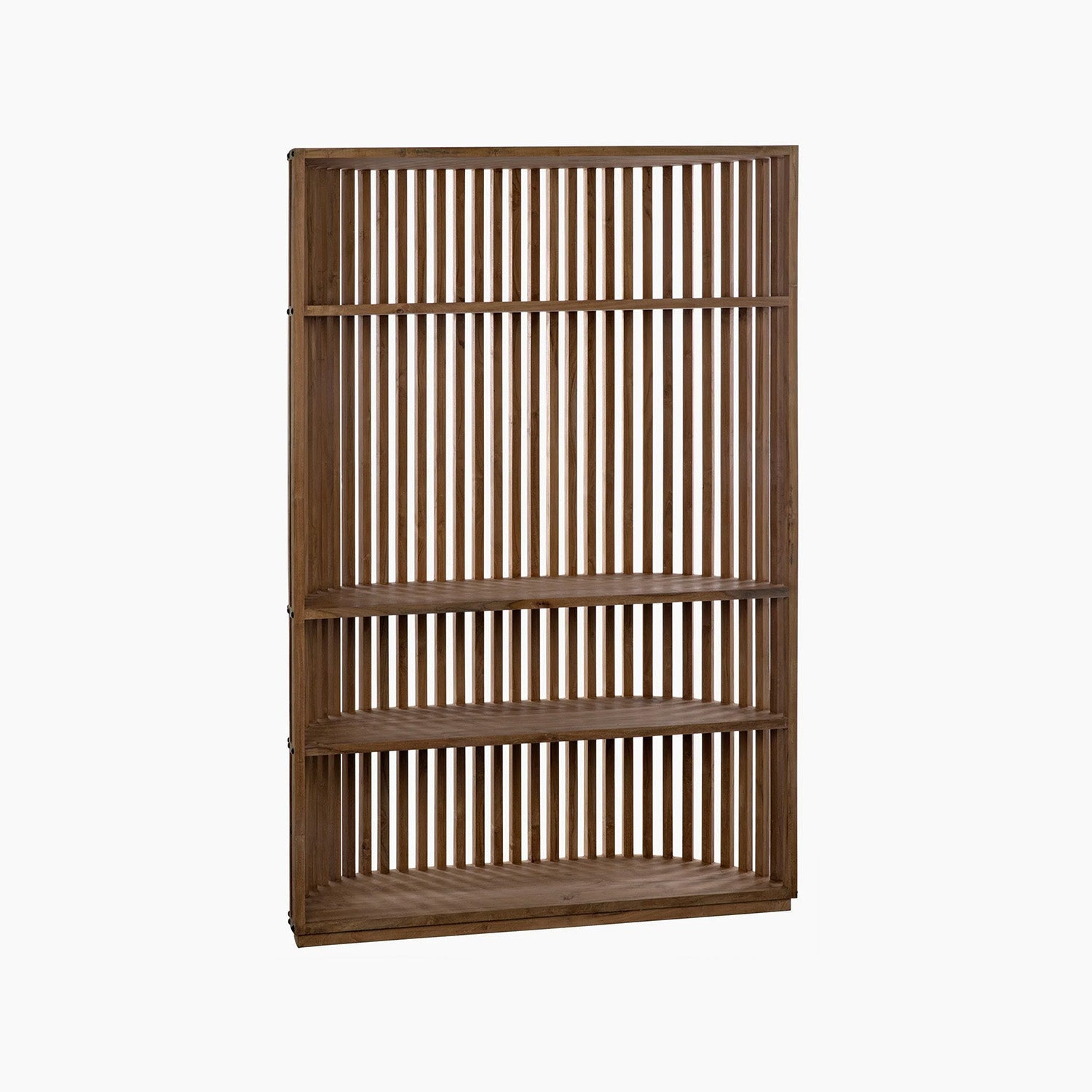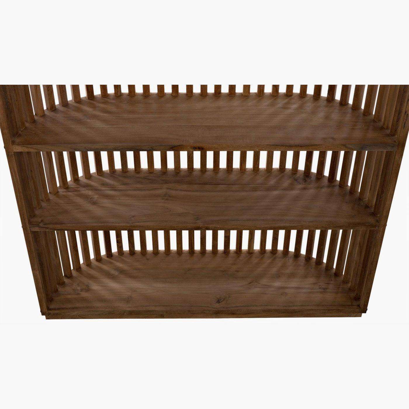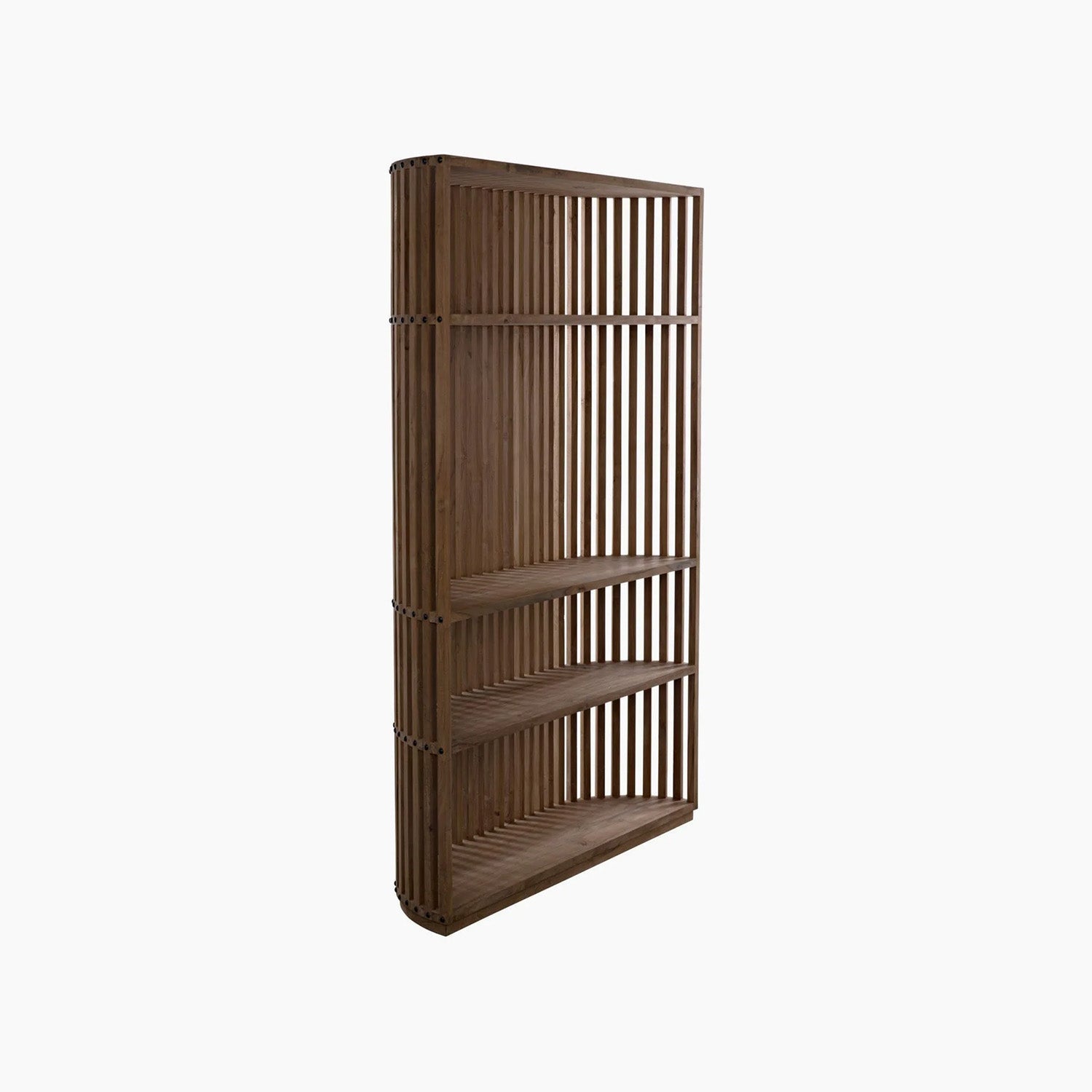 A gently curved shape is complemented by perfectly straight lines in this hand-carved shelving unit. Fully finished, from the back you'll appreciate nailhead inspired accents, and from the front dramatic vertical lines demand attention. Handcrafted of teak.