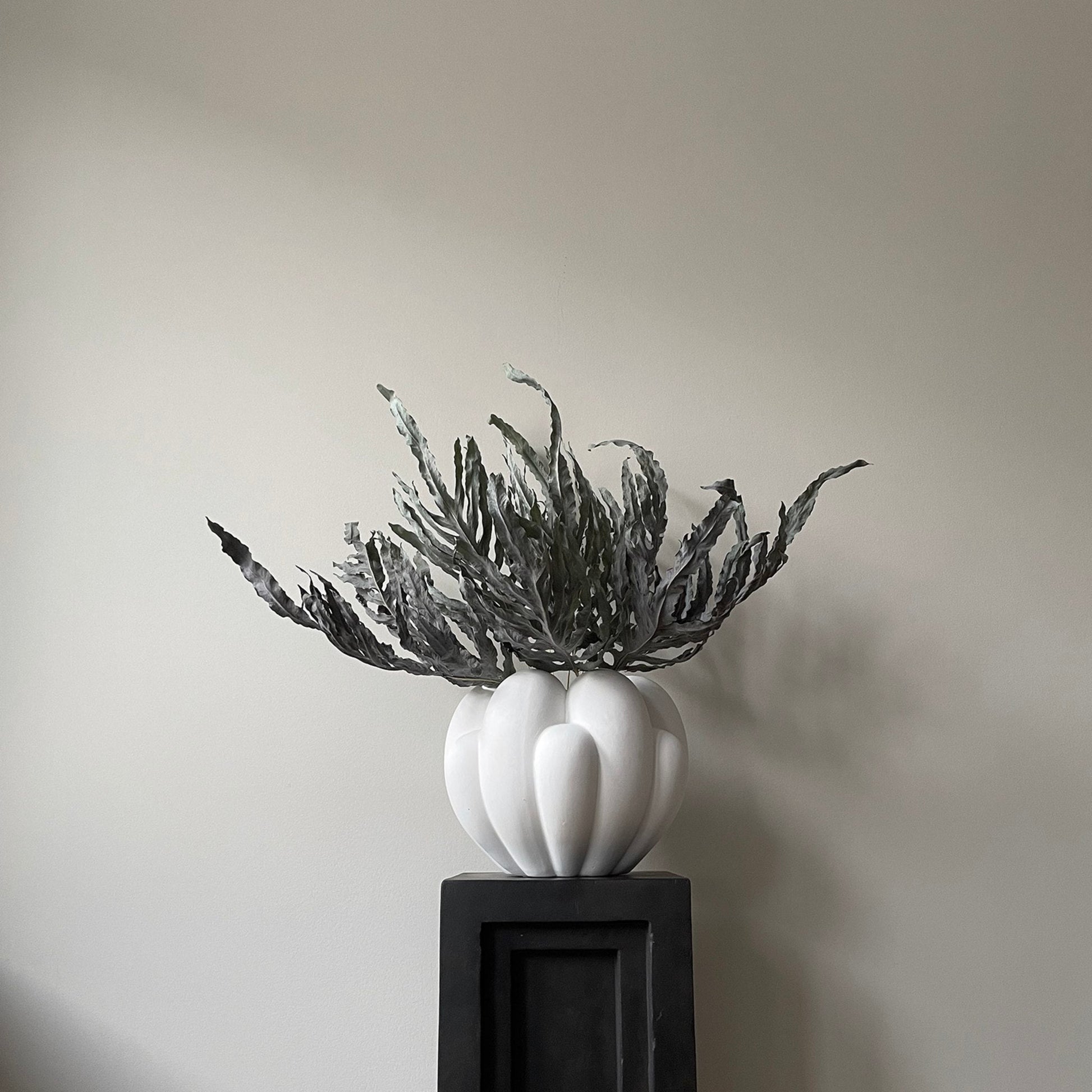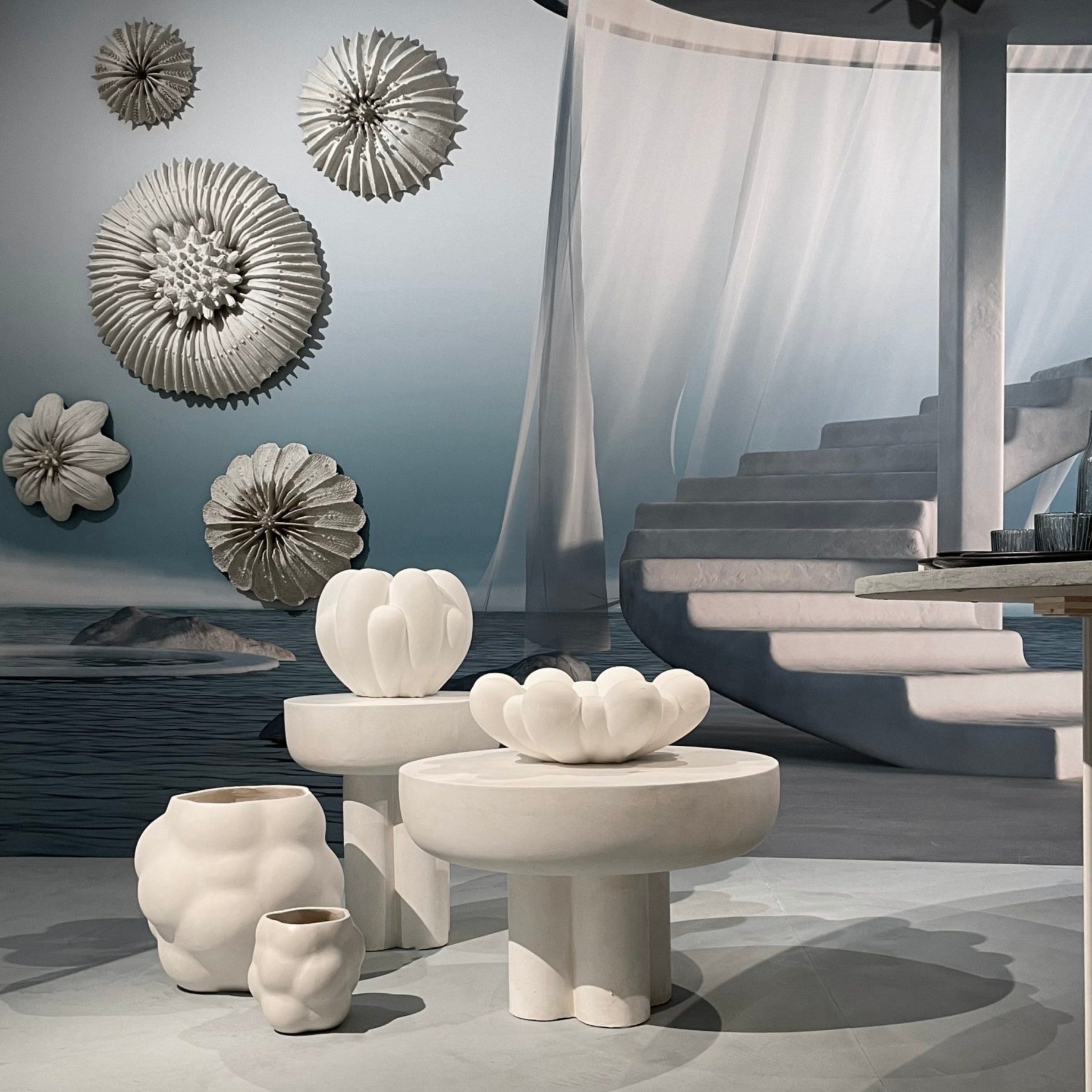 Bloom is an interpretation of 70s floral inspired design. But with a more raw and clean expression. The smoothly curved surface is contrasted by a strong underlying geometry and is enriched by a beautiful play of shadows around the depths of the surface. Due to its expressive design, the Bloom vases changes experience throughout the day, according to the position of light and shadows.
