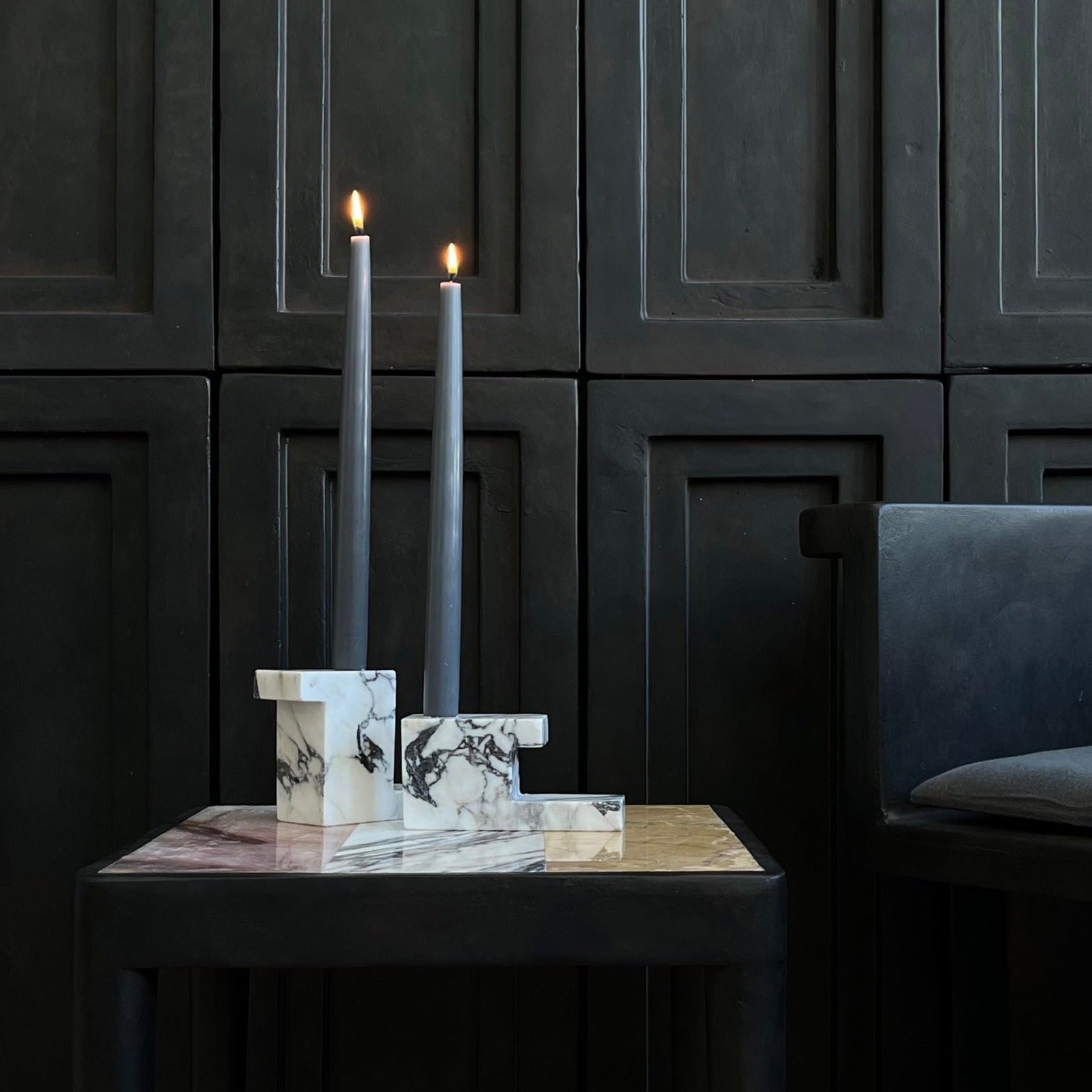 Inspired by architectural building components, the Brick Candle Holders is made of exquisite solid marble, elegantly carved in sharp geometric shapes. Each candle holder is completely unique, emphasising the rich and beautiful patterns of natural stone. The polished surface softly reflects the light from the candle, adding a warmth to the Brick Candle Holders. Brick comes in two shapes and sizes, complementing each other in an architectural composition or stand alone as sculptural object.