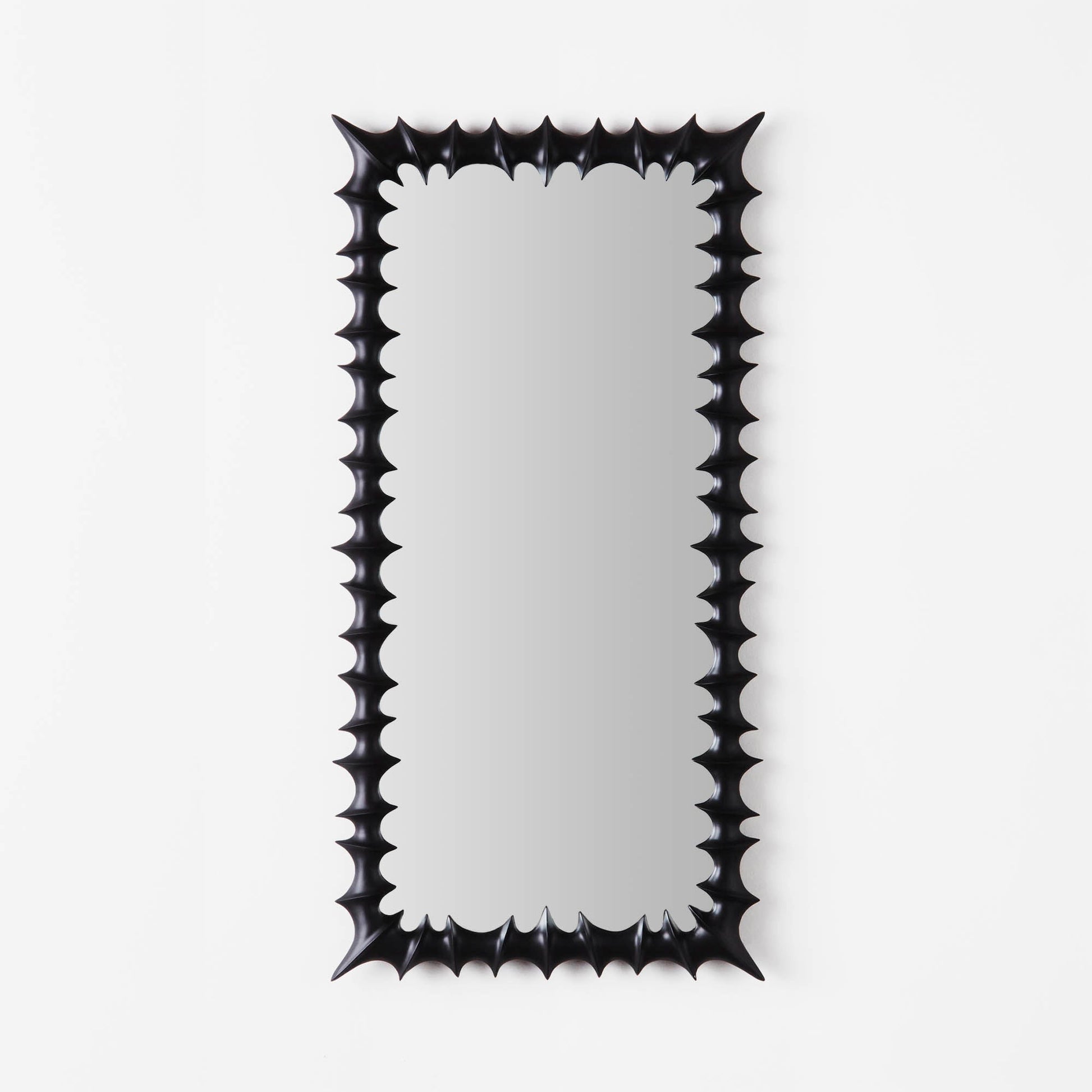 Brutalist Mirror - Black is a full body mirror made of solid beech. Its unique frame with its complex shapes has been made by skilled craftsmen. The wooden frame has been painted with a matte black colour that gives the frame a smooth finish. The back of the mirror is made of plywood board and has been equipped with two hanging loops.