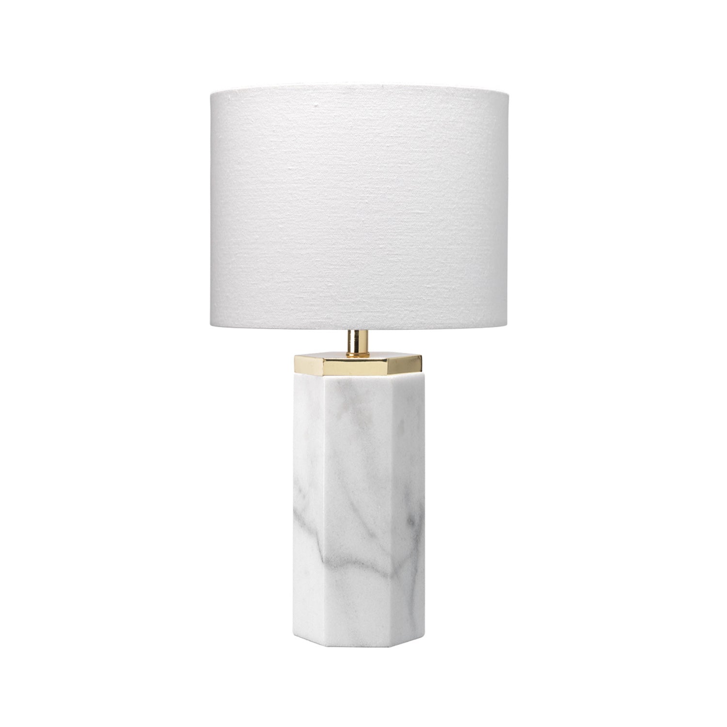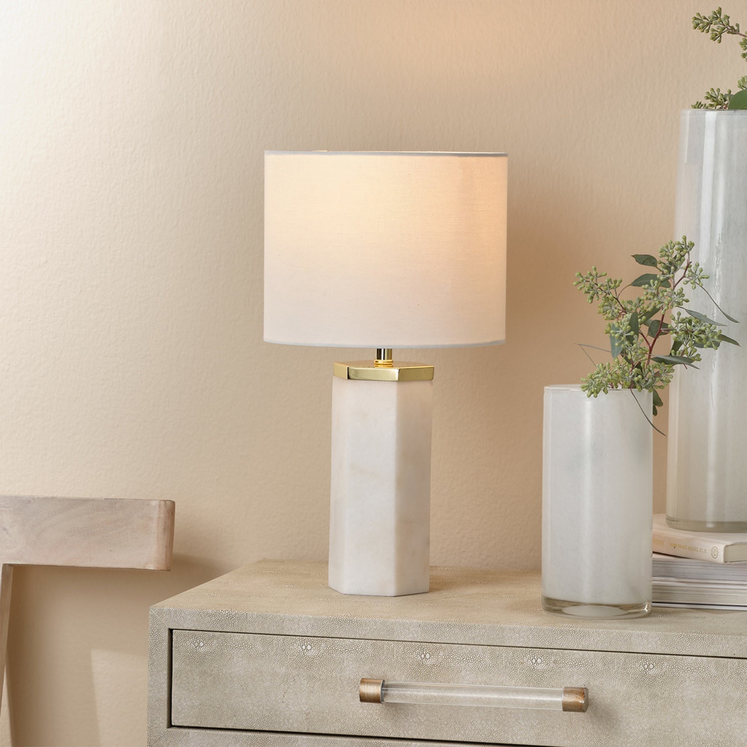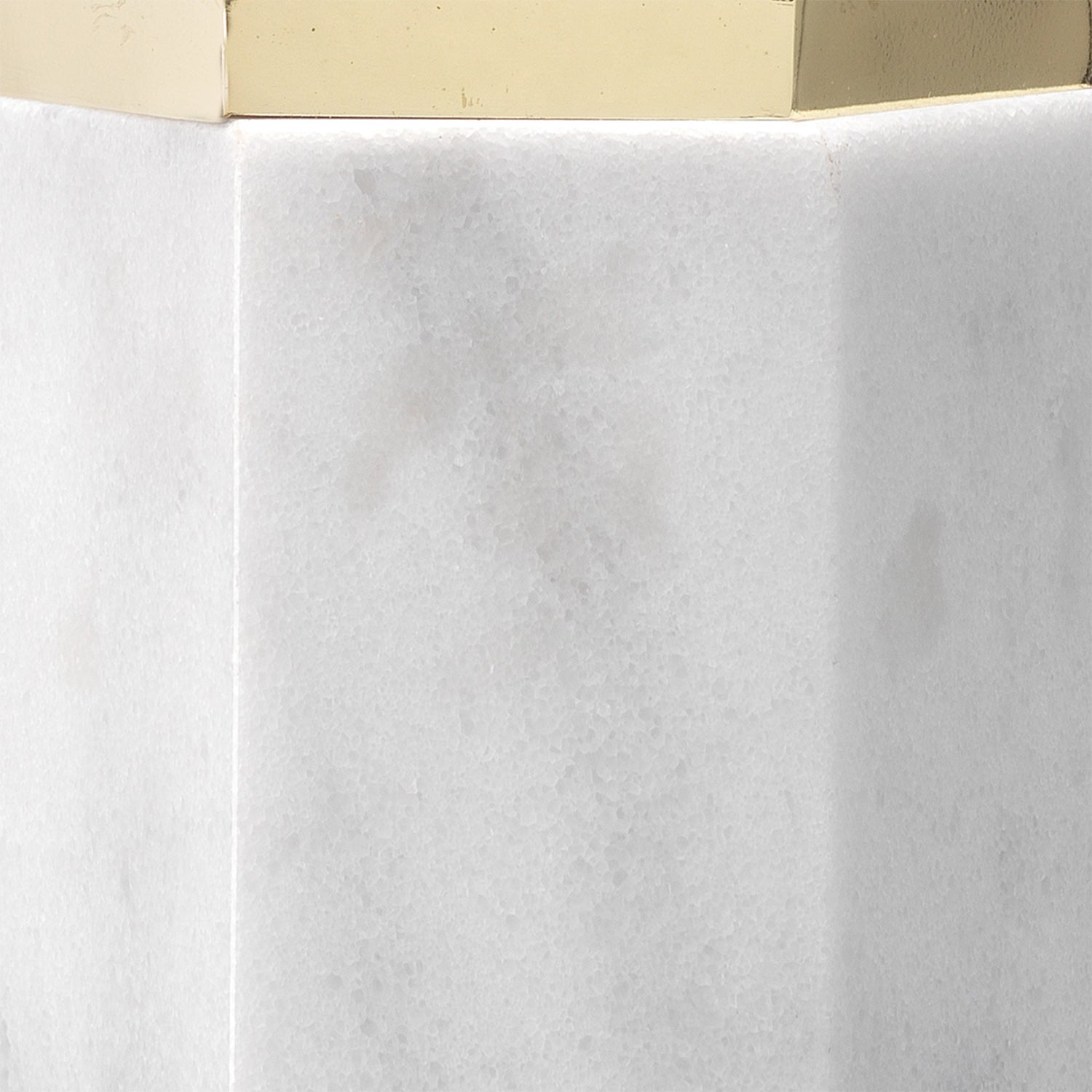 The balanced geometry of a hexagon in a slender white marble column of stunning simplicity, capped in brass metal, makes for a perfect accent lamp.