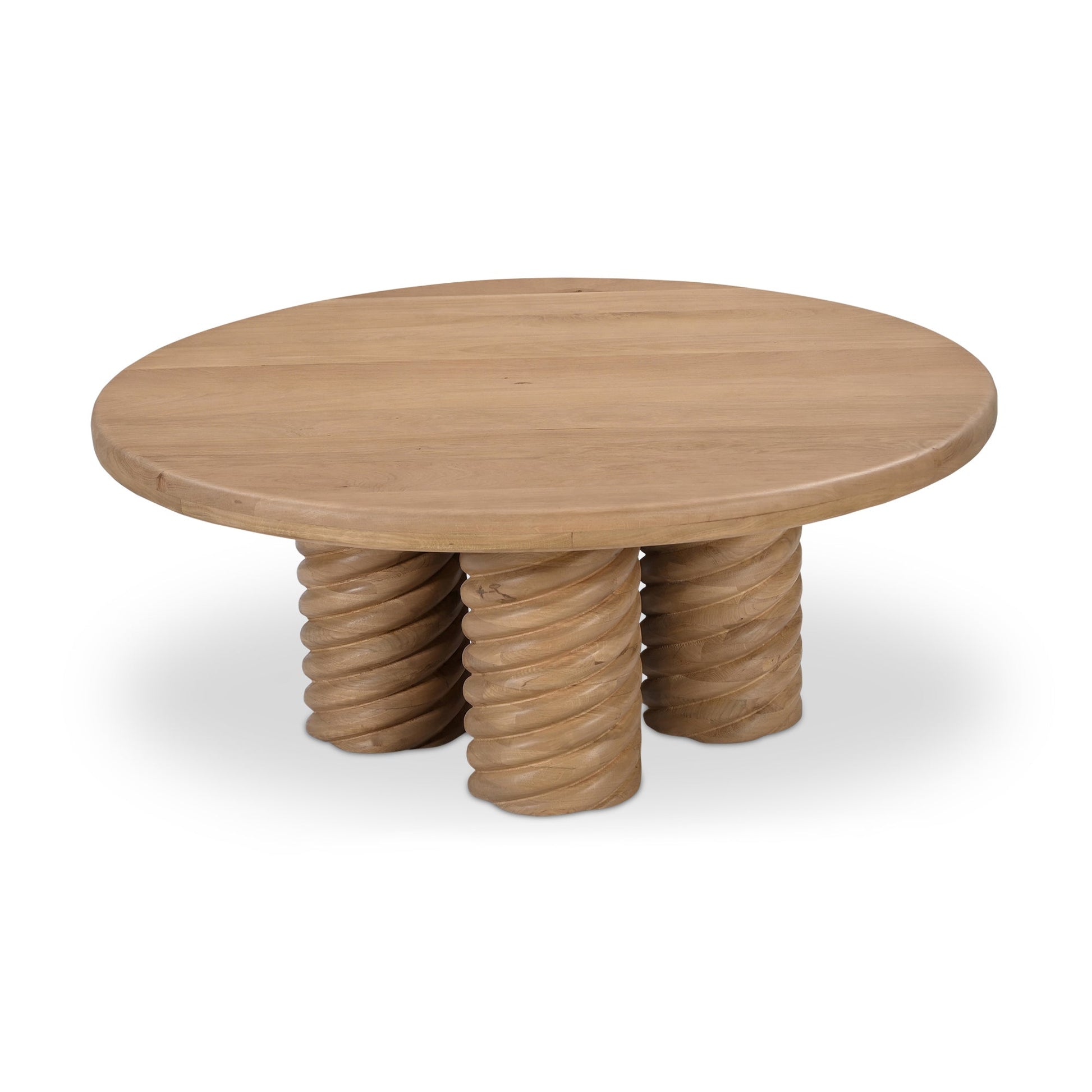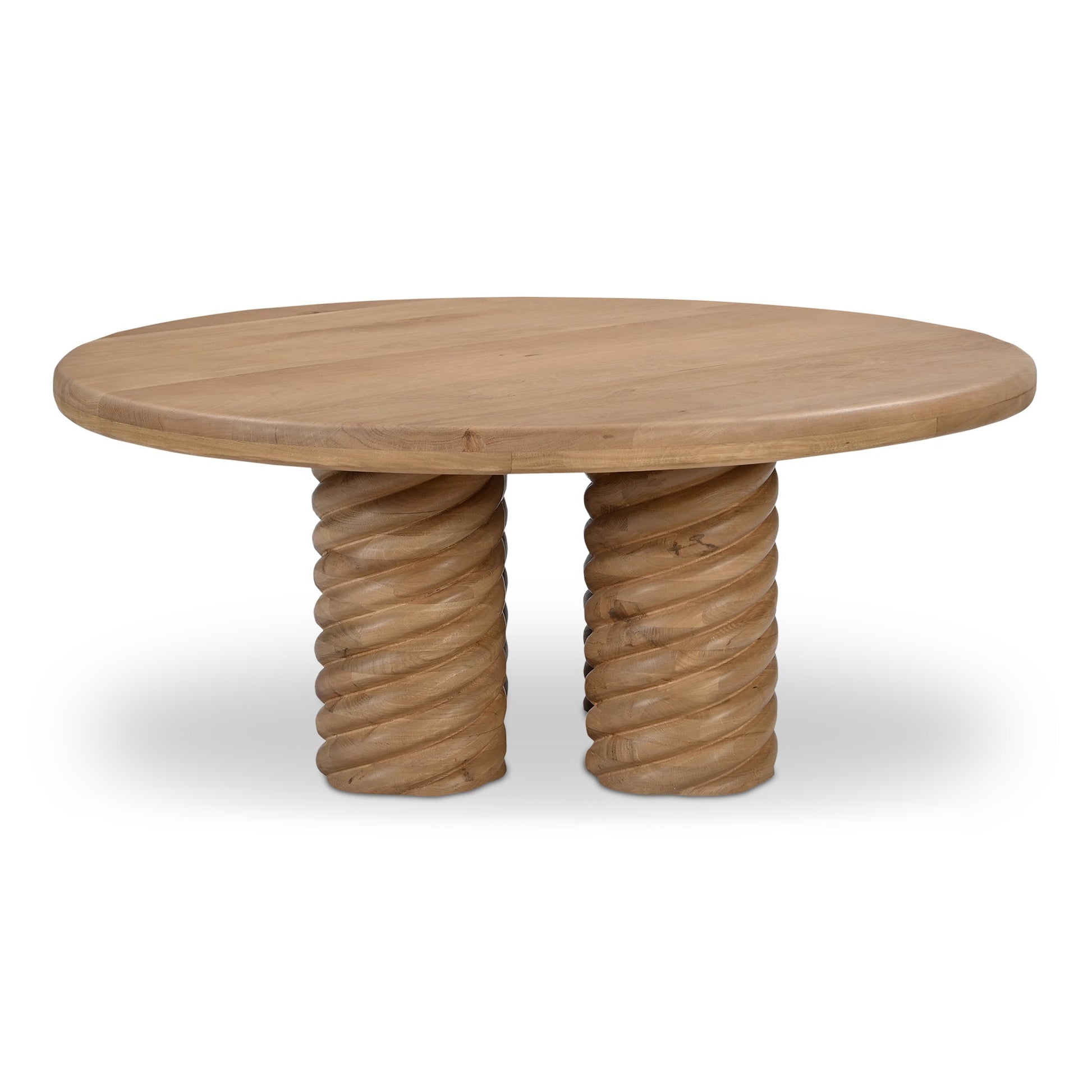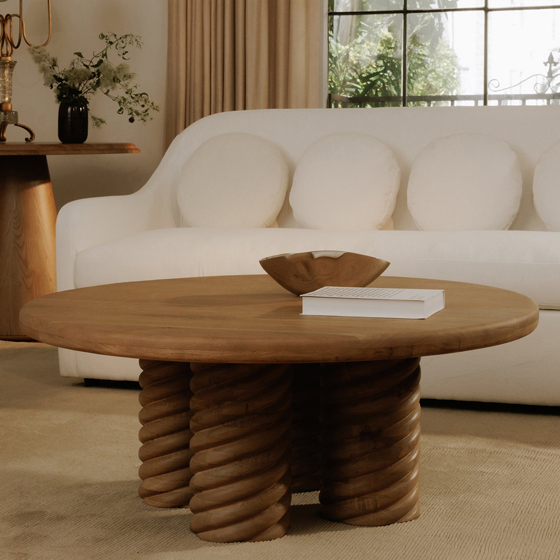 The Charlotte coffee table embodies a contemporary reinterpretation of classical aesthetics, distinguished by its intricate turned and braided details. The table features an exaggerated, elegantly detailed pedestal base, presenting a bold modern twist while ensuring practicality. Its pedestal design is visually appealing and enhances functionality, creating a welcoming, uncluttered space for gatherings and everyday use.