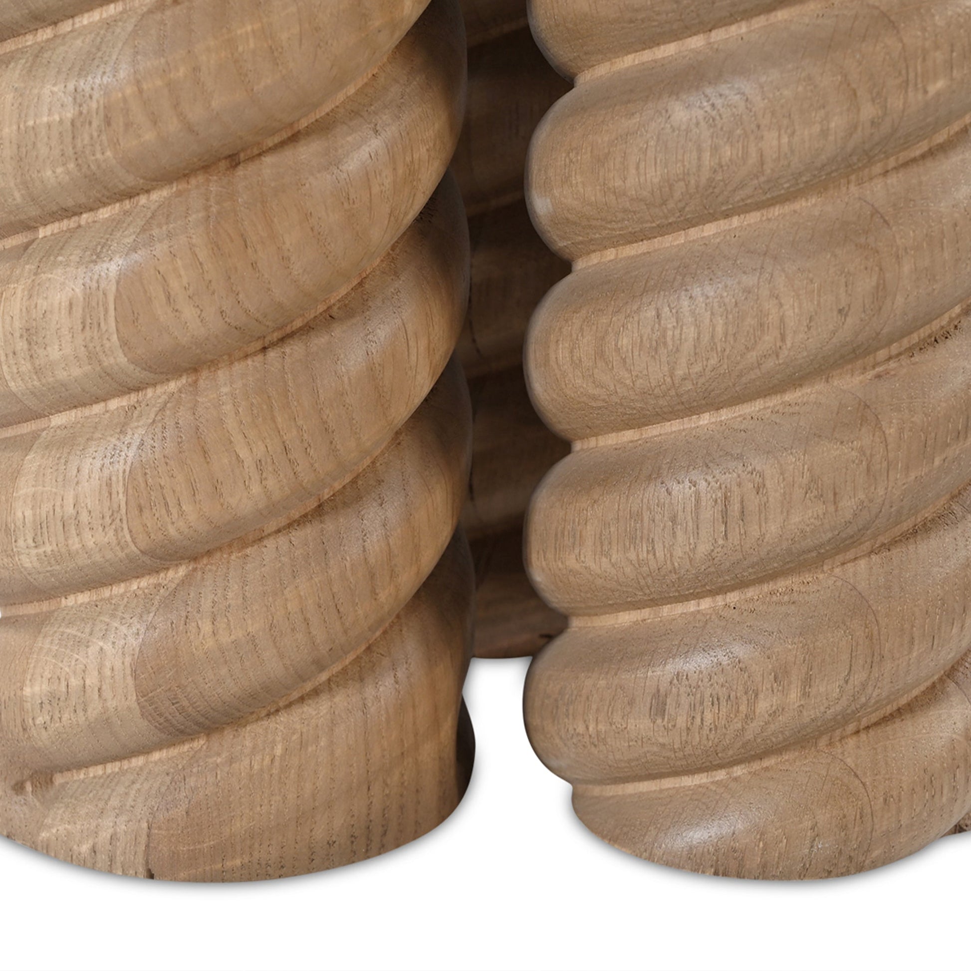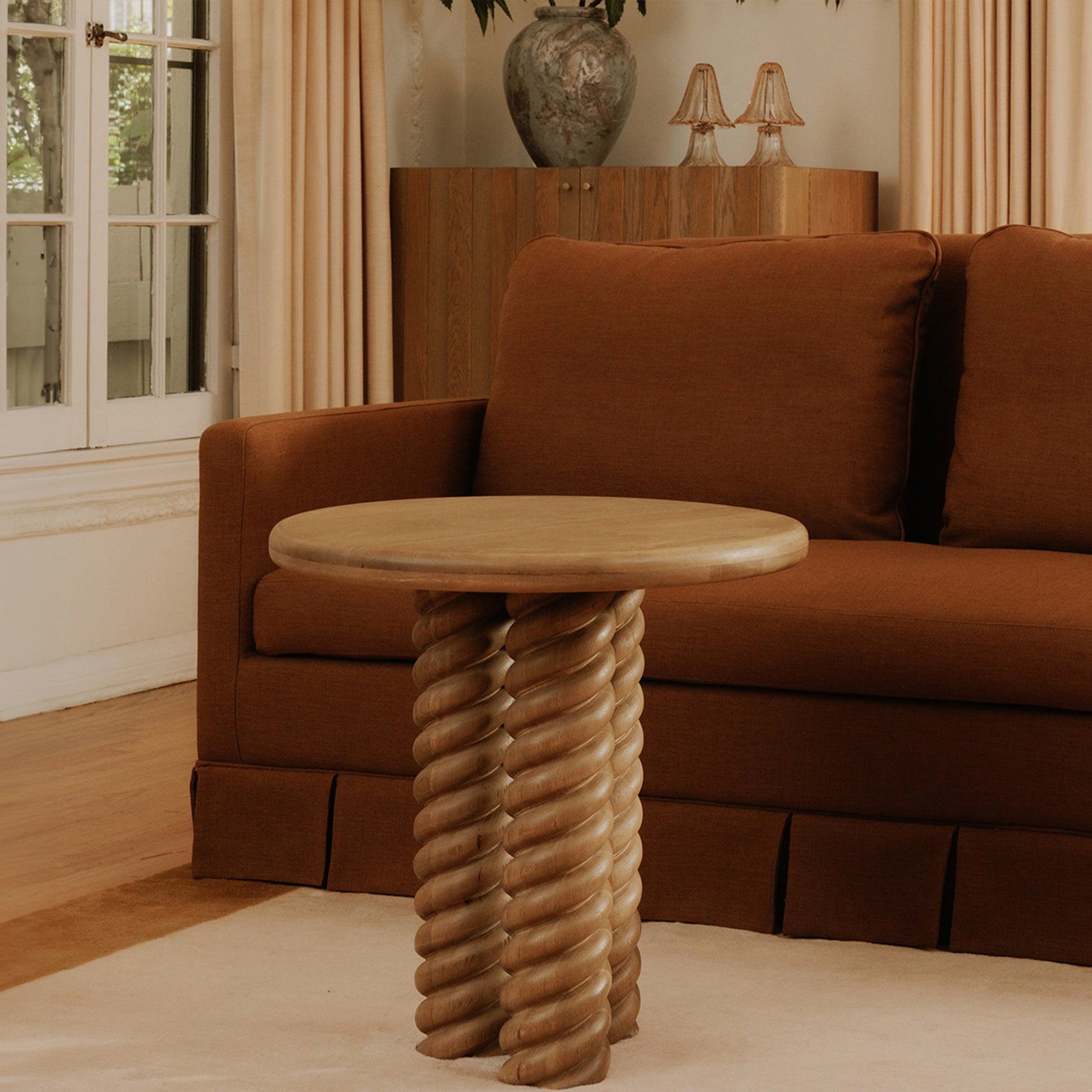 The Charlotte side table embodies a contemporary reinterpretation of classical aesthetics, distinguished by its intricate turned and braided details. The table features an exaggerated, elegantly detailed pedestal base, presenting a bold modern twist while ensuring practicality. Its pedestal design is visually appealing and enhances functionality, creating a welcoming, uncluttered space for gatherings and everyday use.