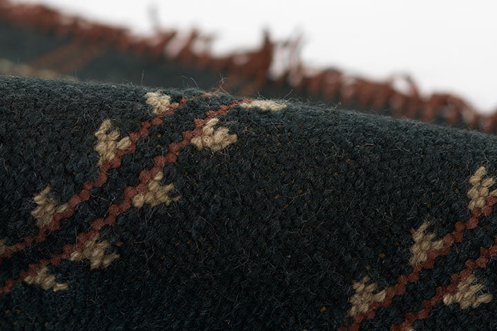 This striking deep blue rug was heavily influenced by patterns found in Southwest Native American and Indonesian cultures. Hand-woven using wool fibers and leather accents, this design offers a more interesting take on stripes, incorporating tribal inspired motifs along the way. The fringe tan leather detailing on either end lends a warm touch to its otherwise cool, rich hues.