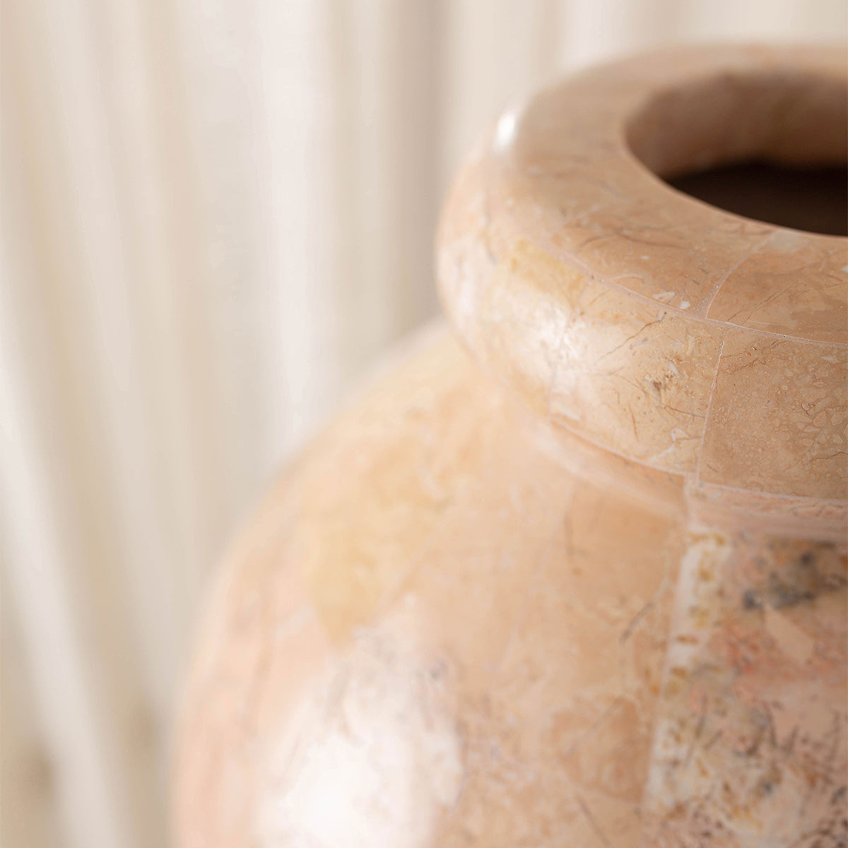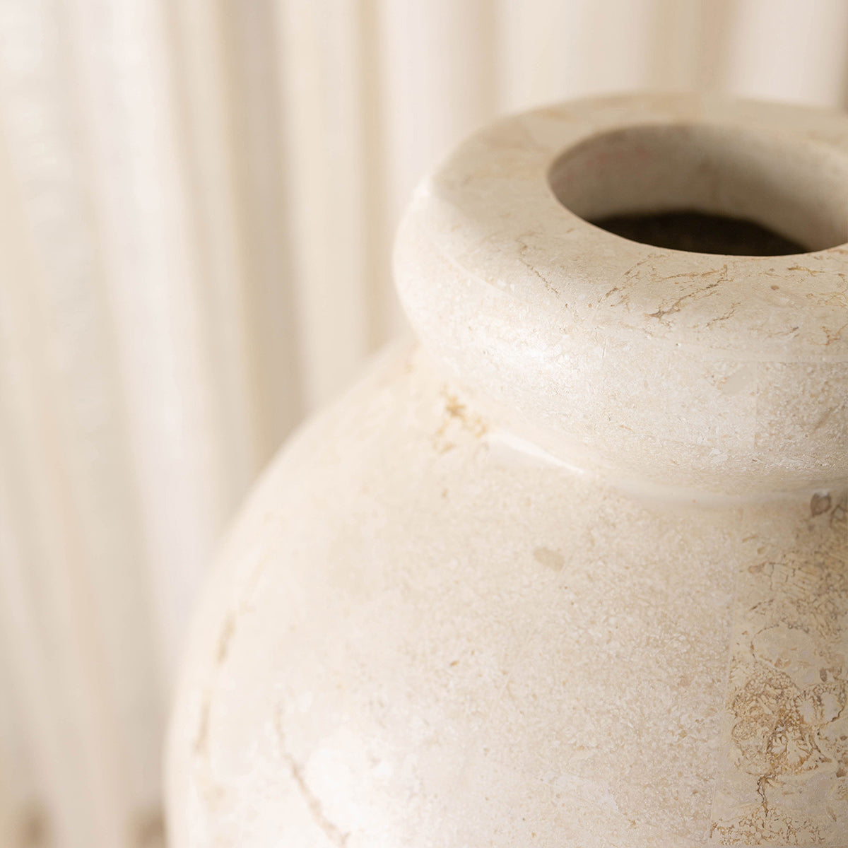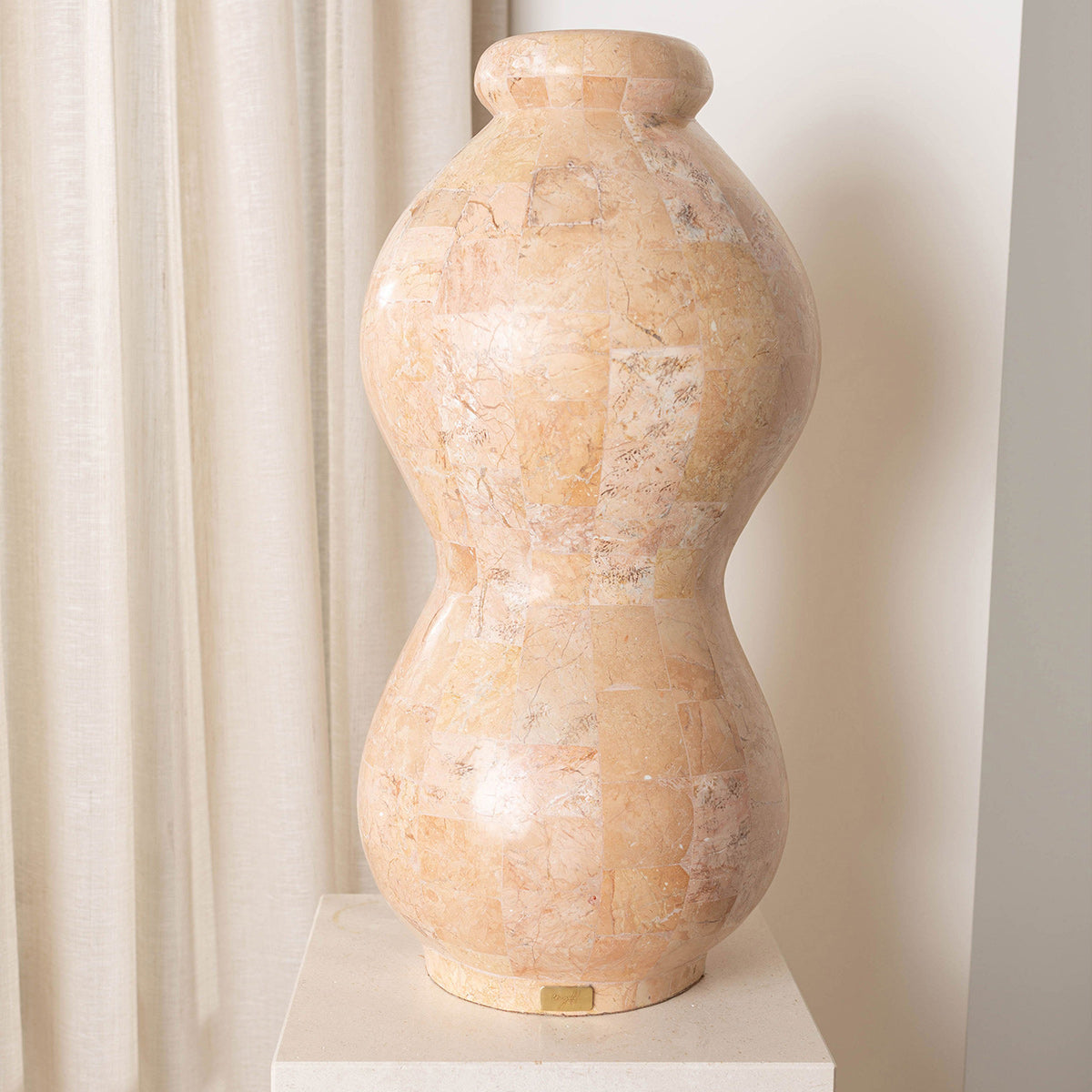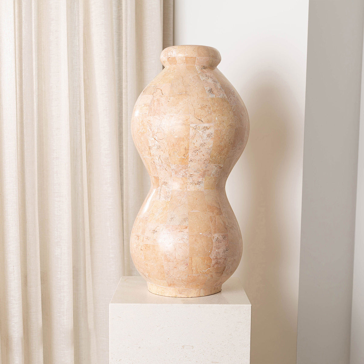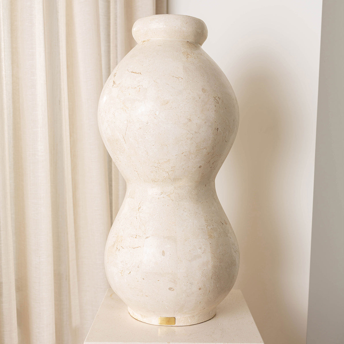 Introduce full bodied silhouette and organic form with our Dana Vase. Handcrafted natural stone tile inlay, celebrating the naturally occurring fossil etchings found in this beautifully unique stone.