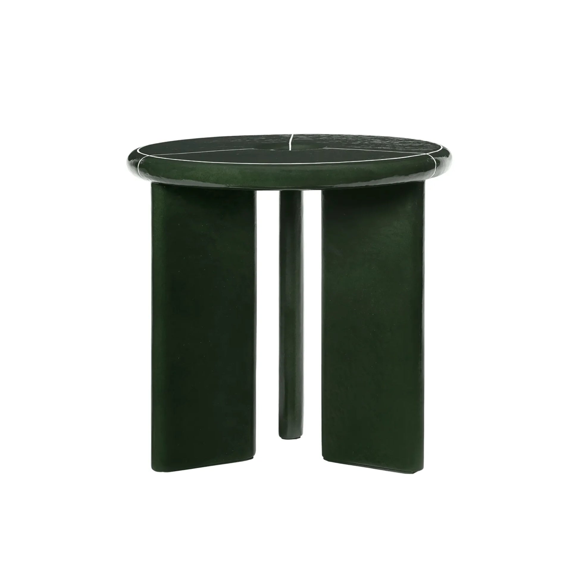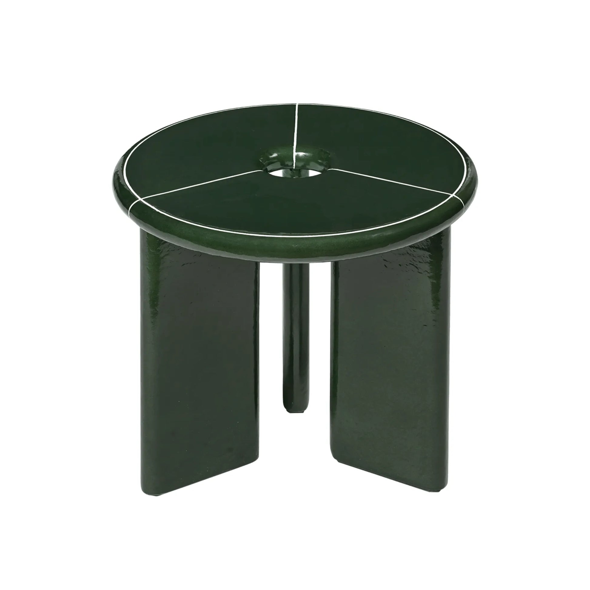 The Ferm Living x Utzon – Can Lis collaboration draws inspiration from architect Jørn Utzon’s family home in Mallorca, merging the natural environment with design elements that reflect his unique philosophy. Crafted from fibre concrete, the Deya Side Table features a striking dark green glaze with an uneven texture, accentuated by off-white grout lines. The segmented tabletop introduces a bold geometric appeal, complemented by generously rounded edges for a softened presence. Balancing artisanal craftsmanship with bold geometry, the Deya Side Table is a versatile piece, suitable for both indoor and outdoor spaces.