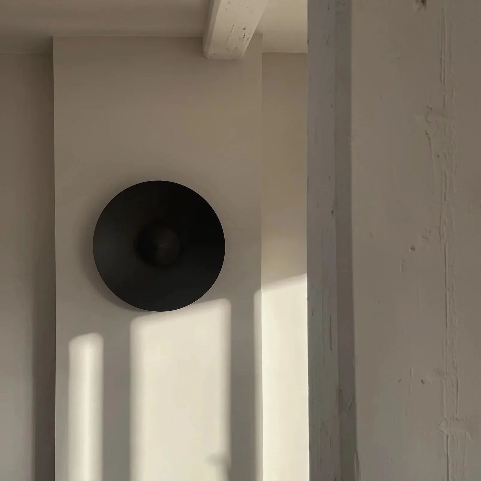 An art piece in itself, the Dusk and Dawn lamps are a unique source of light that lets the mind wander to planets, eclipses and Brutalist architectural details. The layered shades playfully divide the light into a rhythm of exposure and contributing to an intimate and cozy atmosphere. The two rounded aluminium shades which, richly textured and with an almost concrete like surface, gives a certain depth to the smooth light.