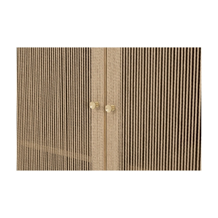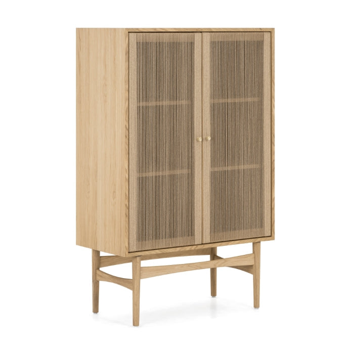 The Eastern cabinet is a fresh take on classic mid-century modern design. A solid, FSC certified Oak case is supported by a turned wood leg frame with sculpted crossbars. 2 hinged doors with intricately woven Danish paper cord detailing conceal adjustable shelves.