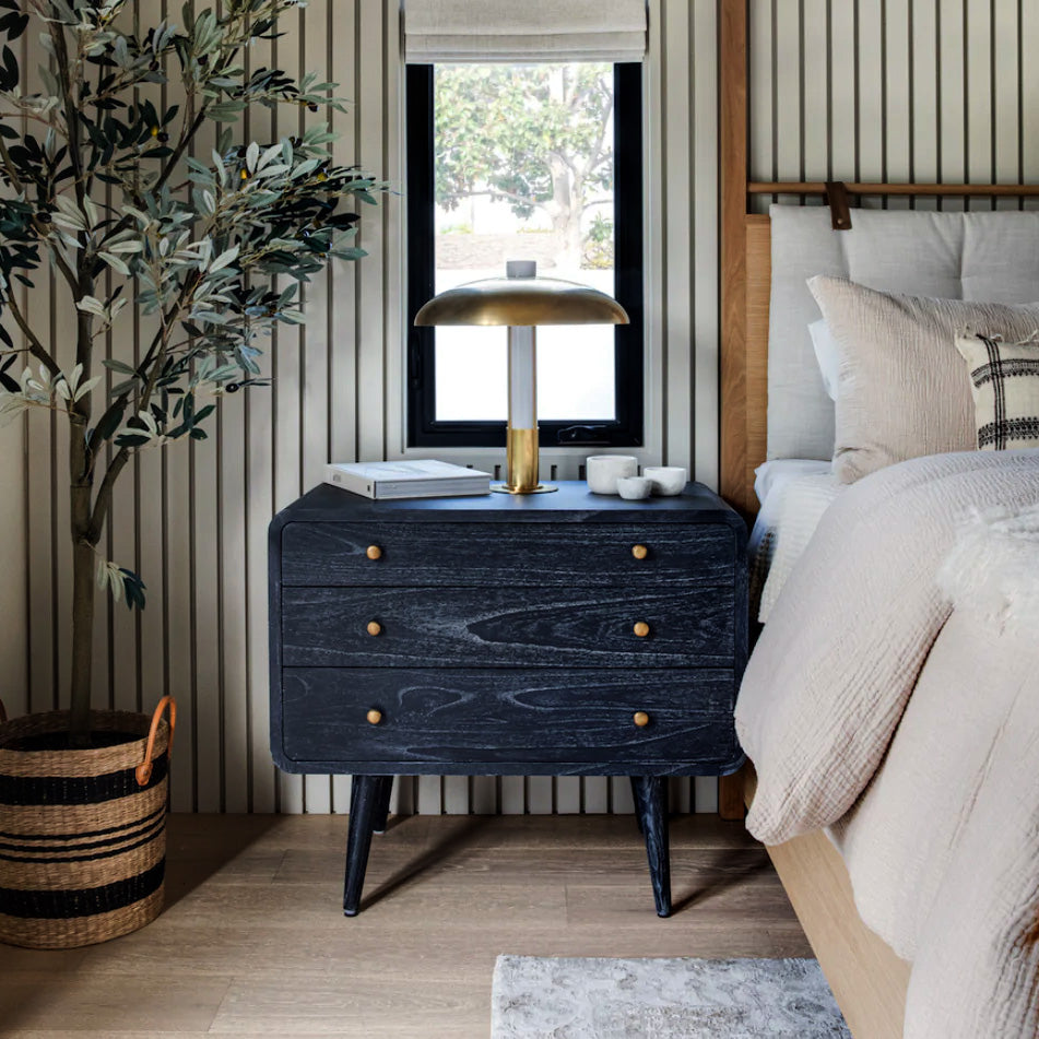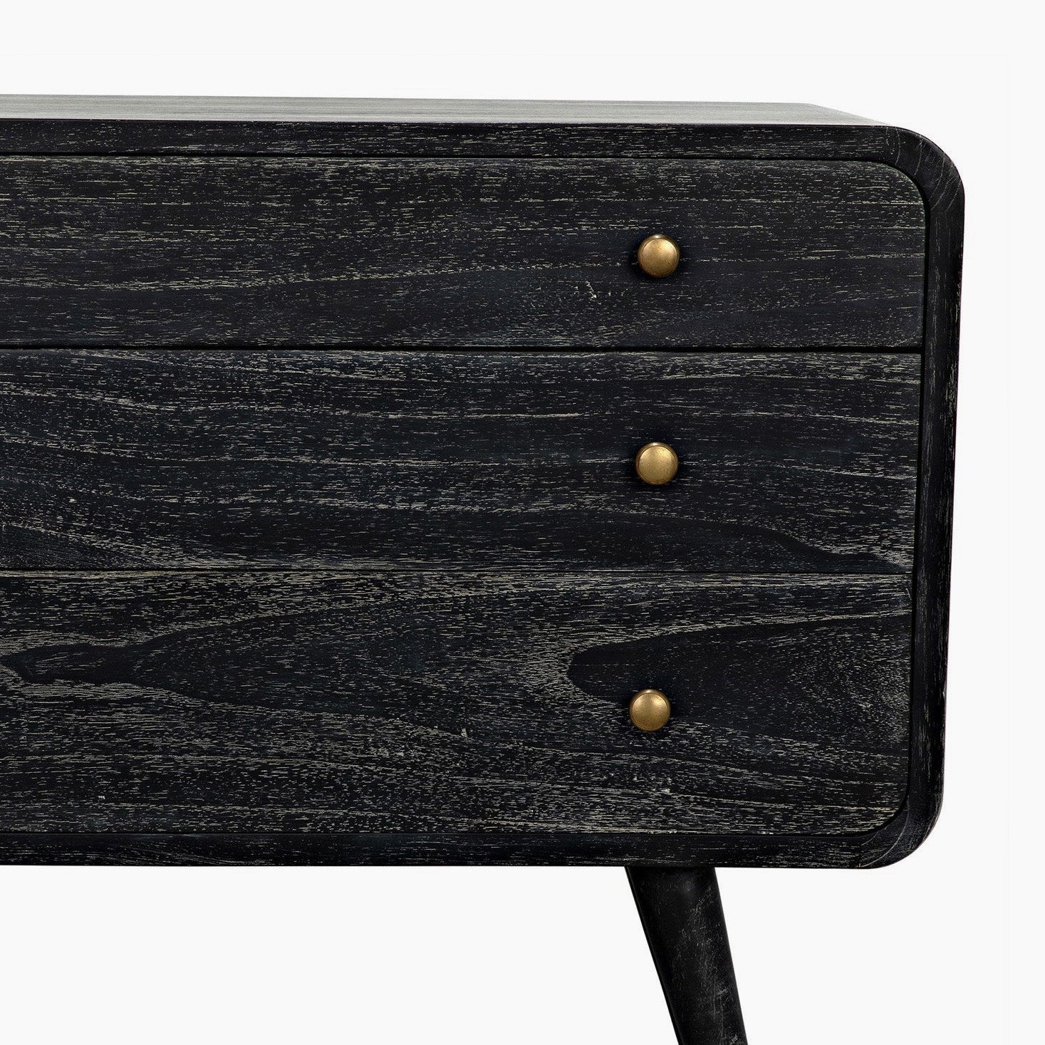 Mid-century modern with a dash of whimsy tossed in, this three-drawer chest finishes its retro-futuristic deign with a surprisingly modern natural finish, allowing the grain of the mindi wood free reign.