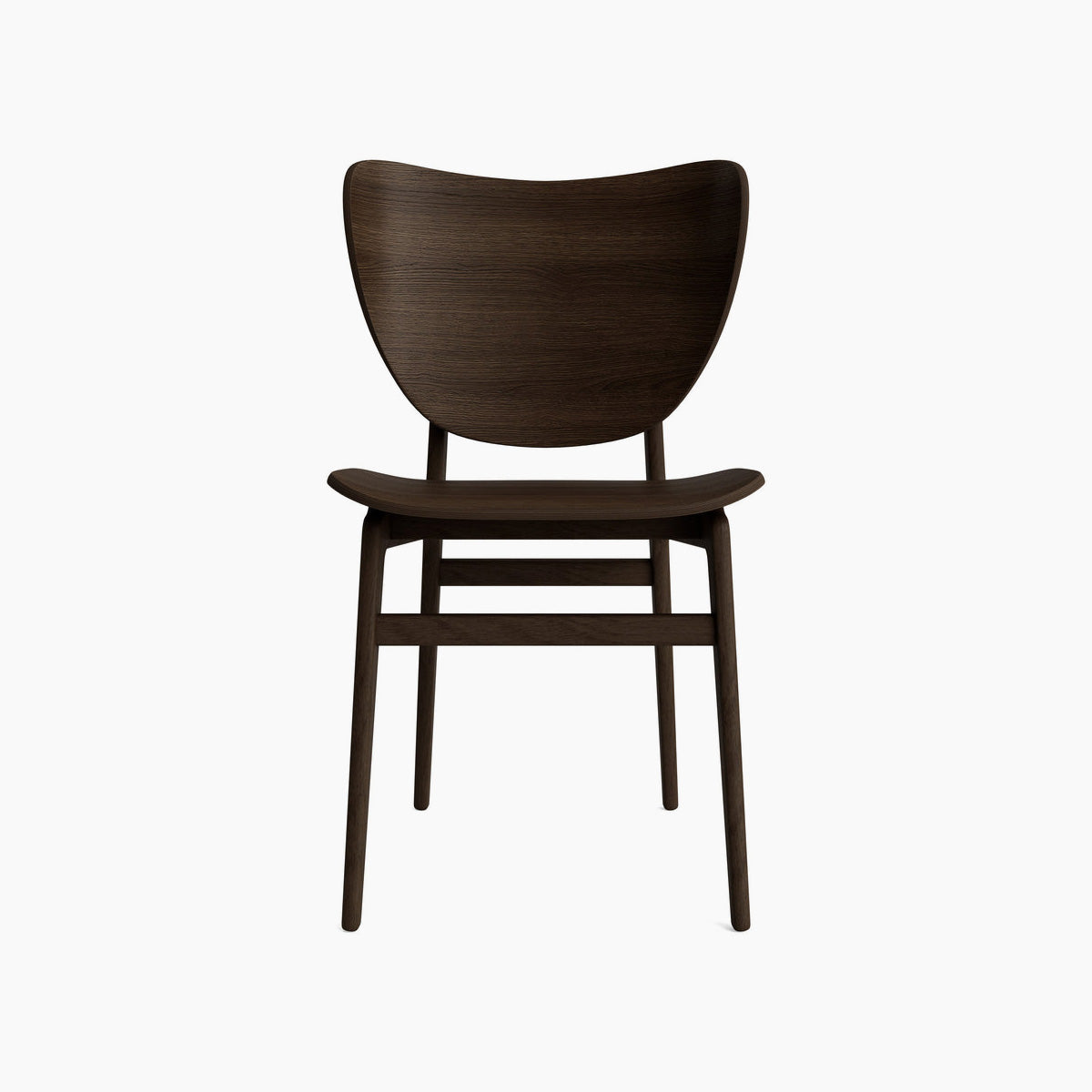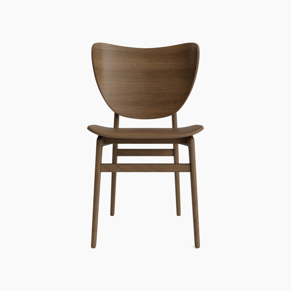 The soft curves of a lounge chair have a gently curved back and a sculptural wooden base for a comfortable seating experience.
