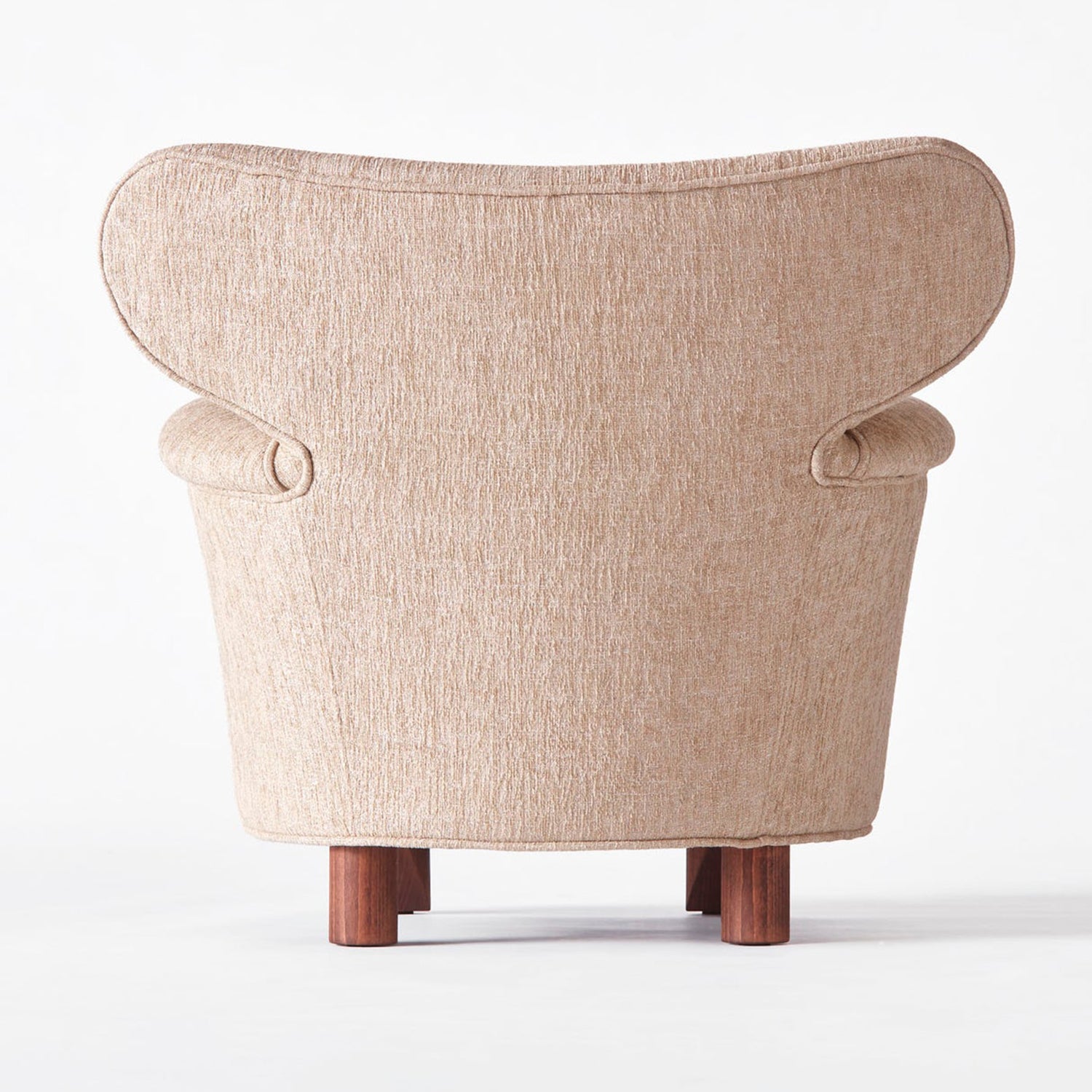 The Elias armchair is characterized by its rounded corners, seat and slightly curved feets. The frame is made of plywood, upholstered with several layers of foam for good