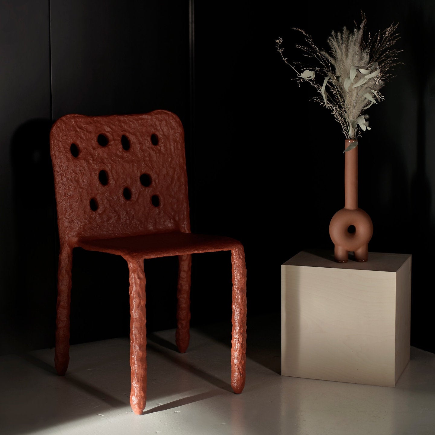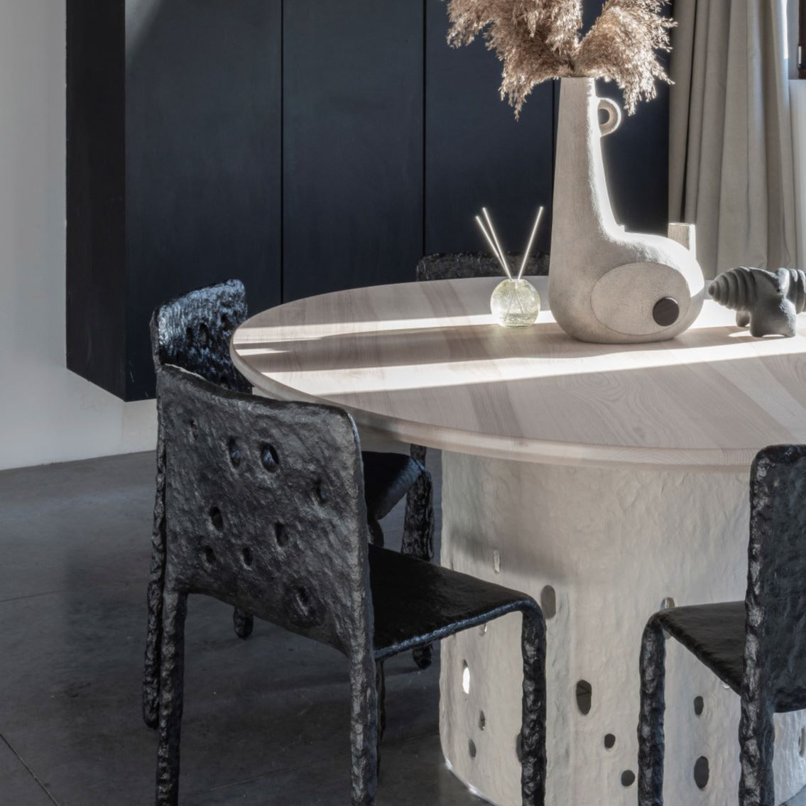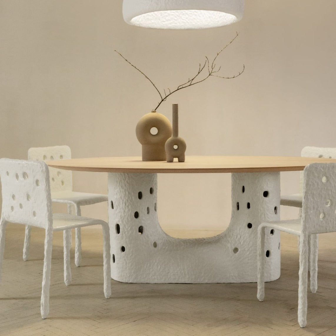 'ZTISTA' means 'made of dough' in Ukrainian. Combining a modern plastic silhouette with a primitive, kneaded form, this chair, as its name suggests, takes us back to our childhood days of making imaginary objects out of clay. It is also suitable for outdoor use, and can be stacked for storage, providing excellent space utilization.