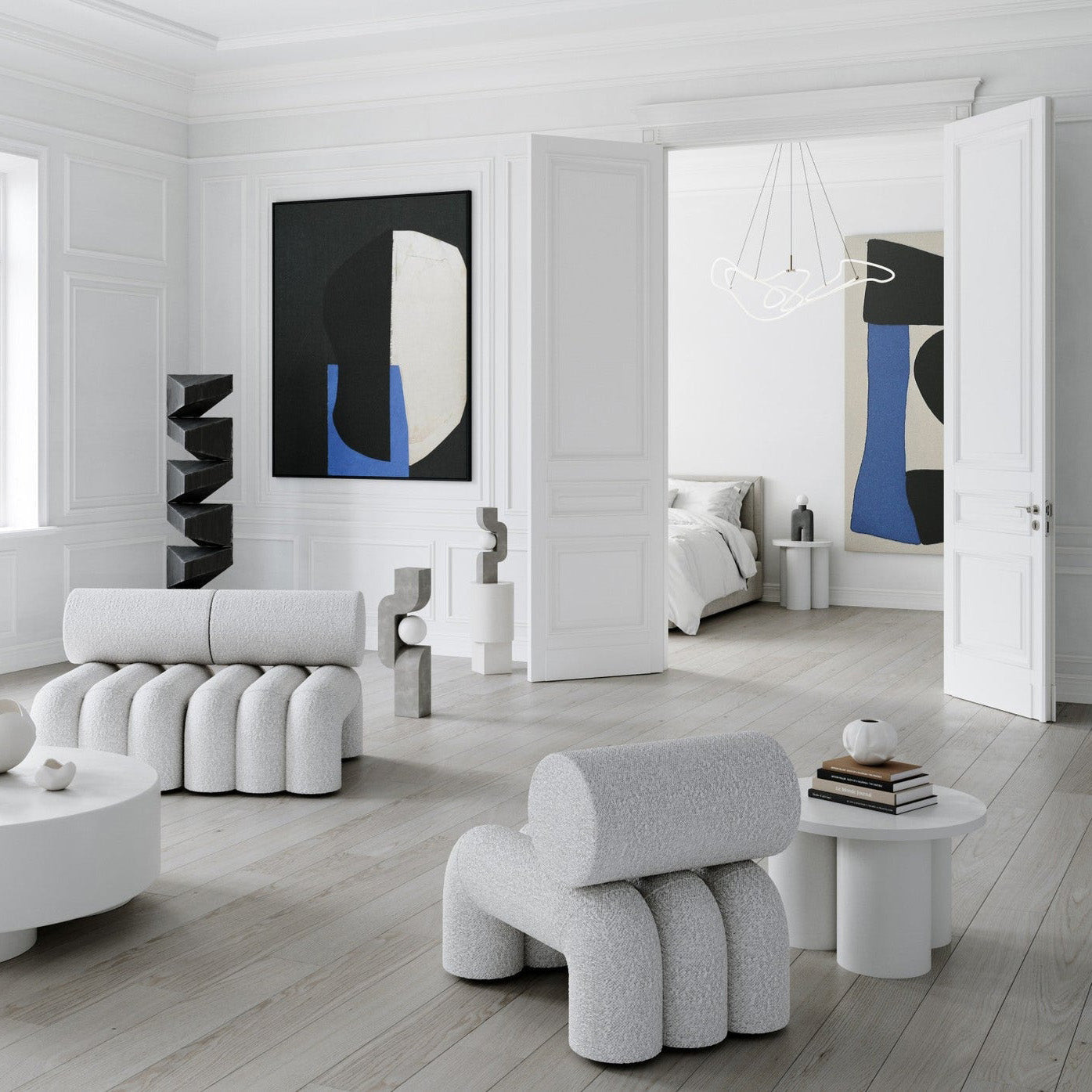 Several layers of carefully chosen foam types is combined to ensure a soft and highly comfortable seating experience, as well as emphasizing the sculptural and voluminous shapes of the chair. Combine several Foku Chairs to create a sofa lounge seating. Each Foku Chair includes two metal brackets, which can be mounted underneath the legs with a small screw. Foku comes in Off-White Bouclé and a Taupe fabric from Sunproof. The Taupe Sunproof fabric is suitable for both indoor and outdoor use. The fabric is highly resistant to stains, water, and sunlight, making it very easy to clean as well.