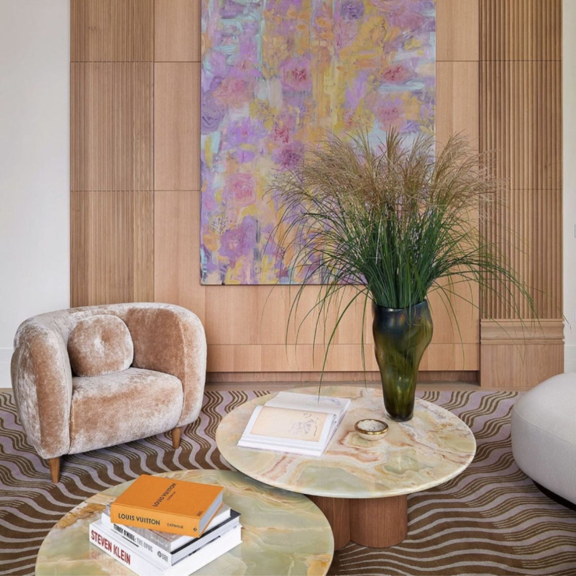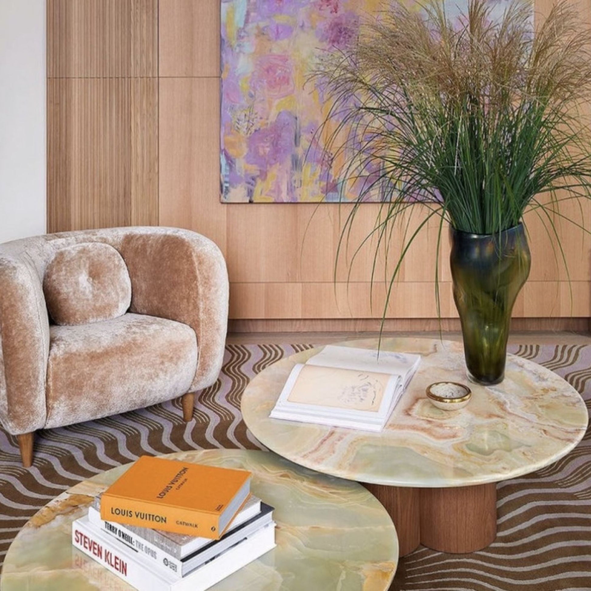 Introducing the Gianni Coffee Table: a single round green onyx top supported by walnut wood legs, with four small round legs underneath. This fusion of natural elements exudes timeless elegance, offering a warm and sophisticated addition to any living space. Experience the perfect blend of style and functionality with this exquisite coffee table.