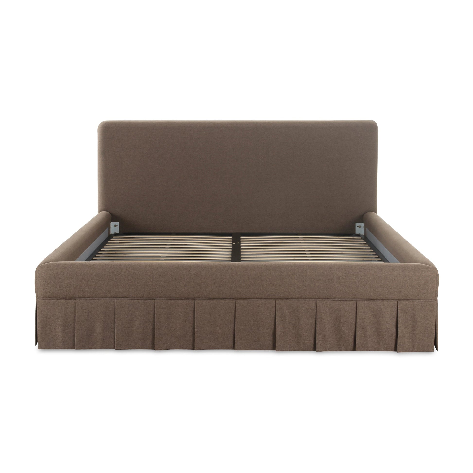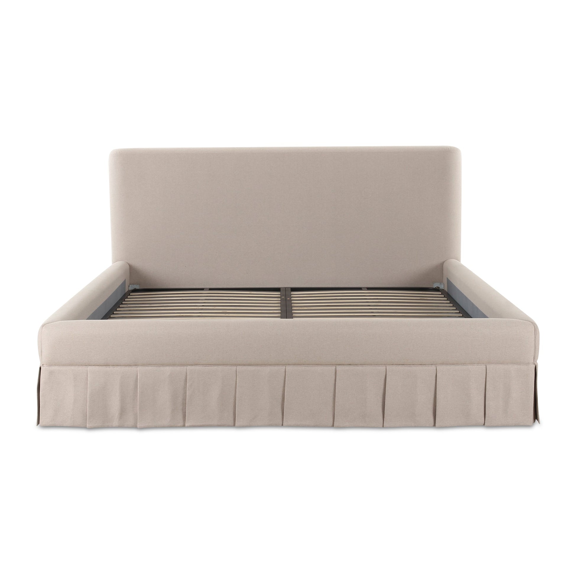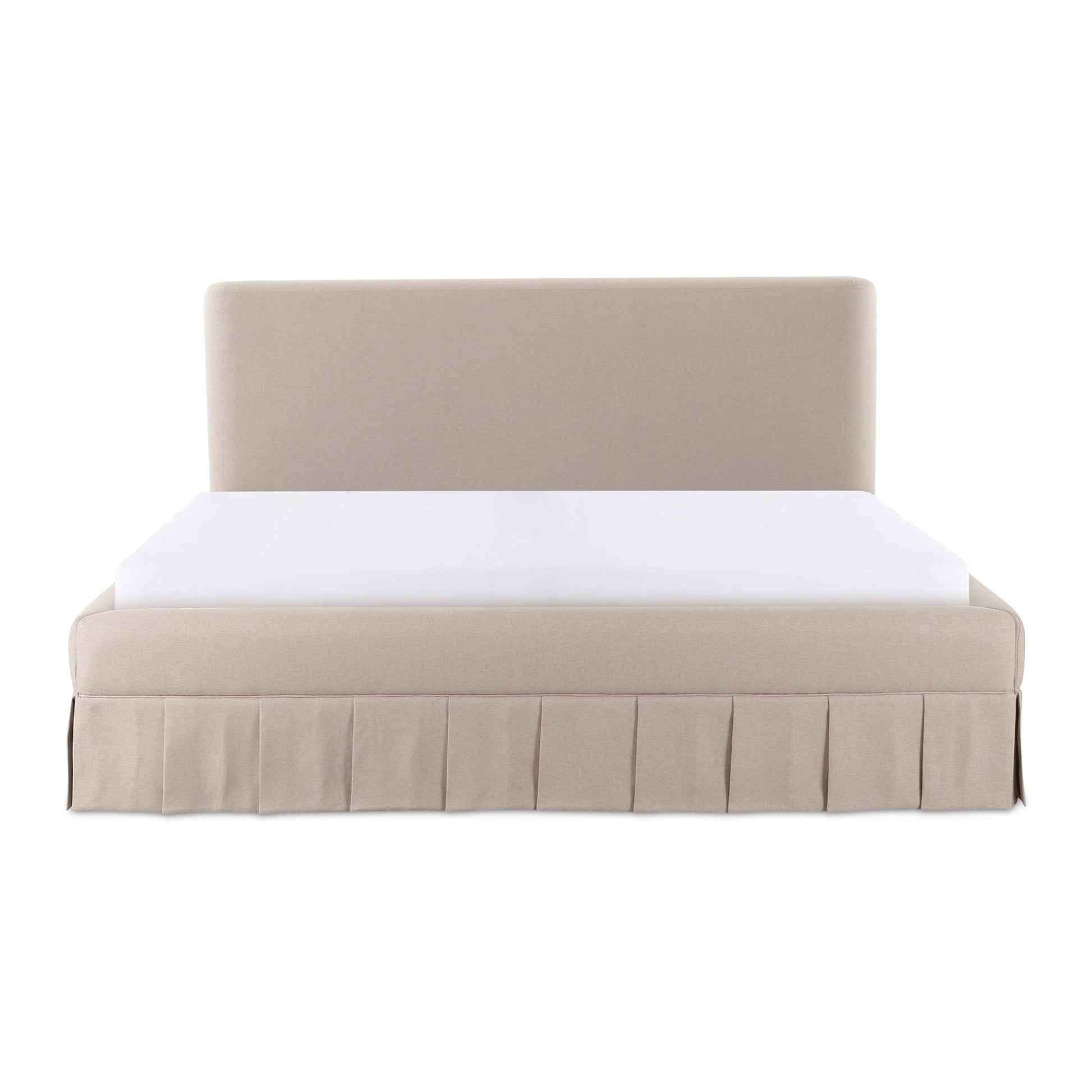 The Jane queen bed exudes a soft, feminine aesthetic, upholstered in a warm, neutral fabric and featuring a playful yet refined box pleat base reminiscent of vintage finesse, straddling the line between contemporary form and traditional finish. With smoothly rounded corners and graceful, curving forms adding softness to the design, this piece is a study in elegance and subtlety.