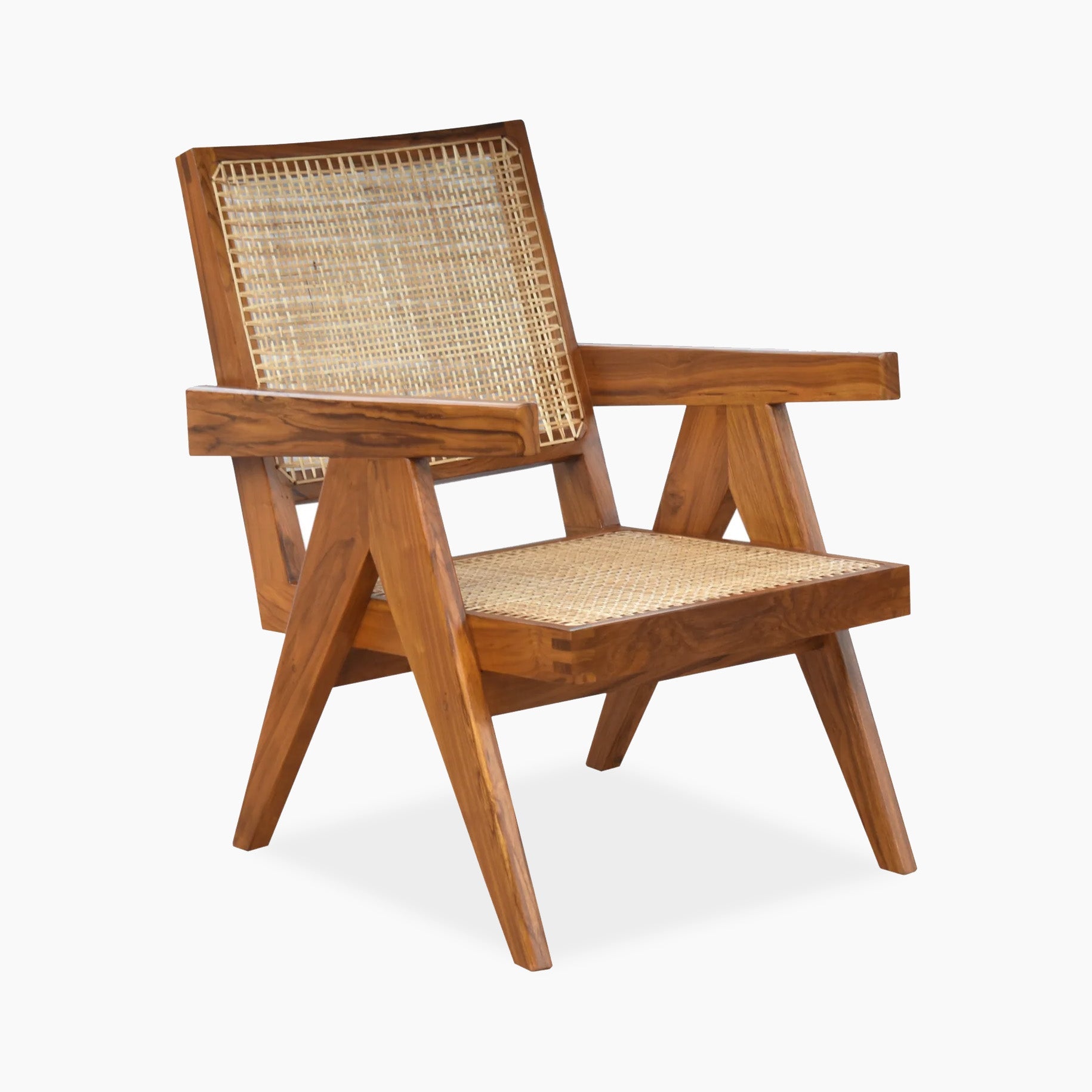 This Lounge Chair, in its perfectly balanced geometry, made with comfortable, natural teak and wicker, offers ideal form and function. All our pieces are handmade using the same materials and techniques used during the Chandigarh master plan in the 1950s.