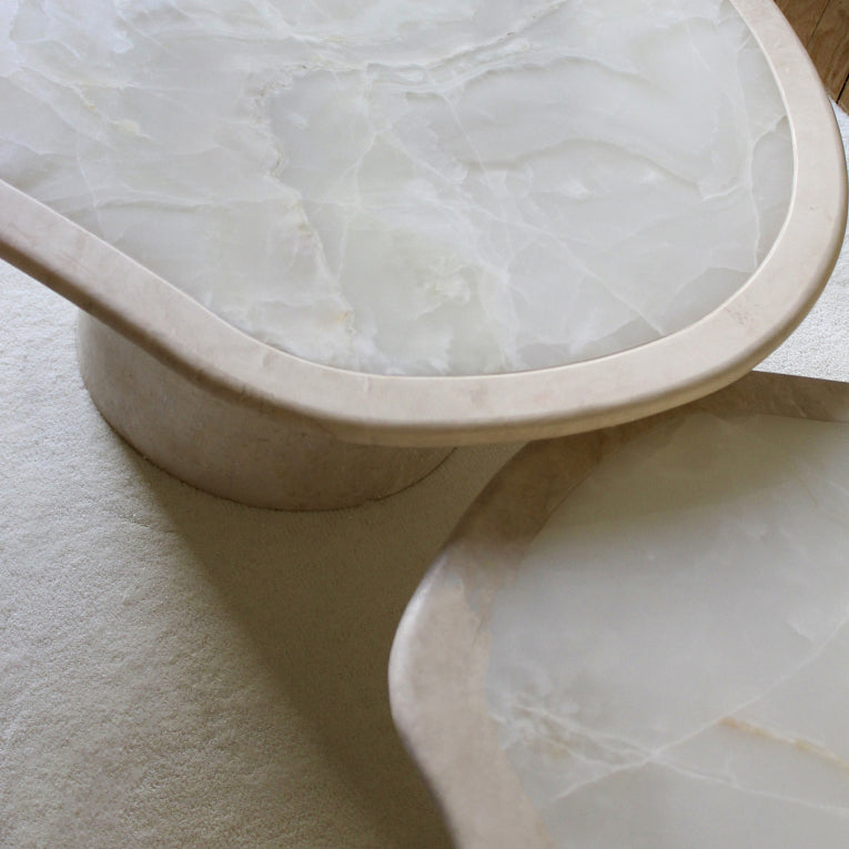 The Joan coffee table is defined by two organic shaped tops with a mix of travertine and white onyx. The round bases are made of travertine.
