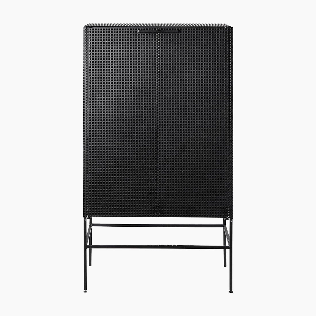 The Grid Cabinet is made of perforated steel. The Grid Cabinet is perfect for storing books, objects, or dishes and the see-through aspect keeps the piece looking light whilst allowing a glimpse of the pieces that are stored inside. An elegant large cabinet with a transparent design. Use it for exhibiting accessories or as a remarkable spacious yet light storage unit.