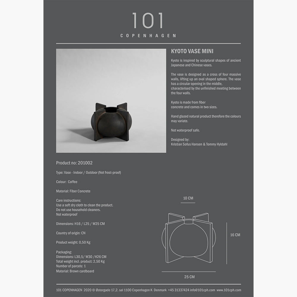 Kyoto is inspired by sculptural shapes of ancient Japanese and Chinese vases. The vase is designed as a cross of four massive walls, lifting up an oval-shaped sphere. The vase has a circular opening in the middle, characterized by the unfinished meeting between the four walls.