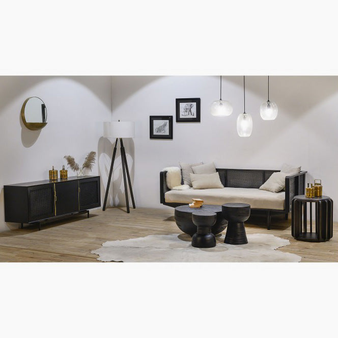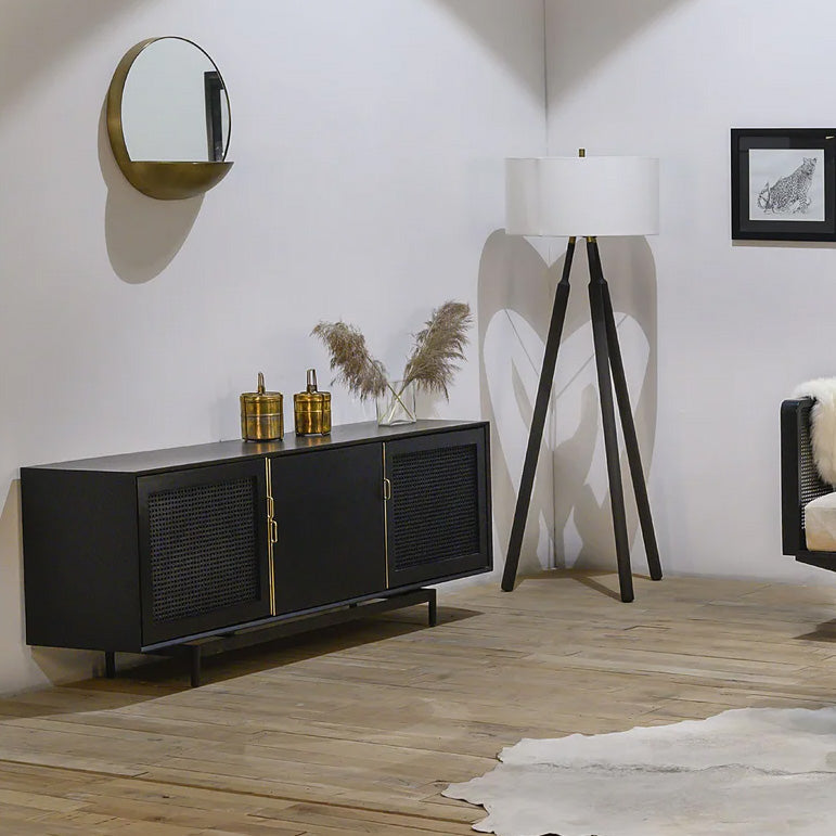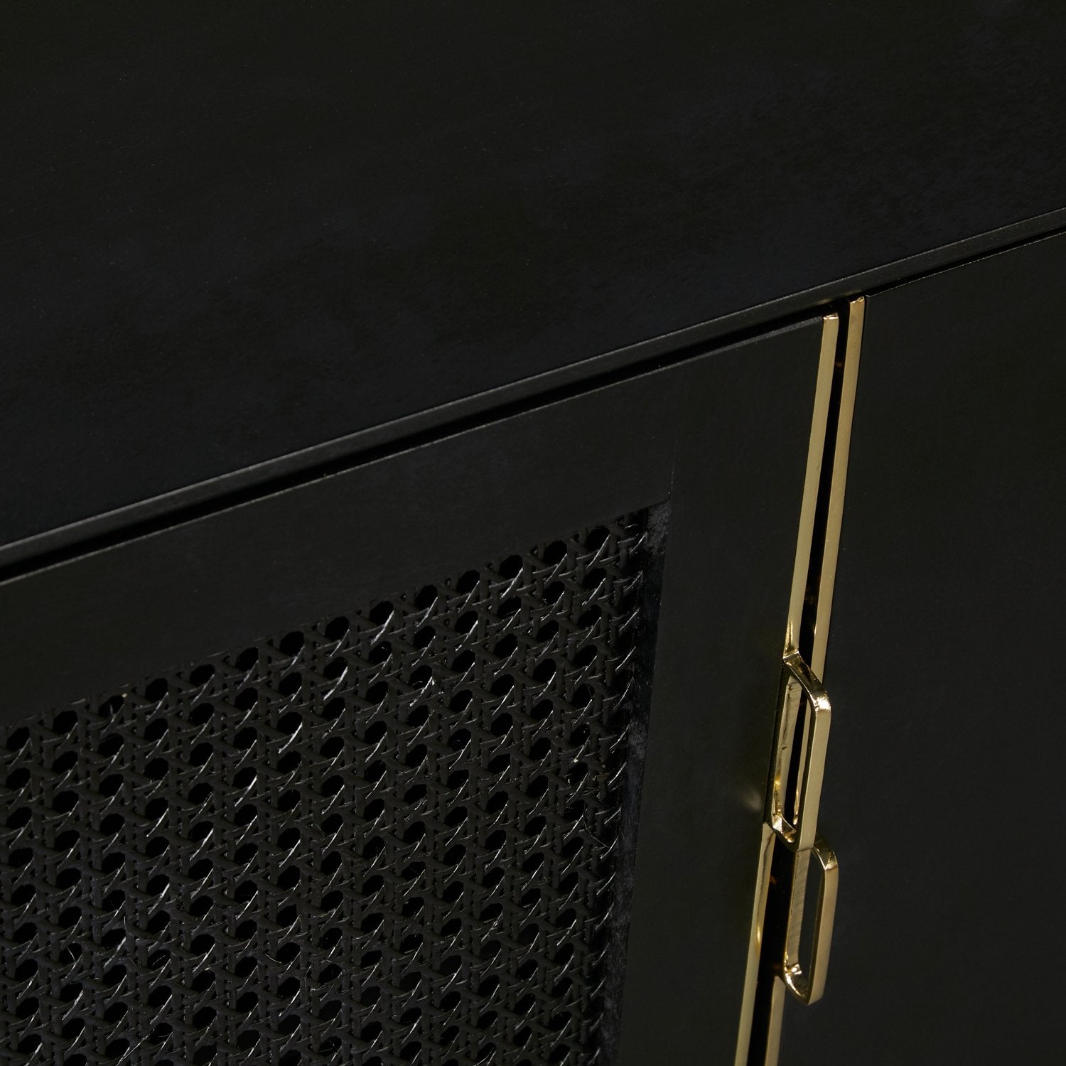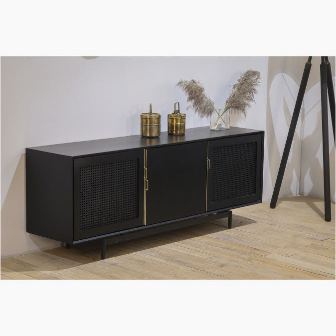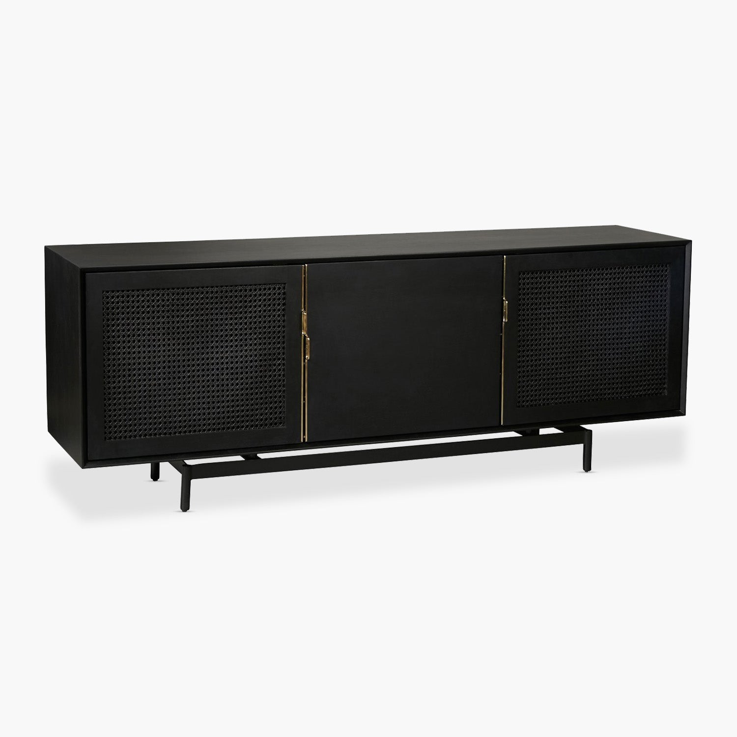 Our Lafayette media cabinet features cane mesh doors and provides ample storage. The brass-plated, full-length door pulls add a touch of sparkle.