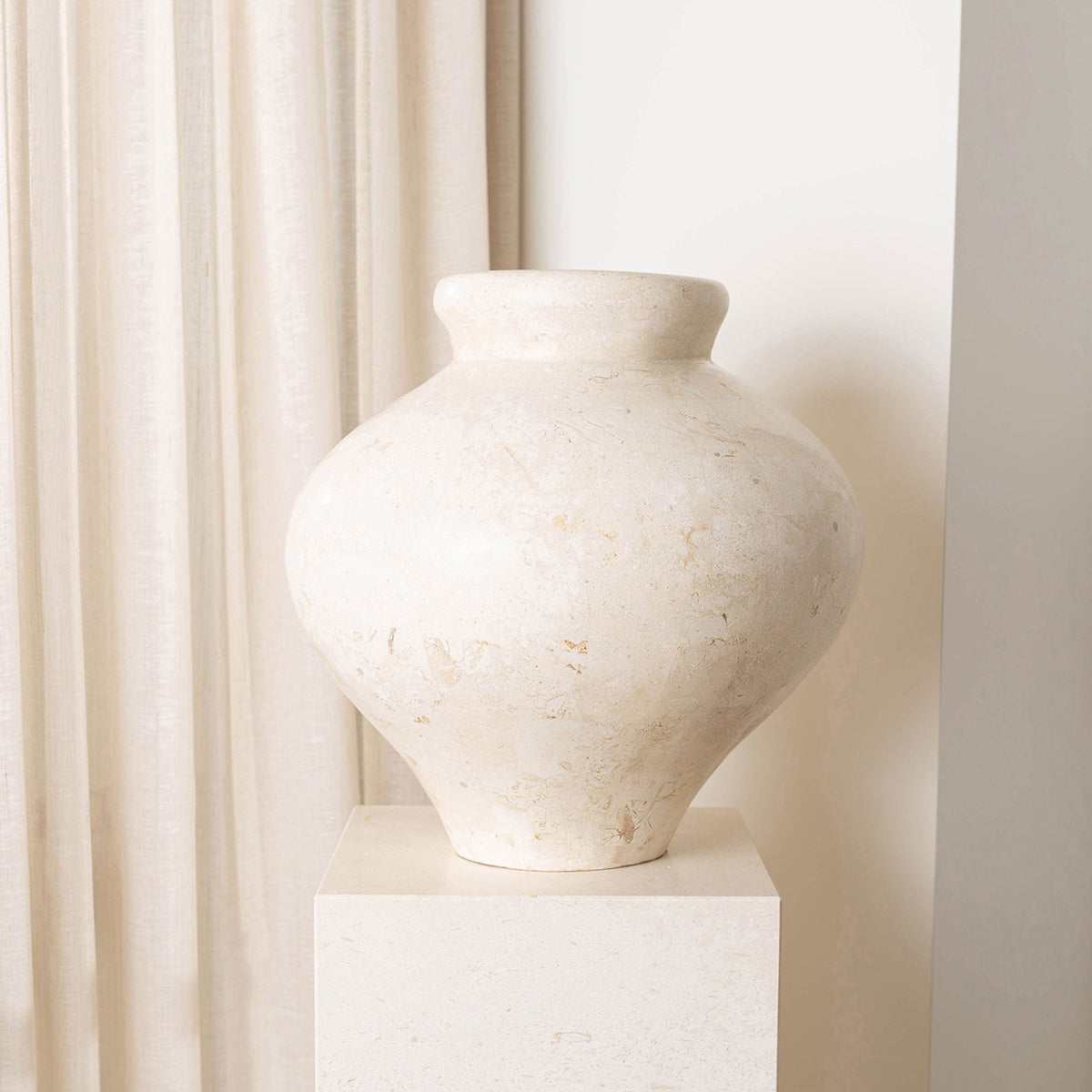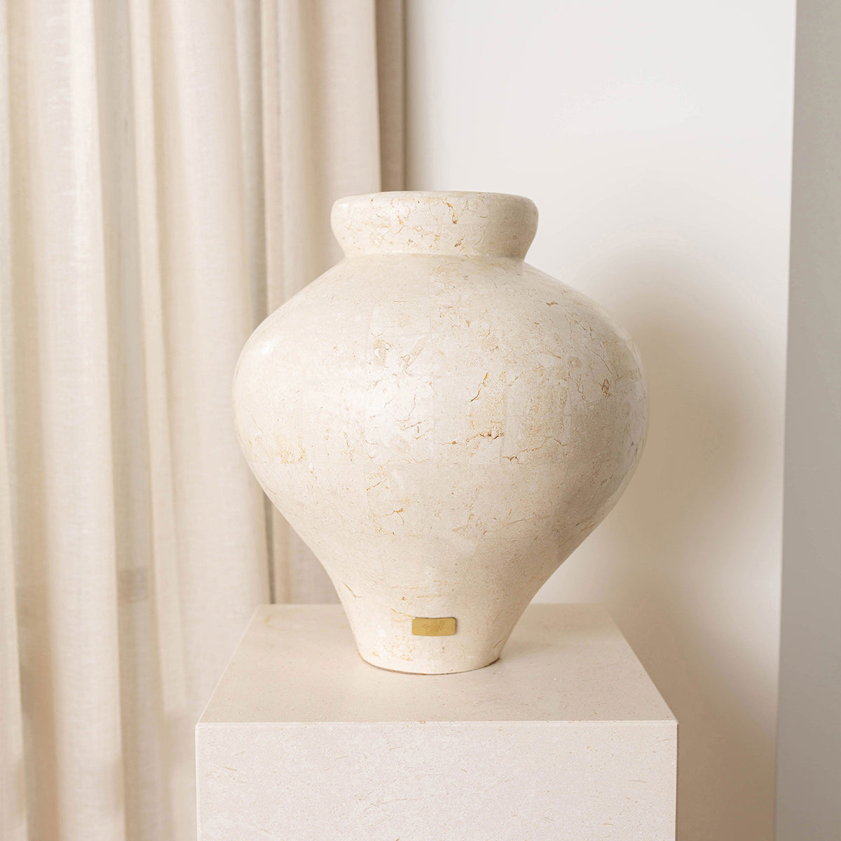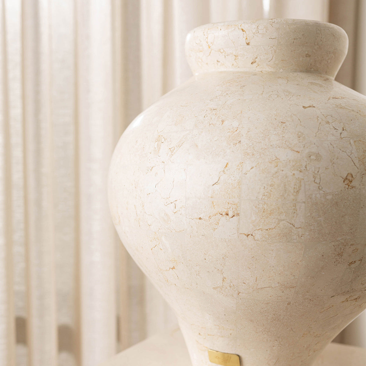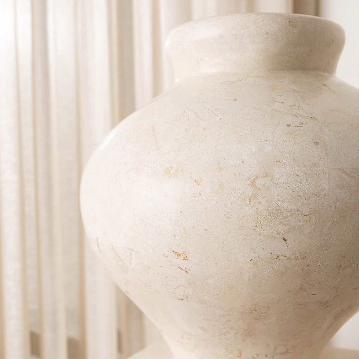 Classic and timeless, our Laguna Vase has been crafted with an intentionally irregular form mirrored from the hand drawn design. Each intricate natural stone tile has been skillfully aligned showcasing our signature Fossil Stone artistry.