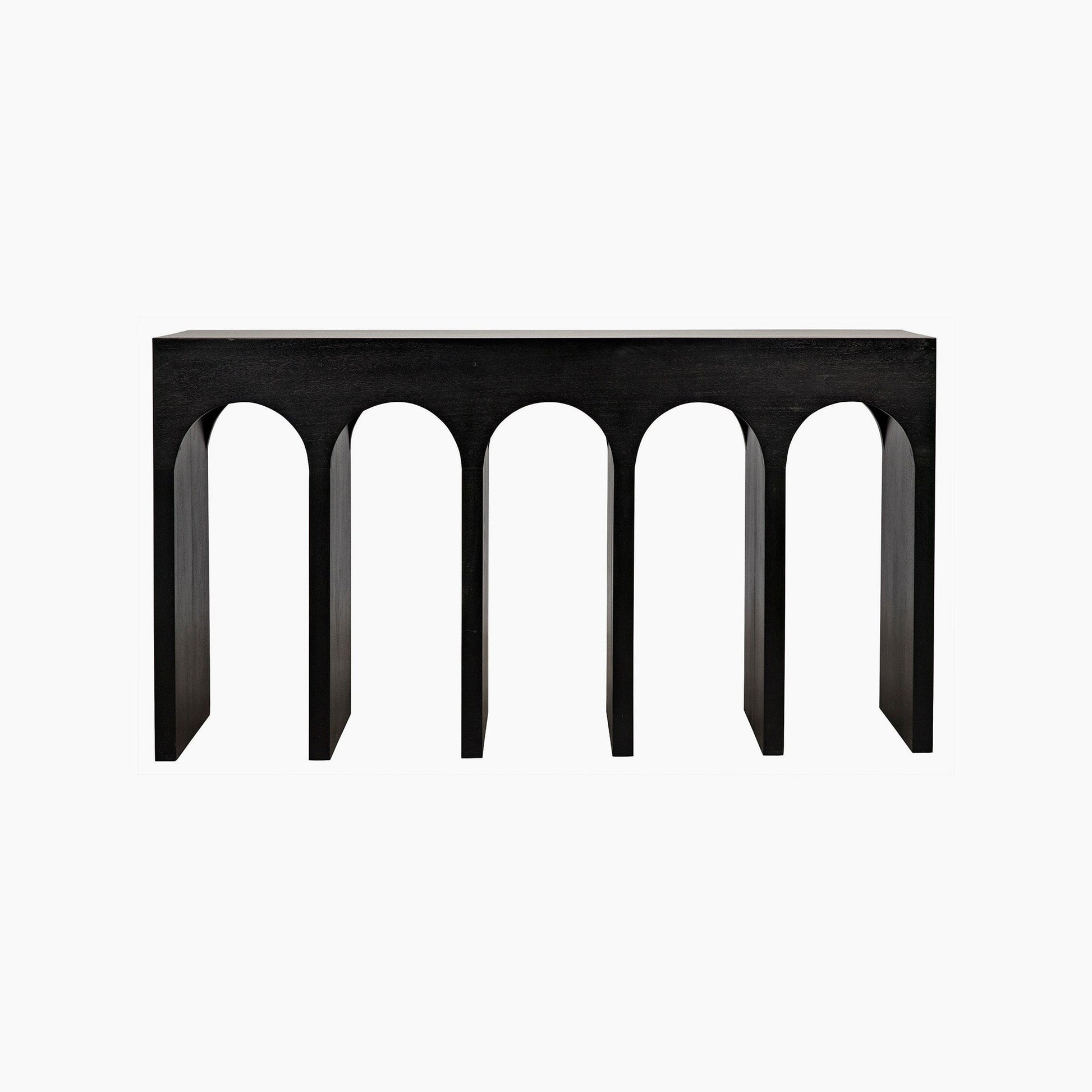This stunning console takes its design inspiration from suspension bridges. Its graceful arches add interest without overwhelming, and its hand-rubbed black finish maximizes the mahogany's beauty,