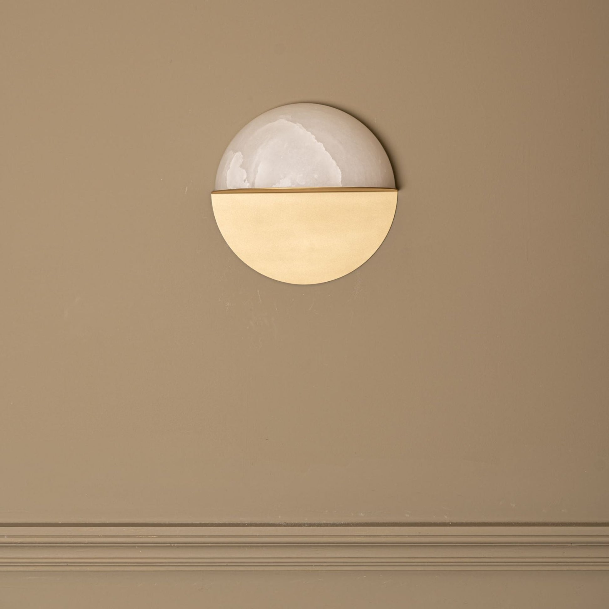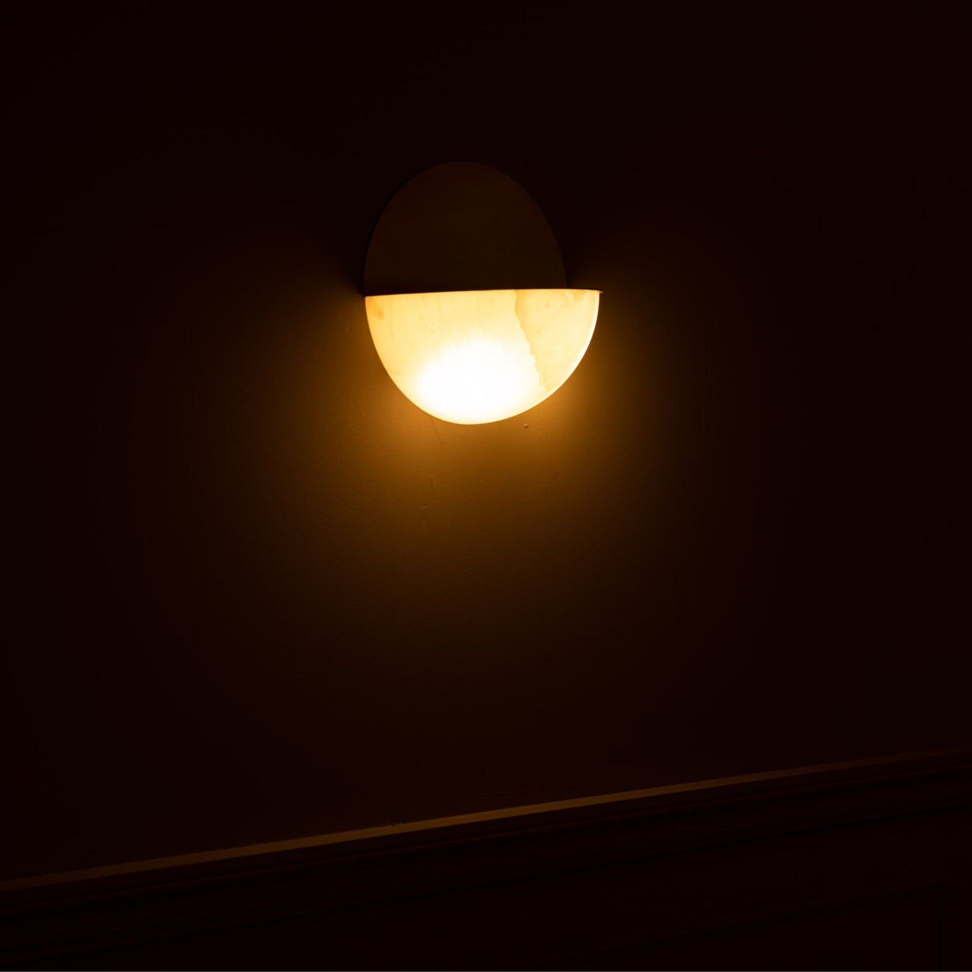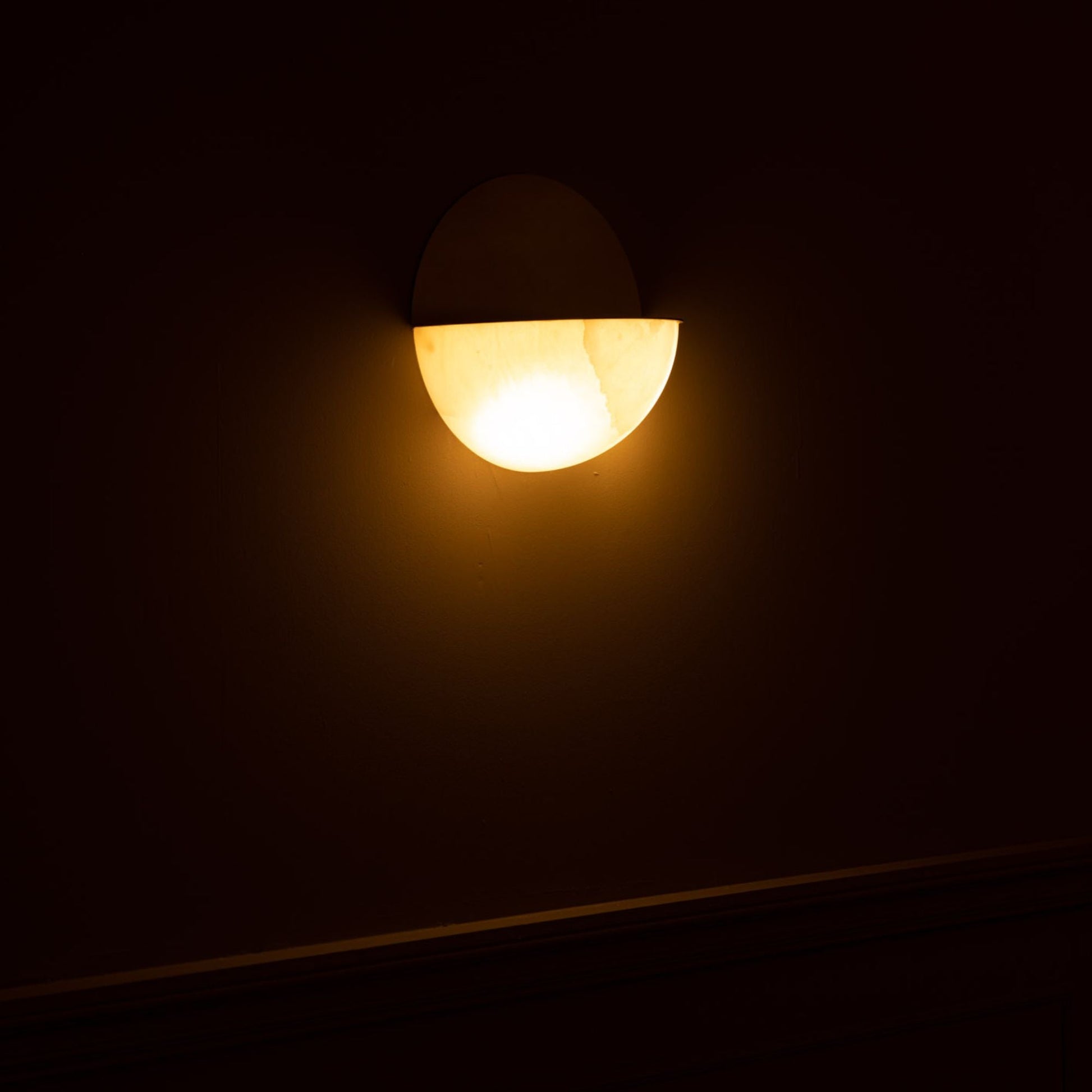 An alabaster quarter fused gracefully into a solid piece of brass, with a unique champagne sanded finish. The Luno sconce makes us travel to the moon and can be set in two different positions, up or down.