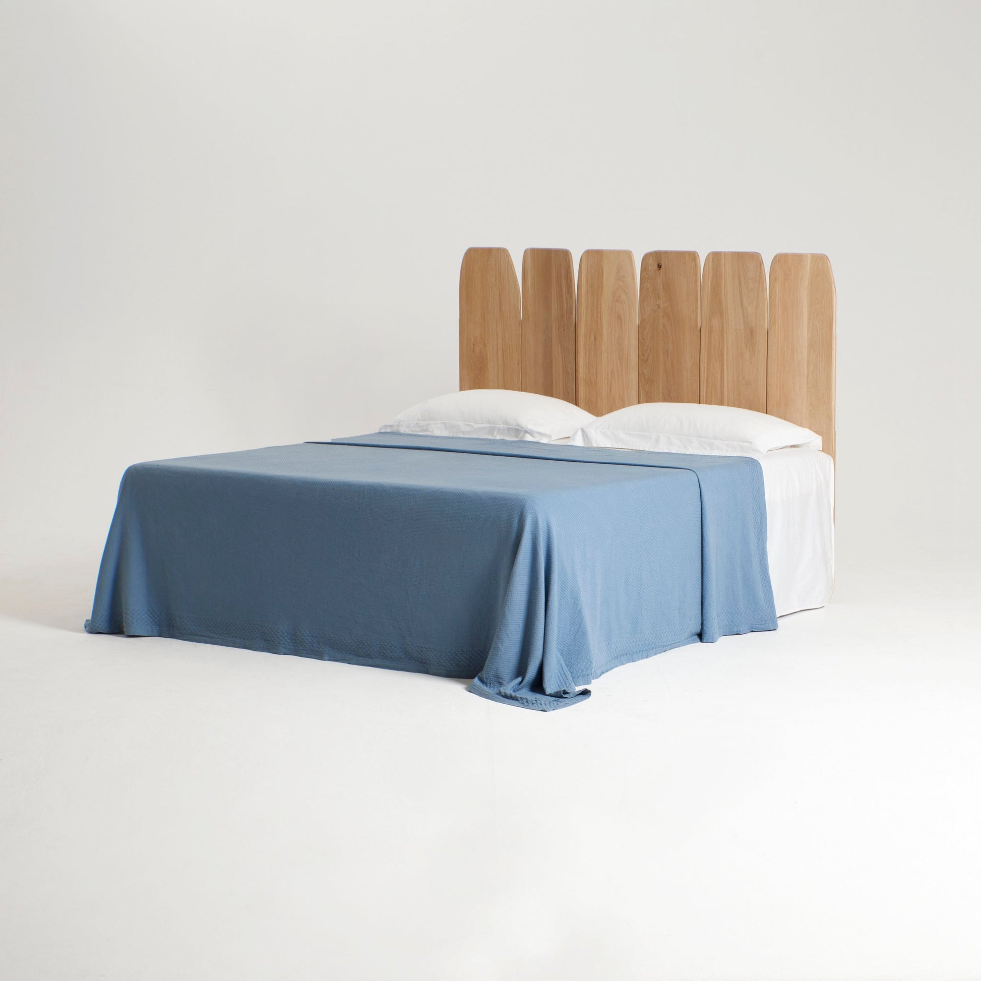 Finest walnut wood panels made alined and wallmounted to fit behind a kingsize bed.