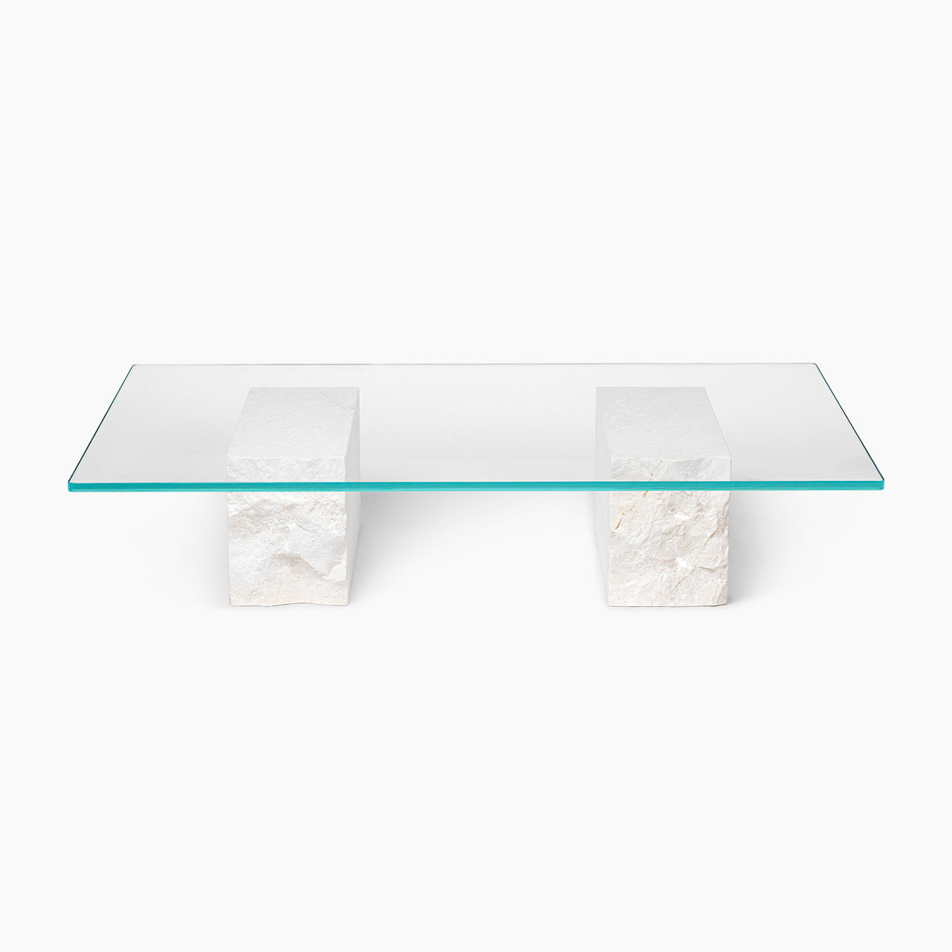 The beautiful, rectangular glass surface is simply placed upon two marble blocks which feature a rough edge providing a raw, untreated appearance.
