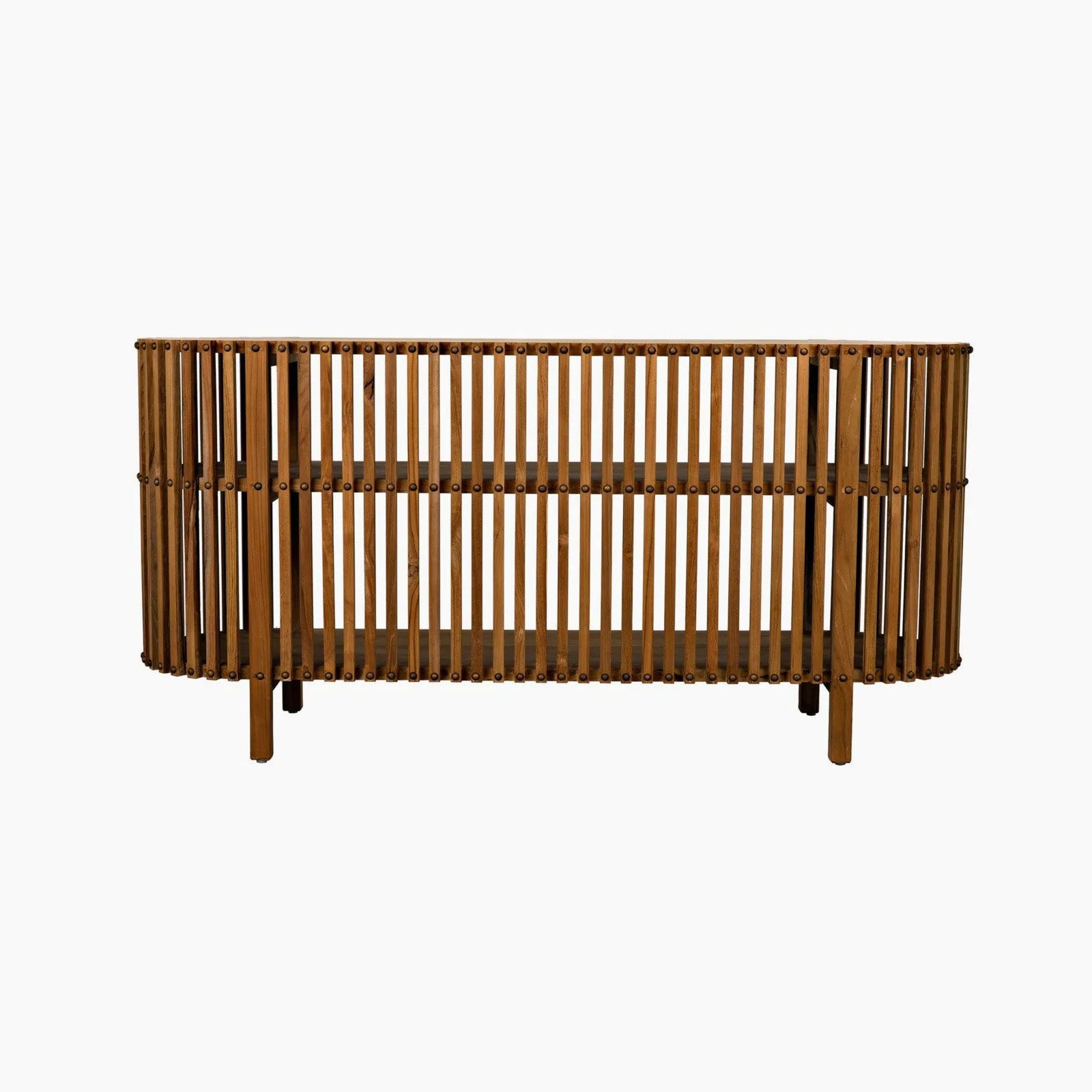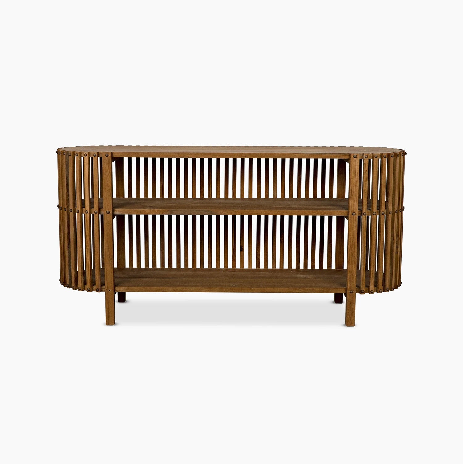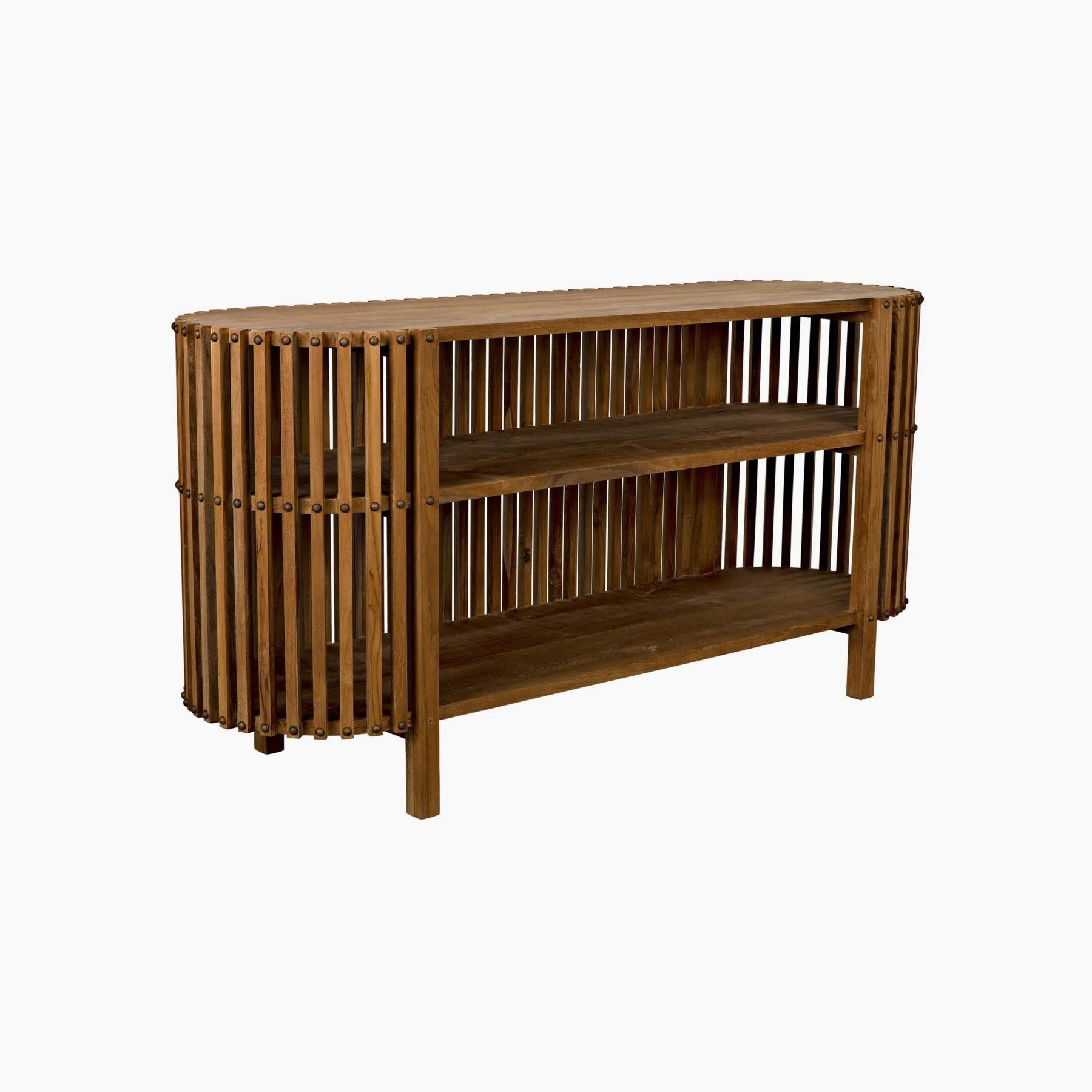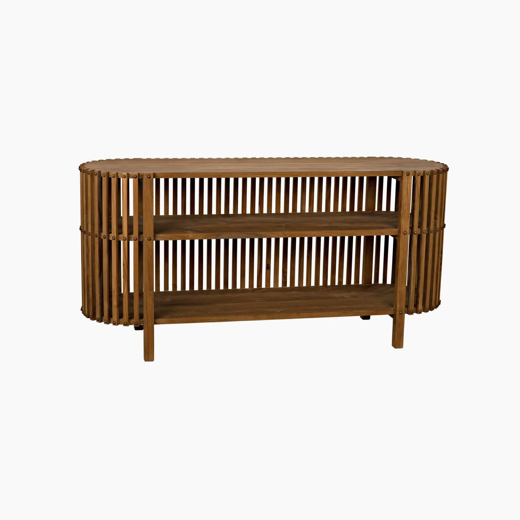 Subtly tropical and substantially stylish, this teak console has a natural finish that allows the woodÕs beauty to shine. Nailheads add interest to the curved sides and middle shelf and reach all the way around the fully finished piece.