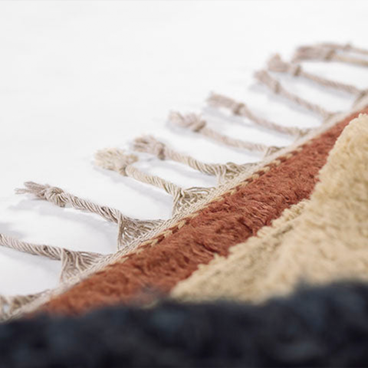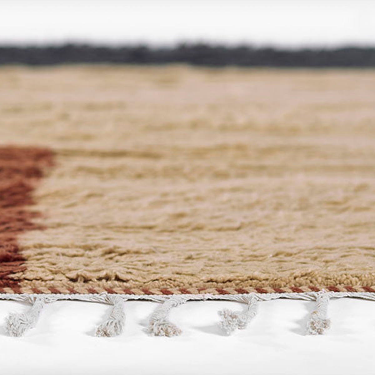 Unique and exaggerated one-sided tassel fringe adds a distinctive touch. Hand-sheared finish adds a tactile texture and dimension. Versatile enough to be used in various indoor spaces, including living rooms, bedrooms, dining rooms, hallways, and office rooms.
