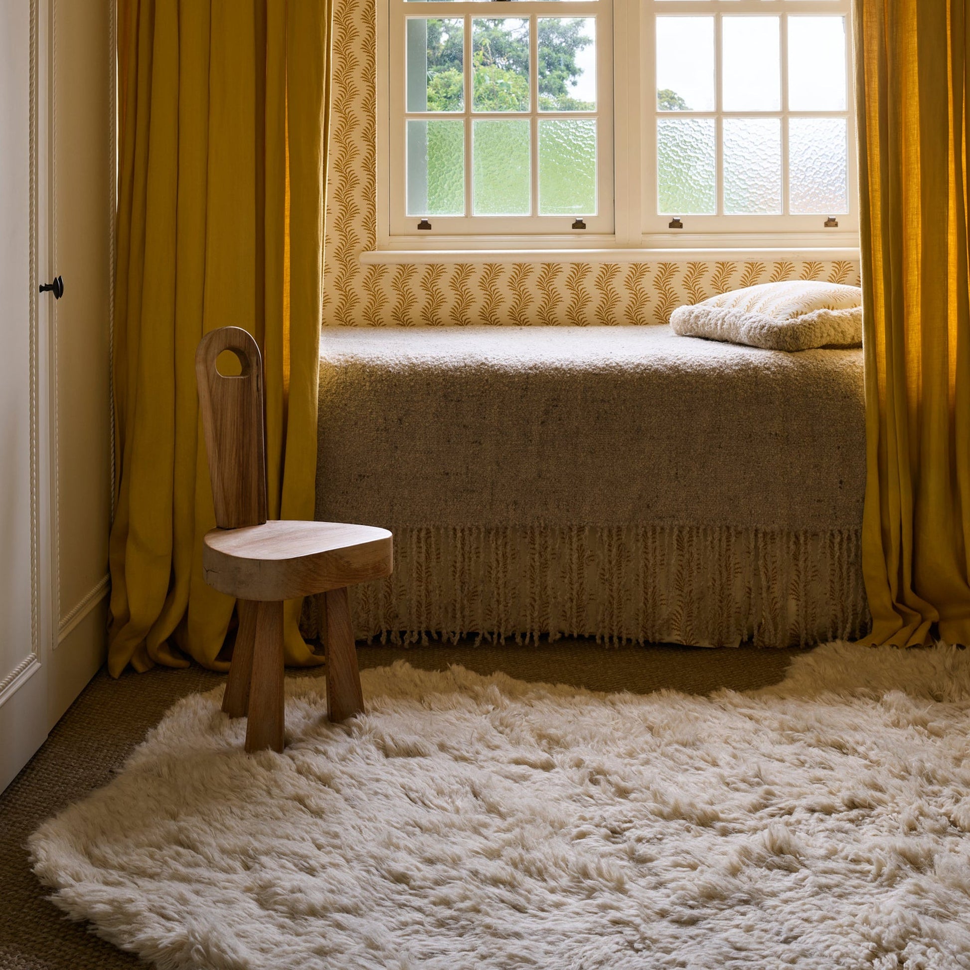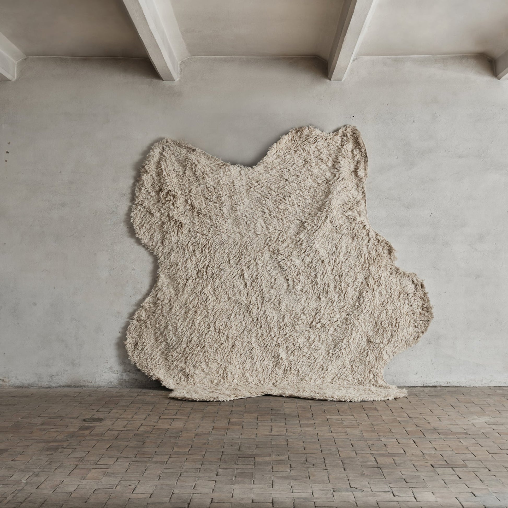 no.09 is a soft and artistic statement piece with an understated bohemian elegance. Its organic and irregular shape is created in a downy crème off-white wool. The rug is crafted from natural and unbleached New Zealand wool.