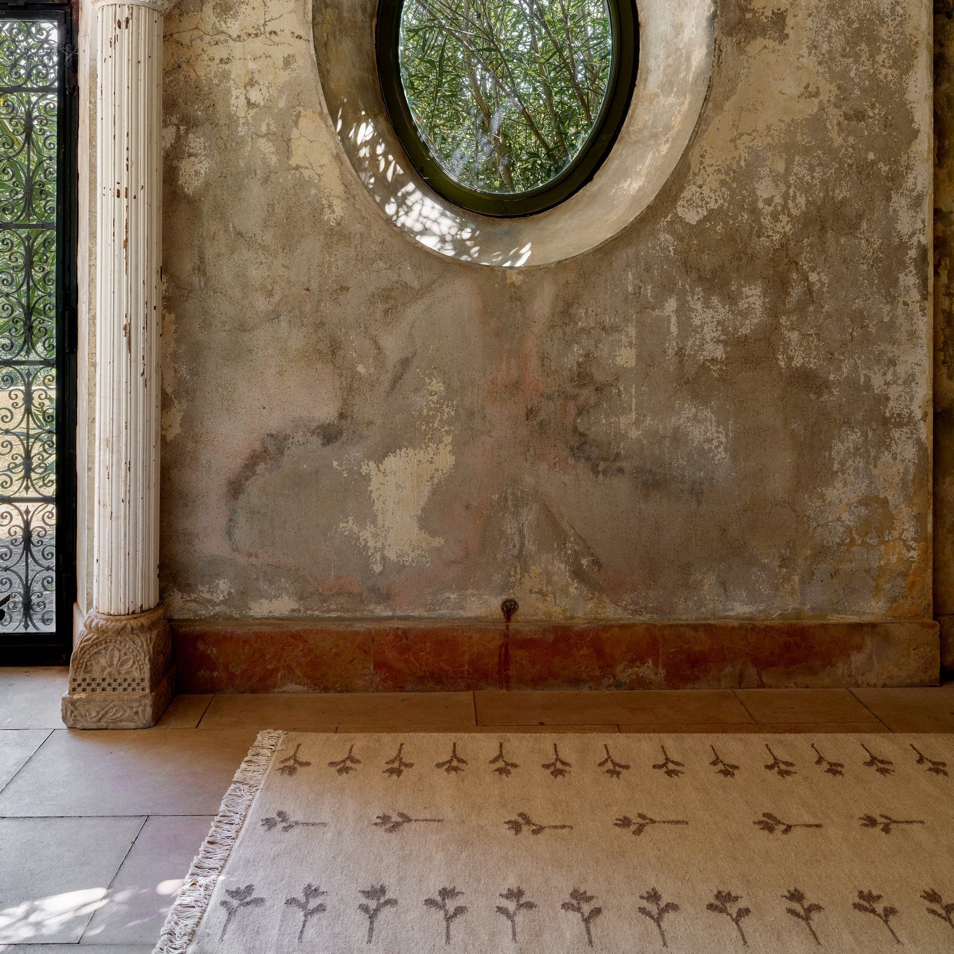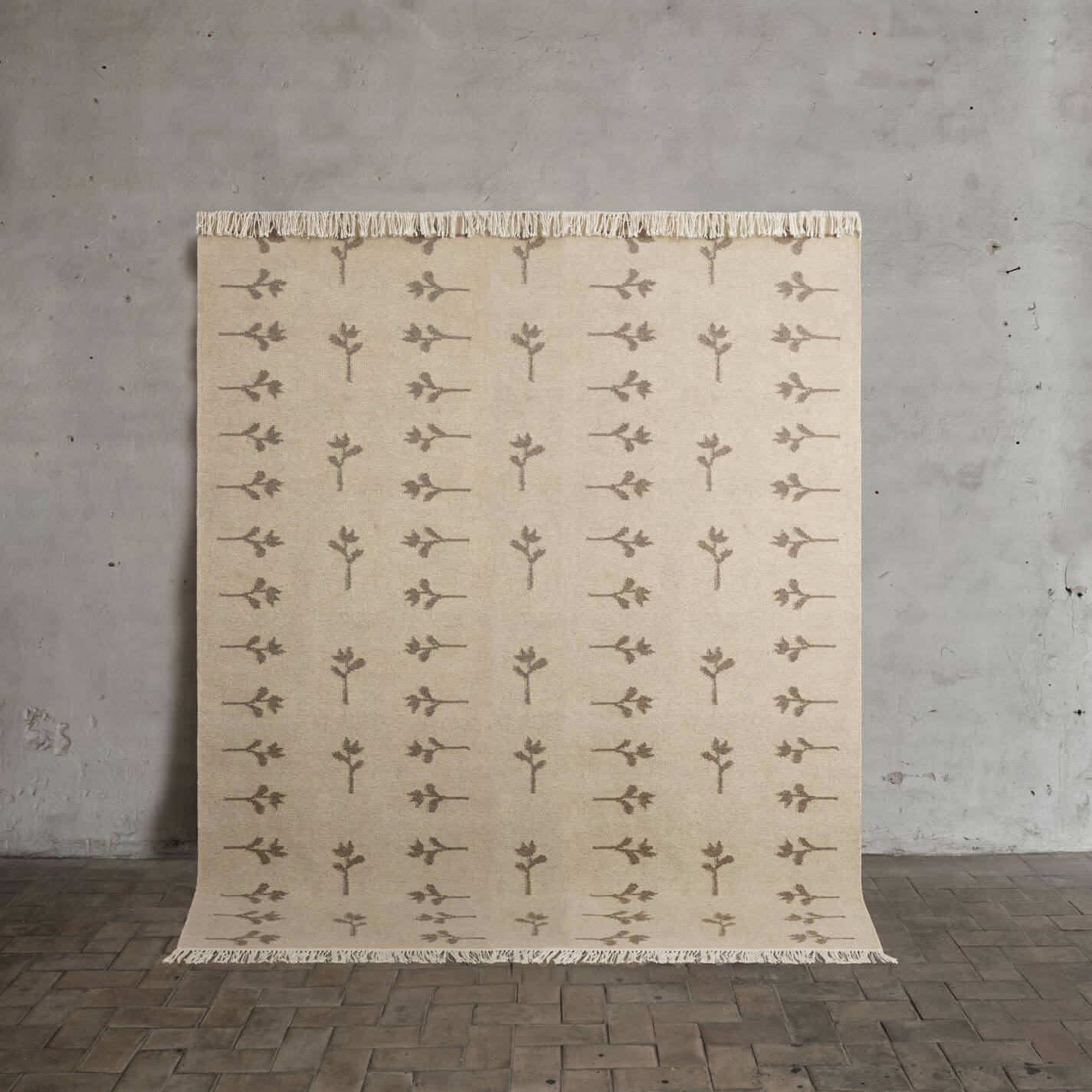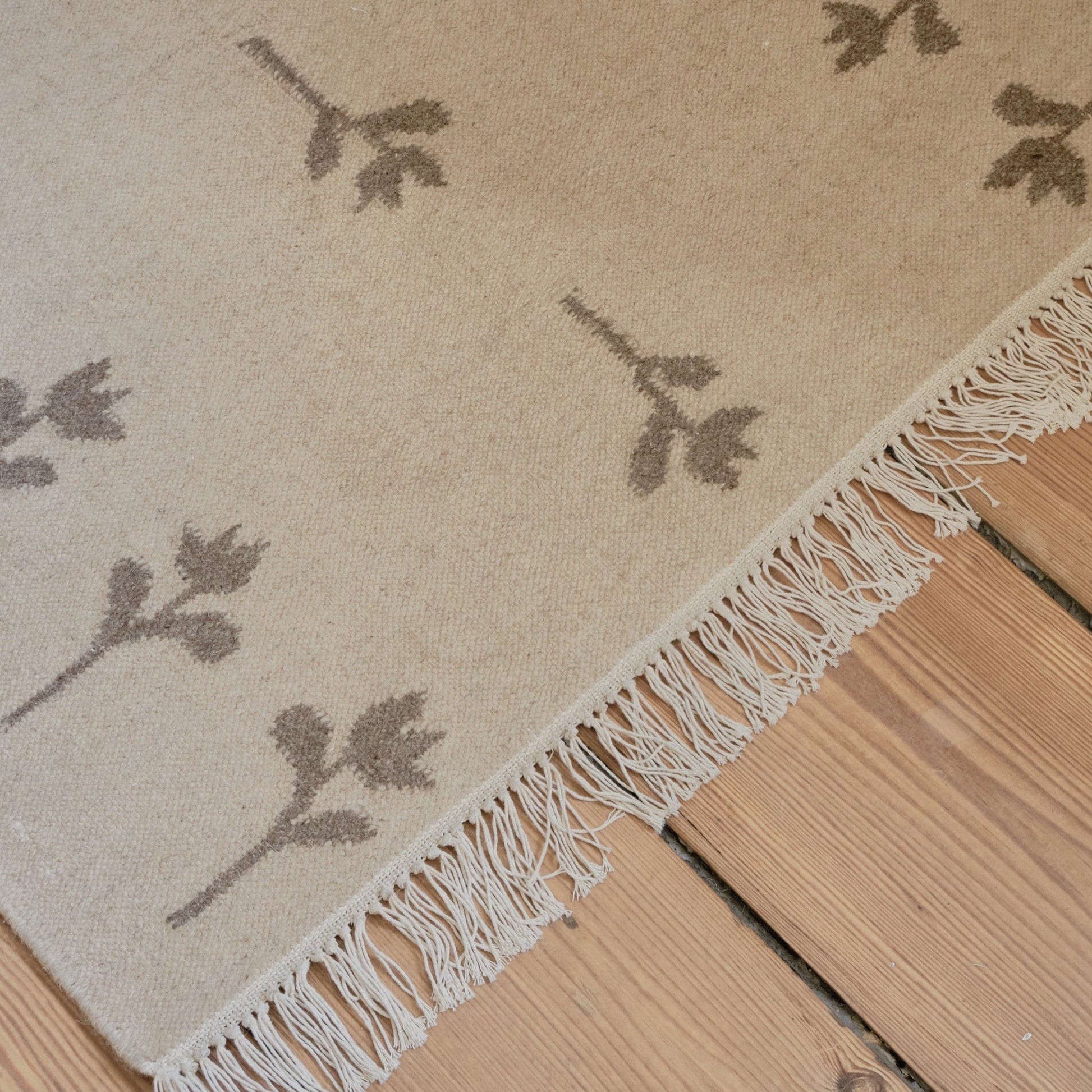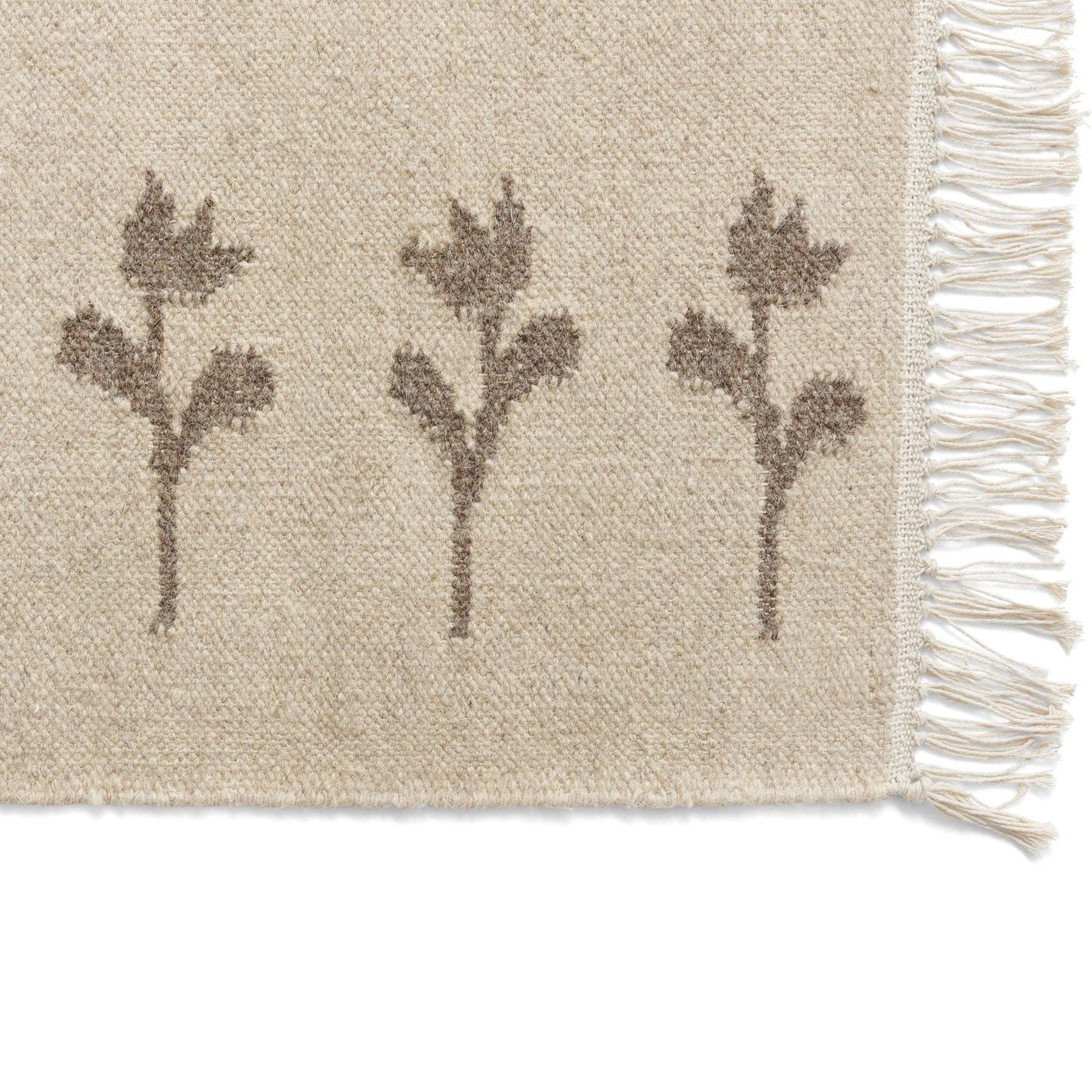 Rug no.17 is a light flat-woven, handmade rug in natural wool. The rug is designed in a mid-beige foundation with soft-brown woven flowers for a natural impression. The flowers draw inspiration from ancient Scandinavian tulip patterns that traditionally adorn everything from porcelain to carpets and curtains. A thin fringe row decorates the edges, providing a simple but important detail to the overall design.