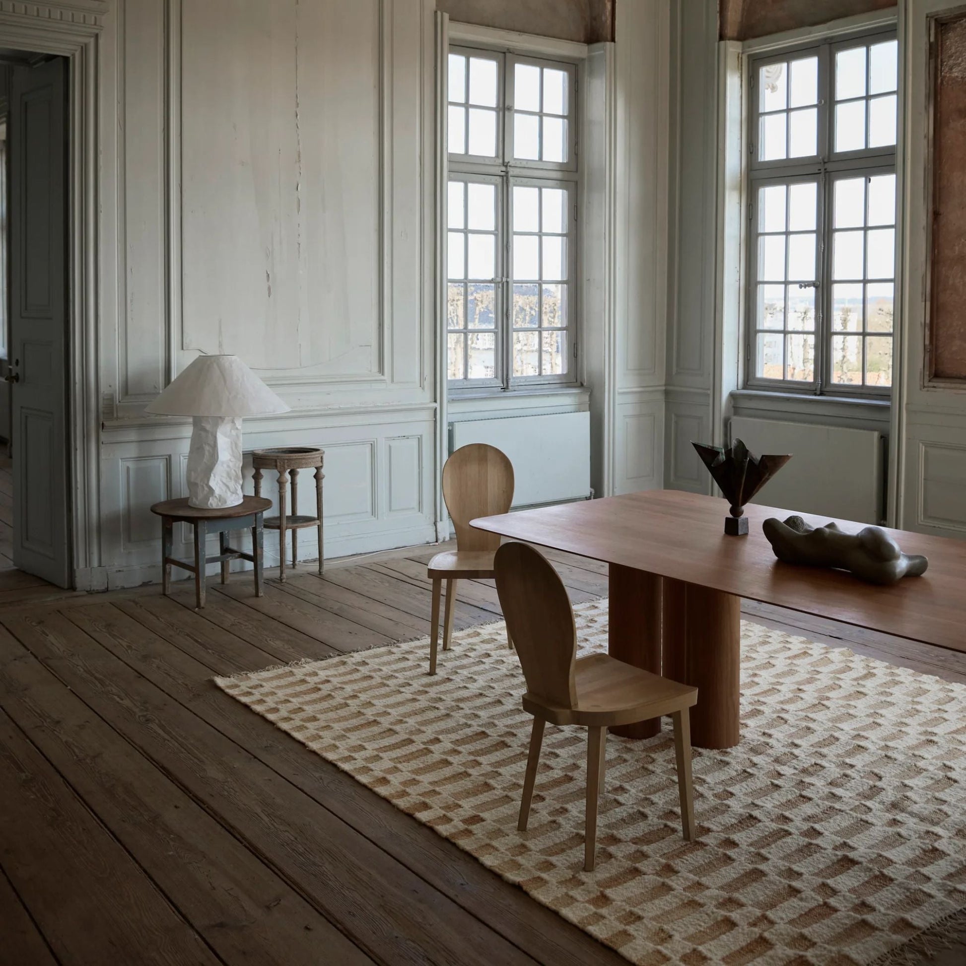 no. 23 is a light, flat-woven, handmade rug crafted from natural materials. It features a checkered pattern that combines natural jute with slub yarn in white natural wool. The mix of jute and slub yarn creates a three-dimensional look and feel, adding a unique touch to its classic, timeless design.