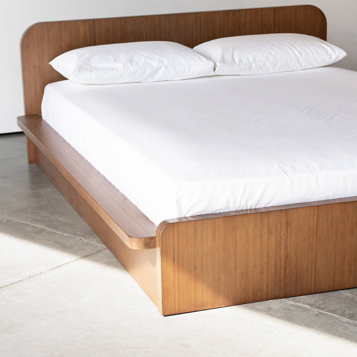 The Noura Bed is a platform bed designed around curved geometry to bring both functionality and calmness to the bedroom. The curved detailing extends from the headboard and footboard to each of the platforms, and protects from bumping ankles when the lights are off. The side platforms can fit phones and small objects, and the headboard is designed for perfect pillow-assisted resting.