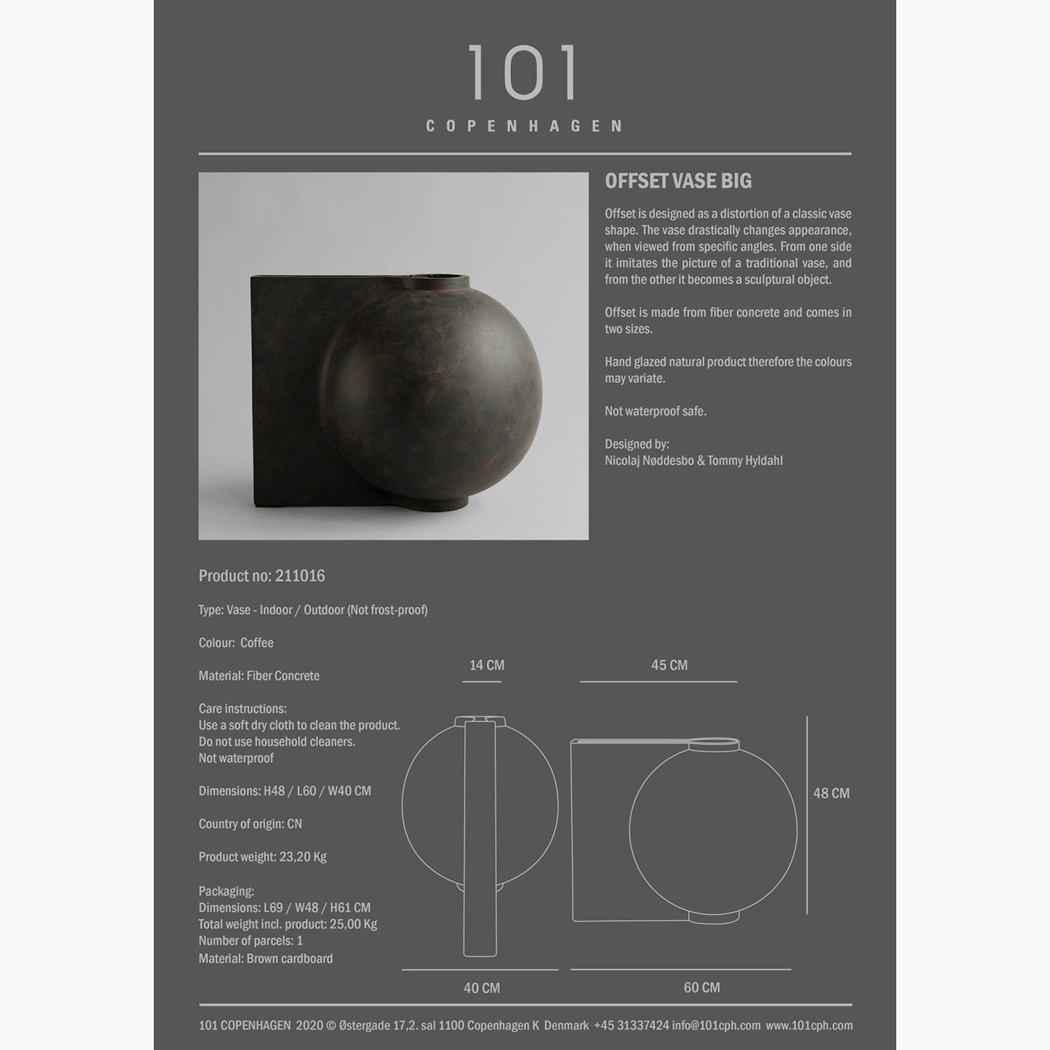 Offset is made from fiber concrete and comes in two sizes. Hand glazed natural product therefore the colors may variate. Not waterproof safe.