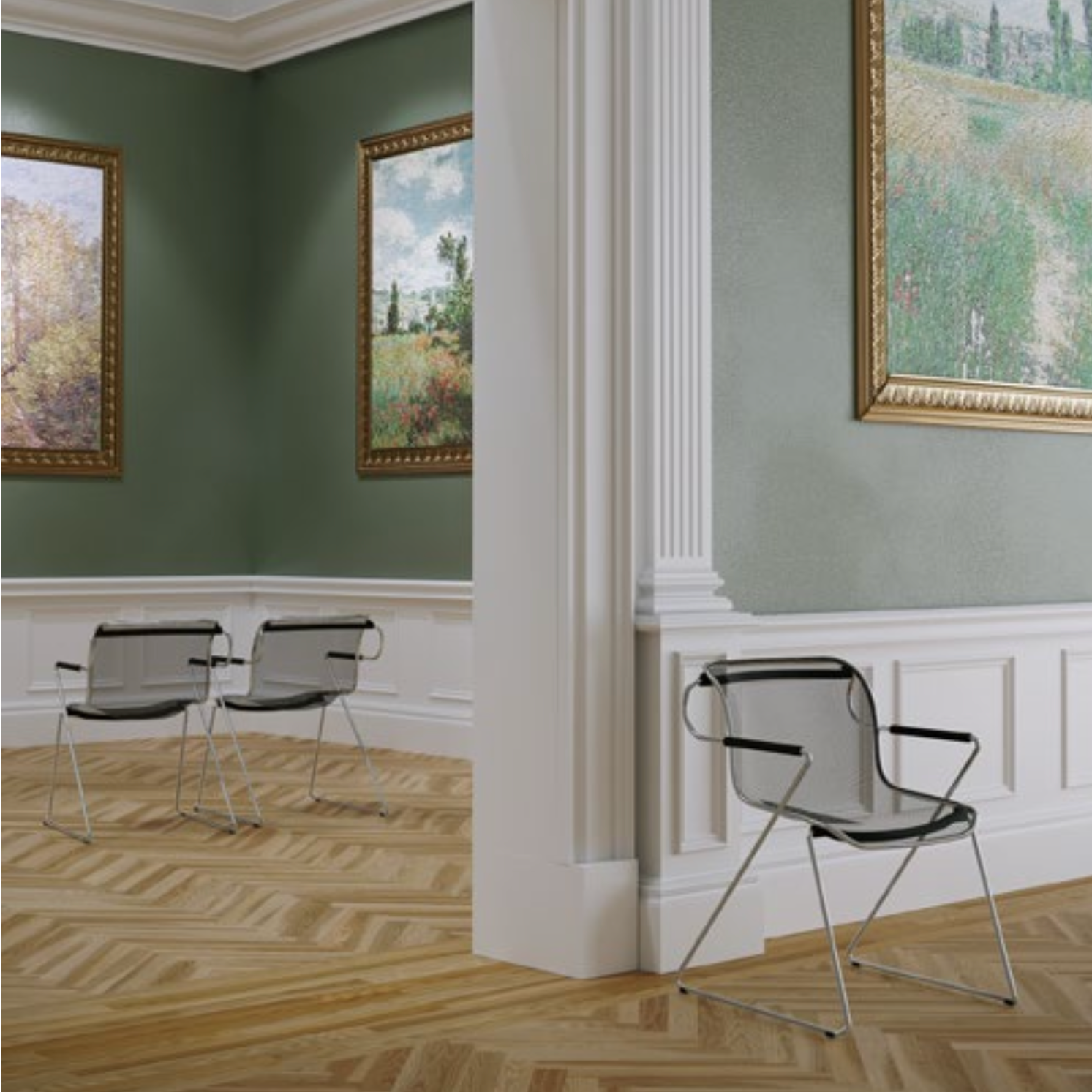 Designed by Charles Pollock and produced by Anonima Castelli in the 1980s; it has a tubular chrome metal structure featuring a black lacquered metal mesh shell, the armrests are padded with foam.