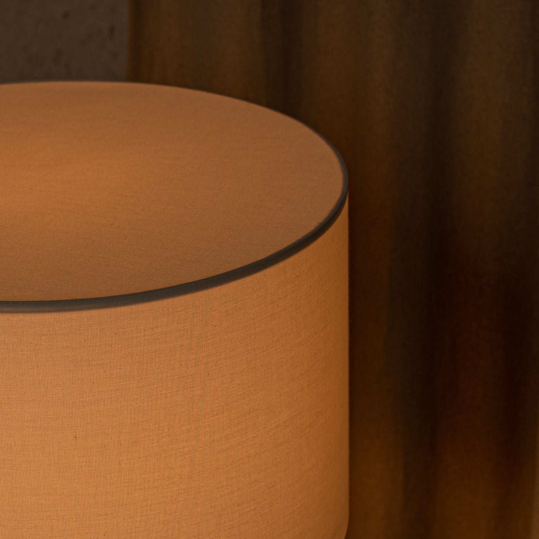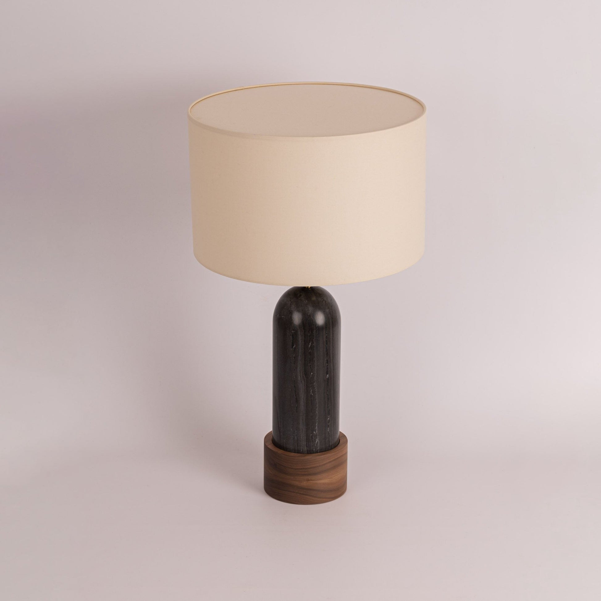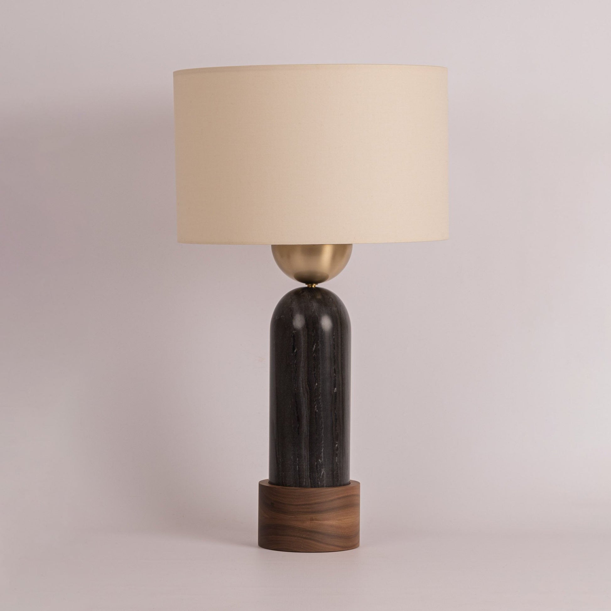 An elevated and elegant association of spherical lines to create a unique shape. Playing with materials and geometries to create contrast, the Peona table lamp merges perfectly in a modern or classical interior. Association of alabaster, marble or wood with an unique cotton drum lampshade laying on top of a solid brass halsphere. The bottom coaster is removable.