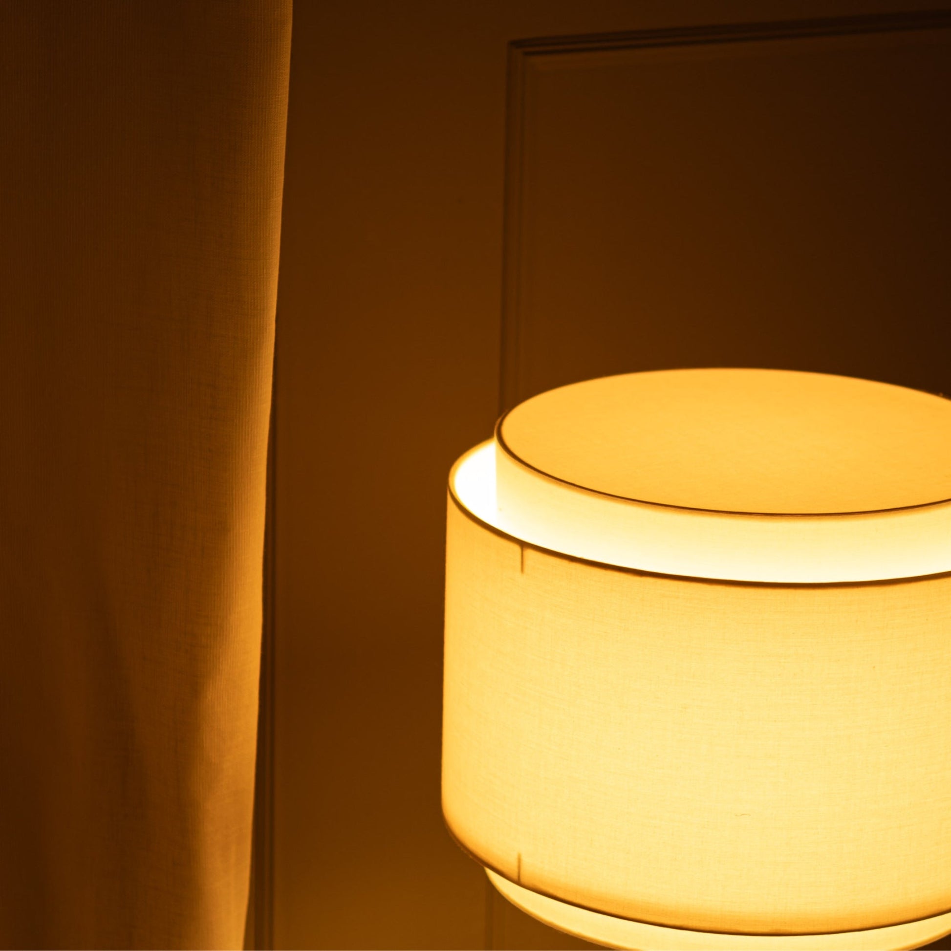An unique lampshade where circular geometries, materials, and superpositions merge to difuse a soft light, sitting on the edge of a marble cylinder.