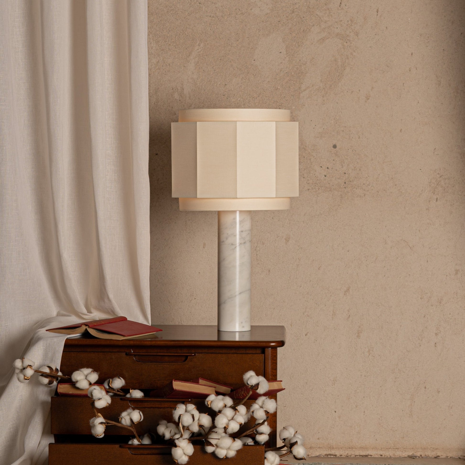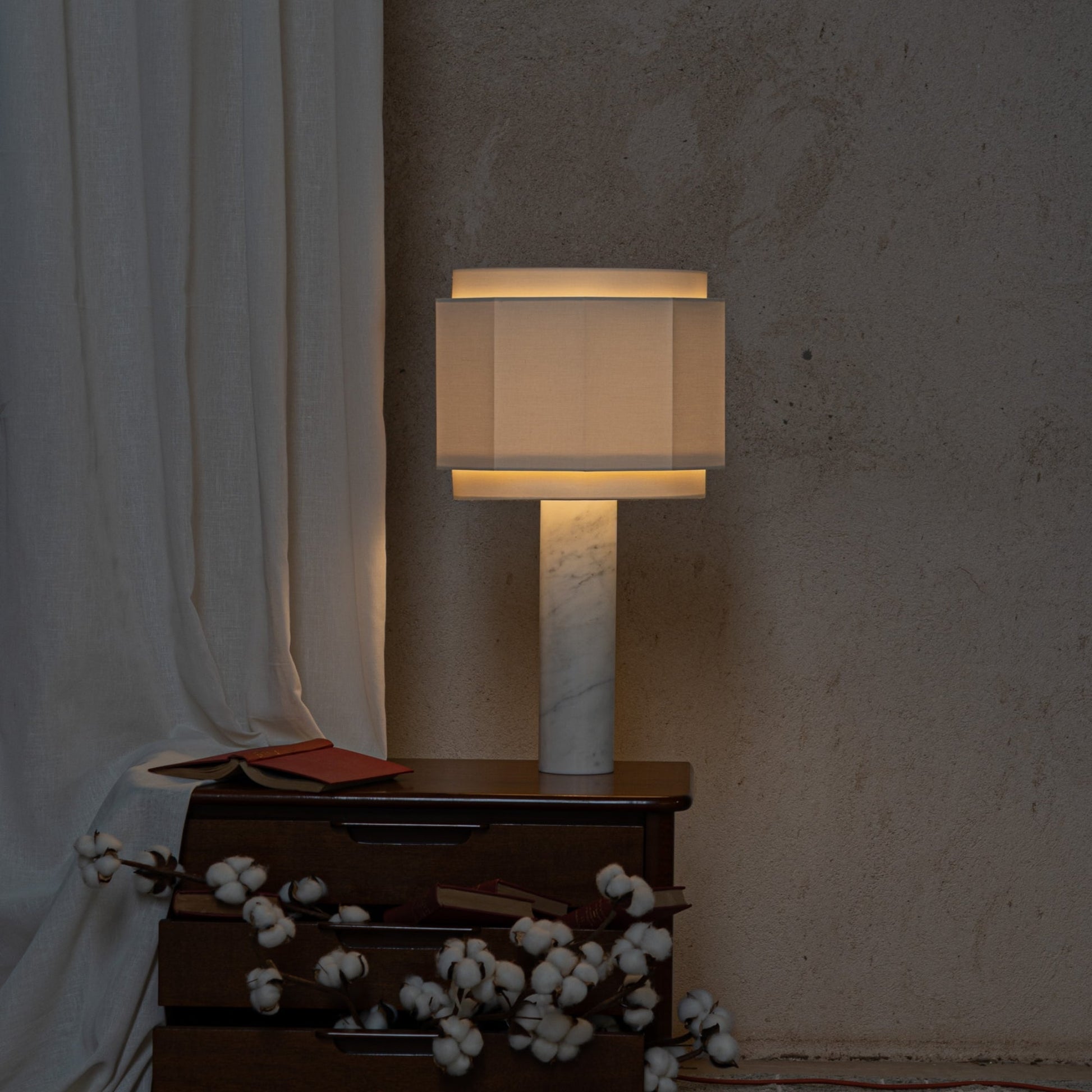 An unique lampshade where circular geometries, materials and superpositions merge to difuse a soft light, sitting on the edge of a marble or wooden cylinder.