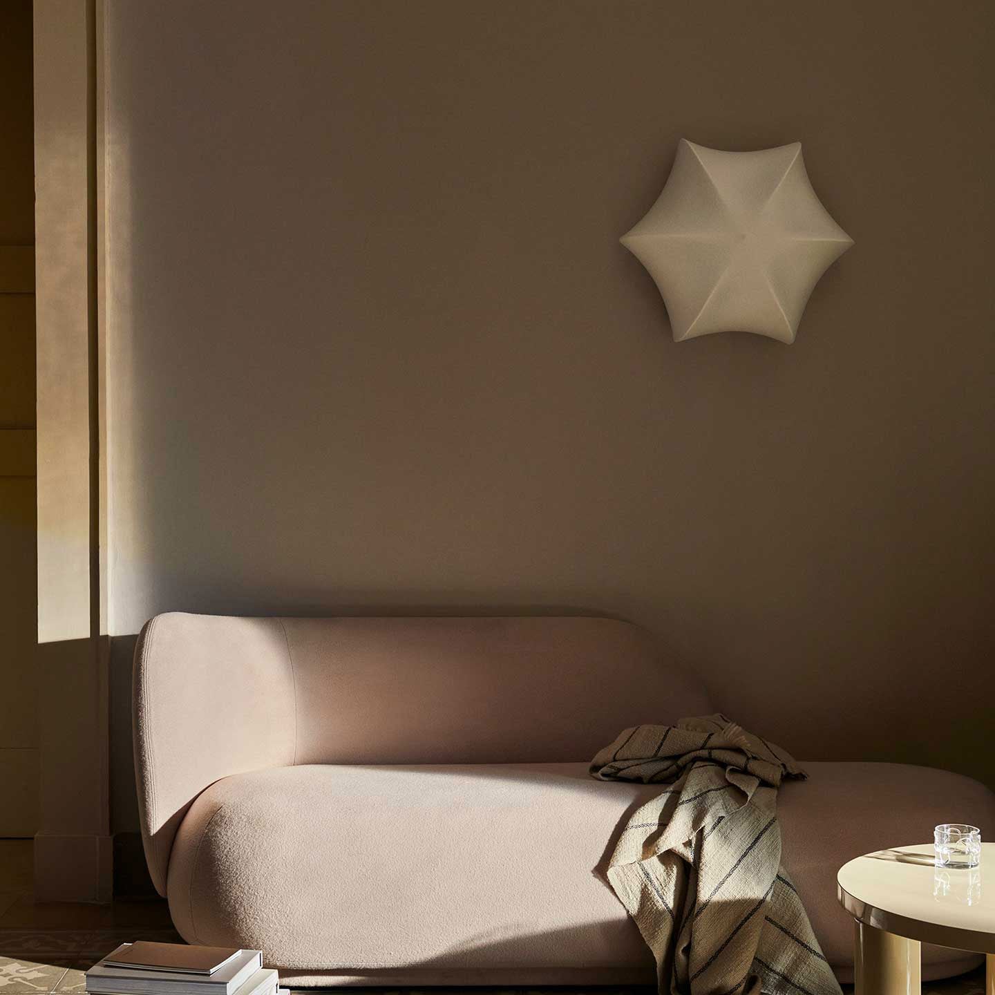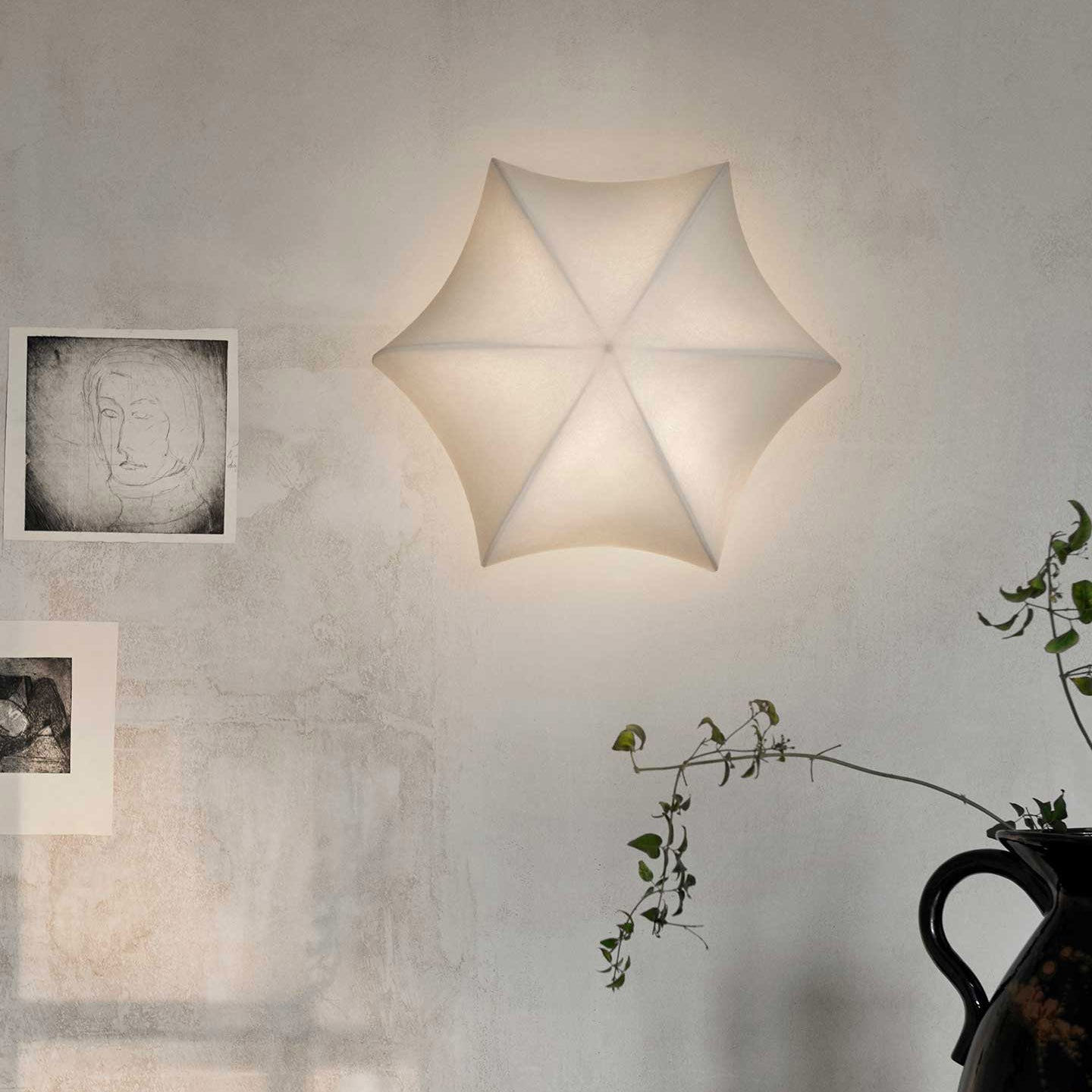Drawing inspiration from the opulent details found in Baroque art and architecture, the Poem Wall/Ceiling Lamp has a romantic and elegant expression. Made through an intricate process where liquid tissue is sprayed over the lamp's inner steel structure, the result is a translucent shade that artfully stretches over intricate arches, ensuring that the lamp emits a soft, diffused light while resembling a delicate flower.