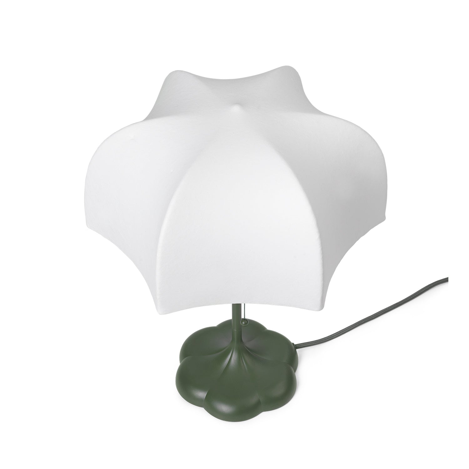 Drawing inspiration from the opulent details found in Baroque art and architecture, the Poem Table Lamp has a romantic and elegant expression. Made through an intricate process where liquid tissue is sprayed over the lamp's casted aluminium base, the result is a translucent shade that artfully stretches over intricate steel arches, ensuring that the lamp emits a soft, diffused light while resembling a delicate flower.