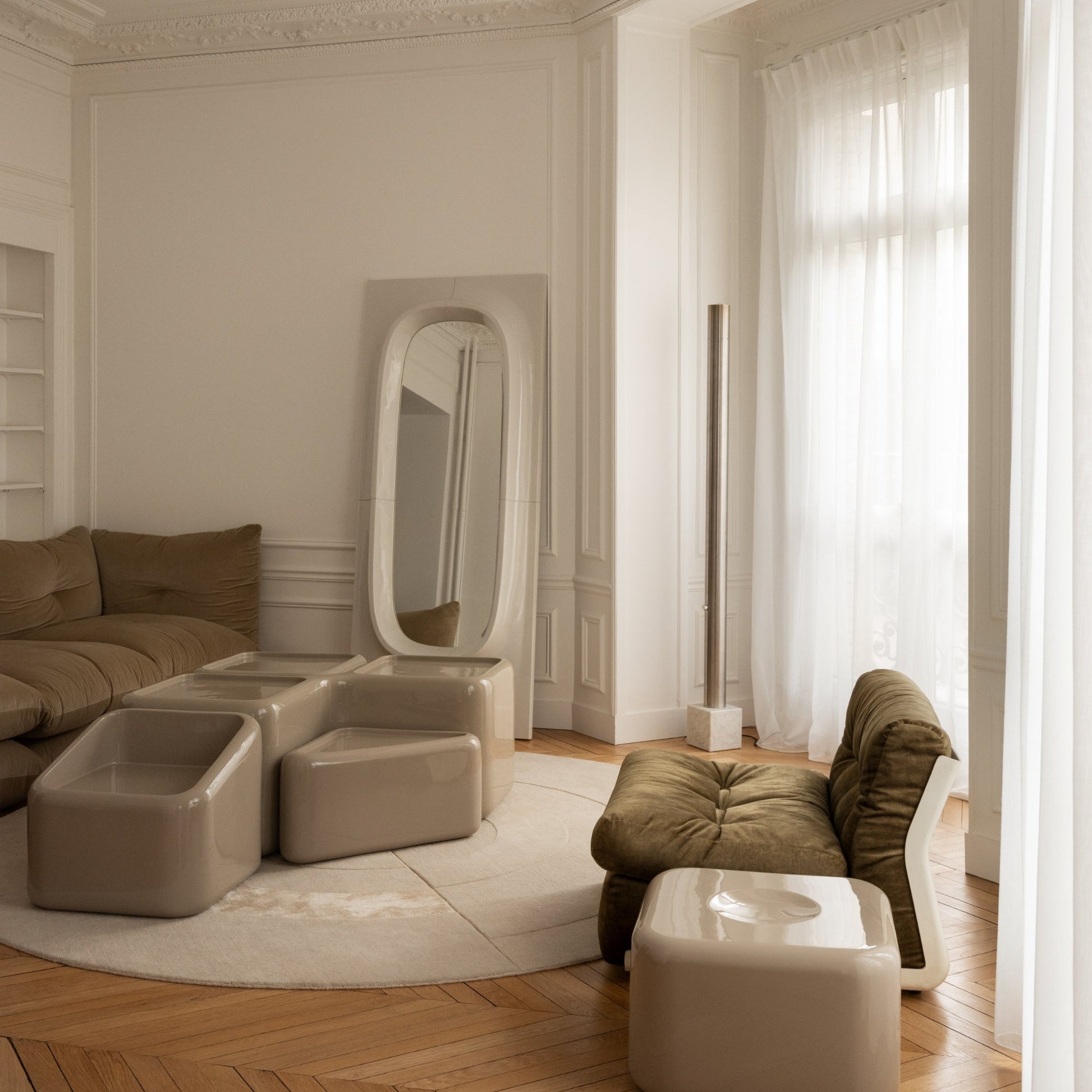 The Porthole Mirrors are designed by Willo Perron for NO GA Projects. The collection is based on the idea of modularity and features two mirrors in different sizes that can be combined in various configurations. The mirrors work equally well as standalone pieces or arranged together to cover a larger surface. The entire production process is done by hand, requiring a high level of craftsmanship for each piece.